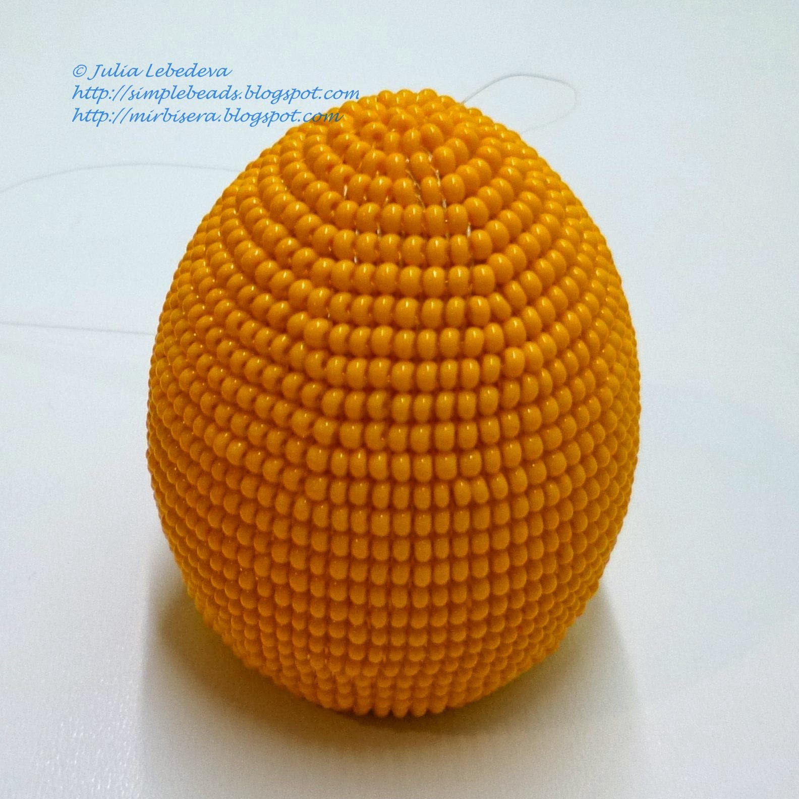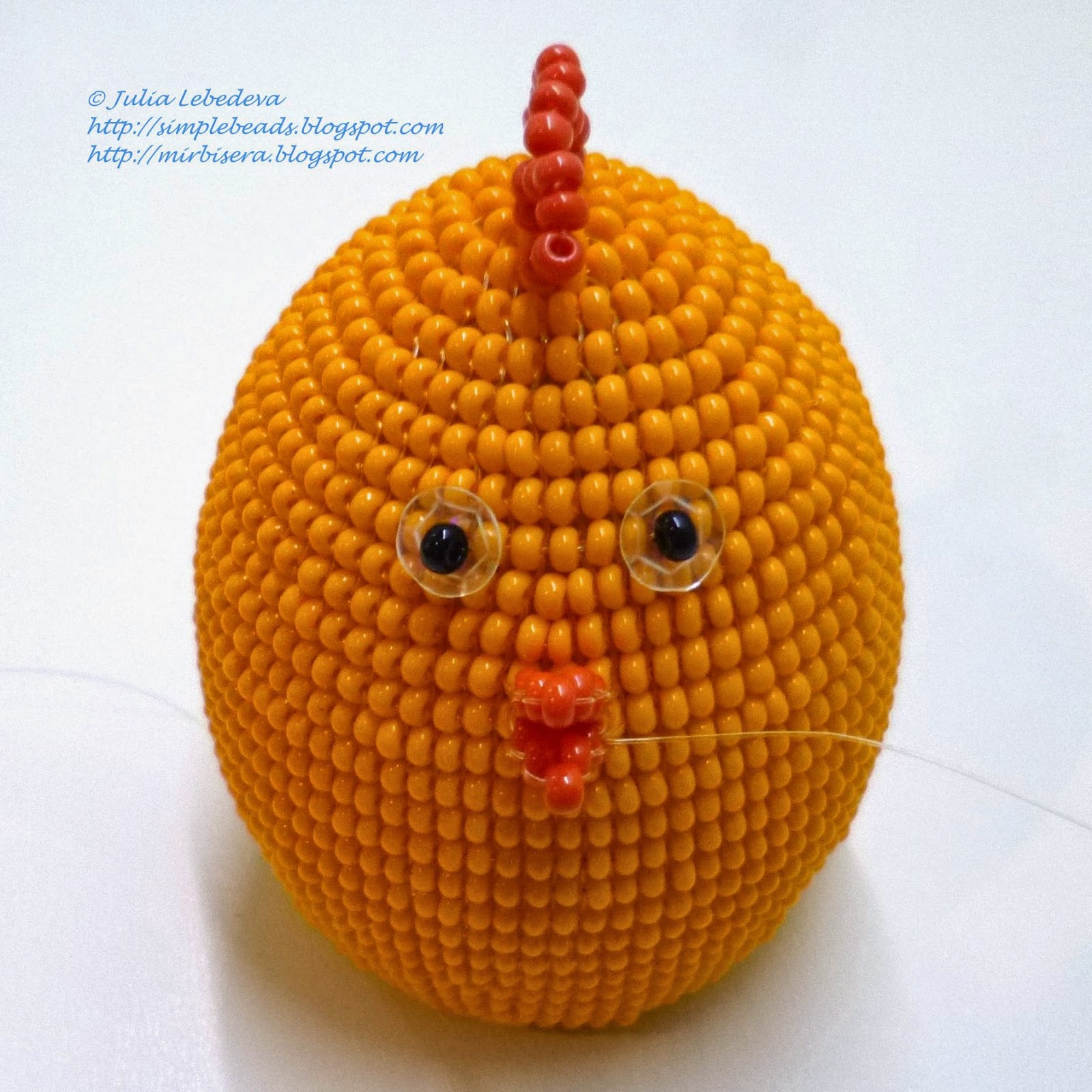 вот этим мастер-классом. Отмечу, что для оплетения (то есть для туловища цыплёнка) я использовала бисер размера № 10. Поскольку это довольно мелкий бисер, оплетение им мячика представляет собой довольно трудоёмкий процесс. Так что если Вы не слишком уверены в том, что справитесь с ним, для упрощения задачи можно использовать для оплетения более крупный бисер, например, размера № 8.