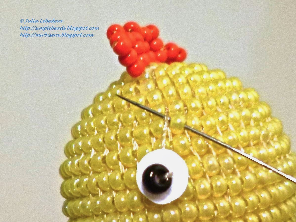 Далее пропускаем иглу с обратной стороны через ту самую жёлтую бисеринку, из которой сейчас выходит нить на макушке цыплёнка,