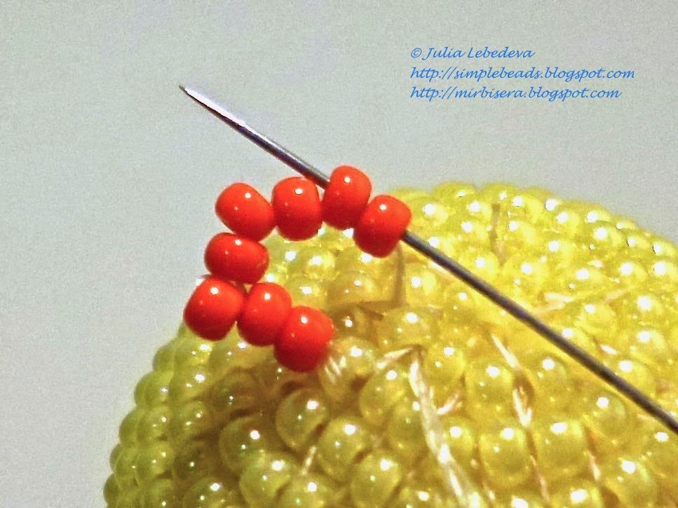 после чего опять пропускаем иглу снизу вверх через две ближайшие красные бисеринки.