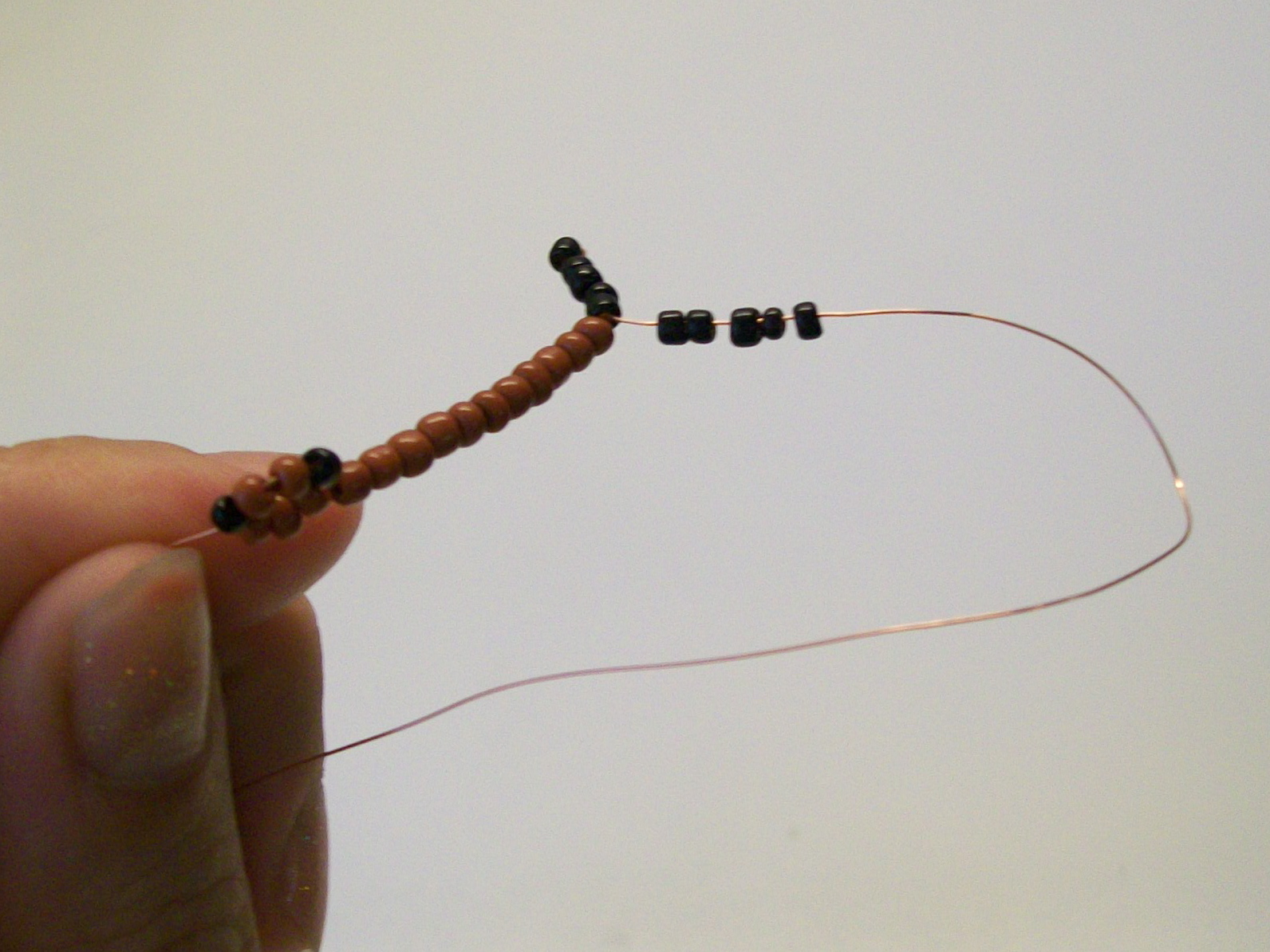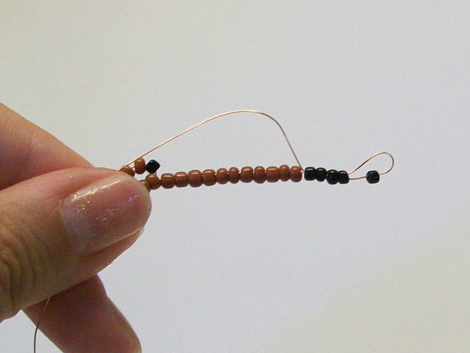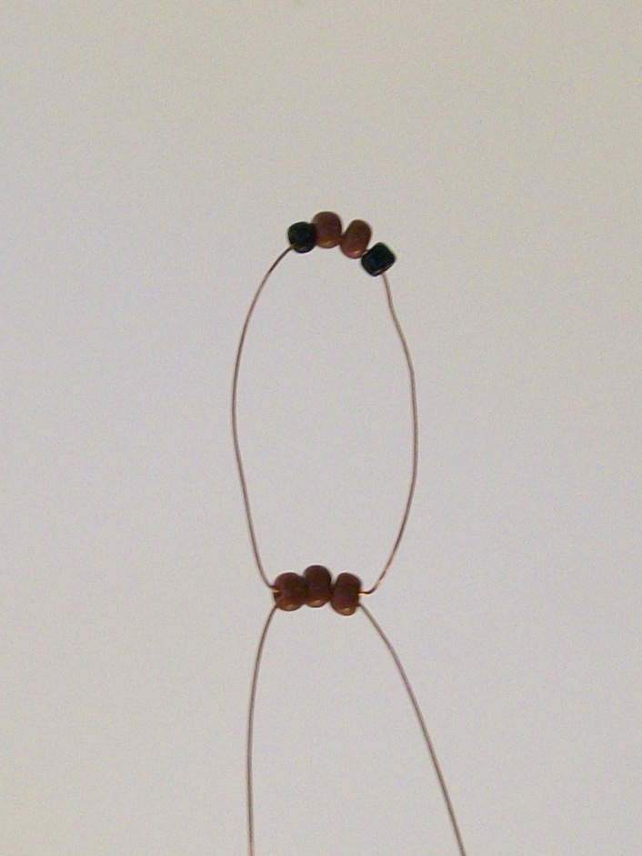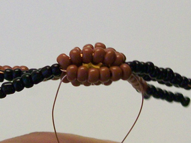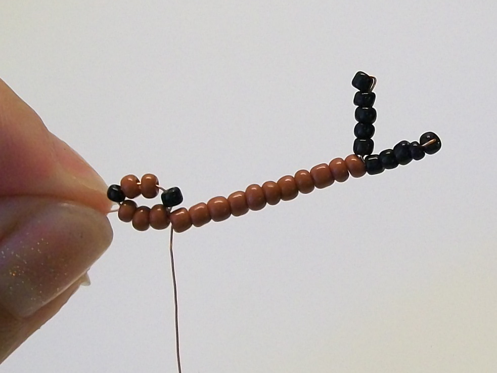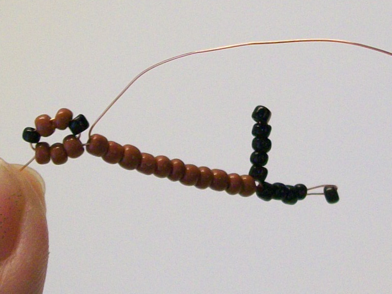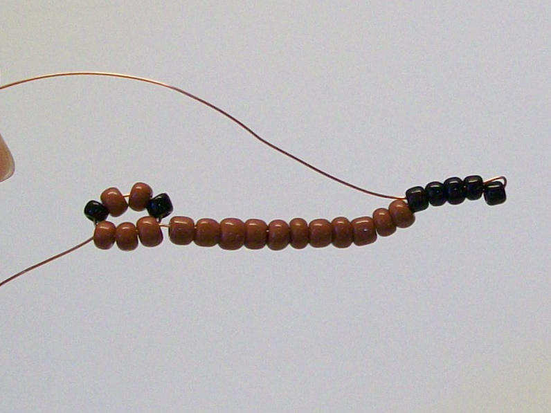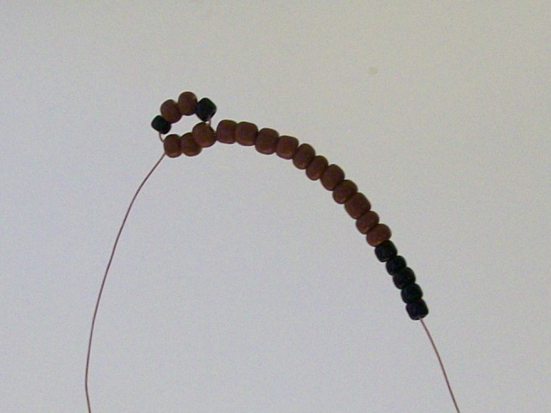 после чего, придерживая последнюю набранную бисеринку, пропускаем проволоку в обратном направлении через 4 чёрные бисеринки и затем - через 11 коричневых бисеринок.
