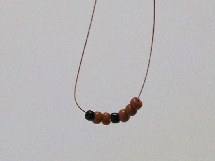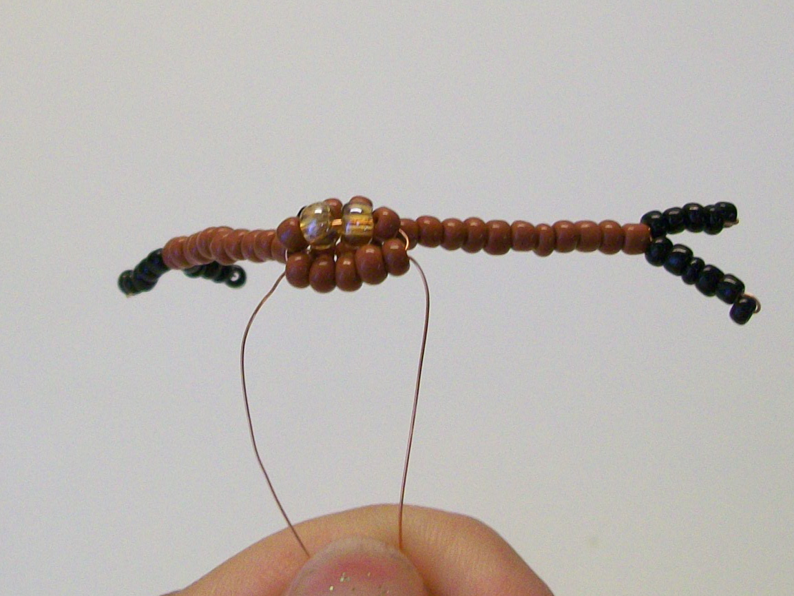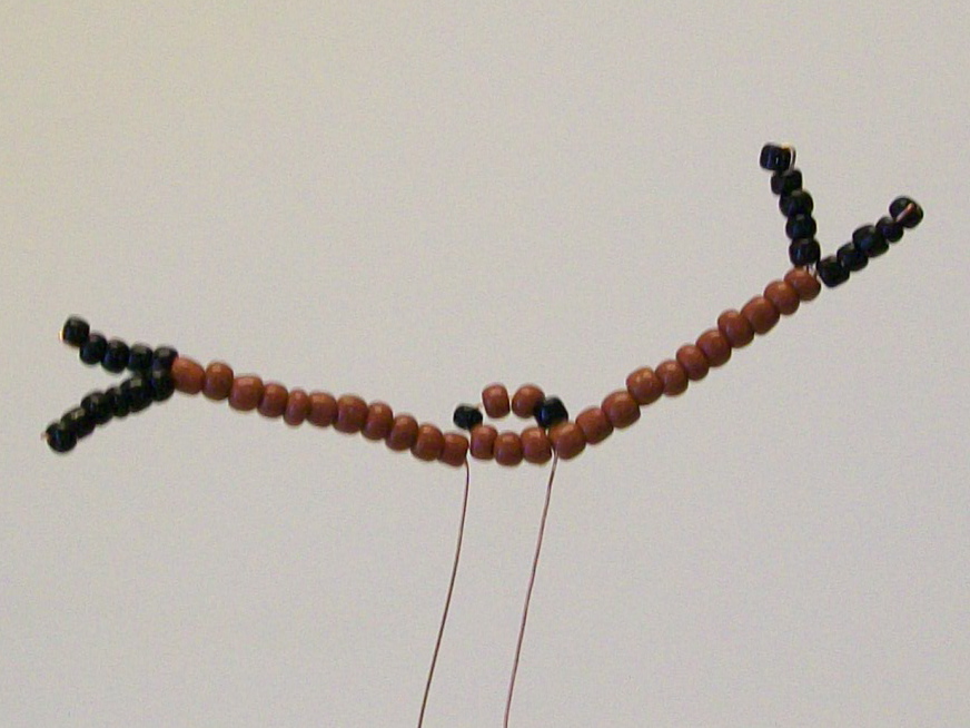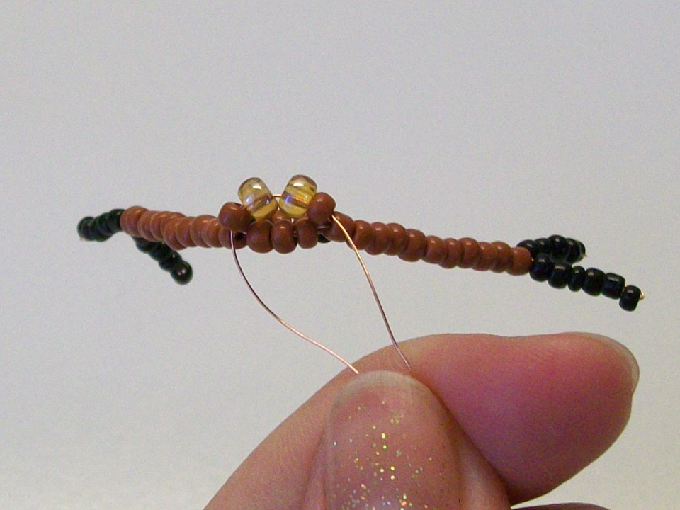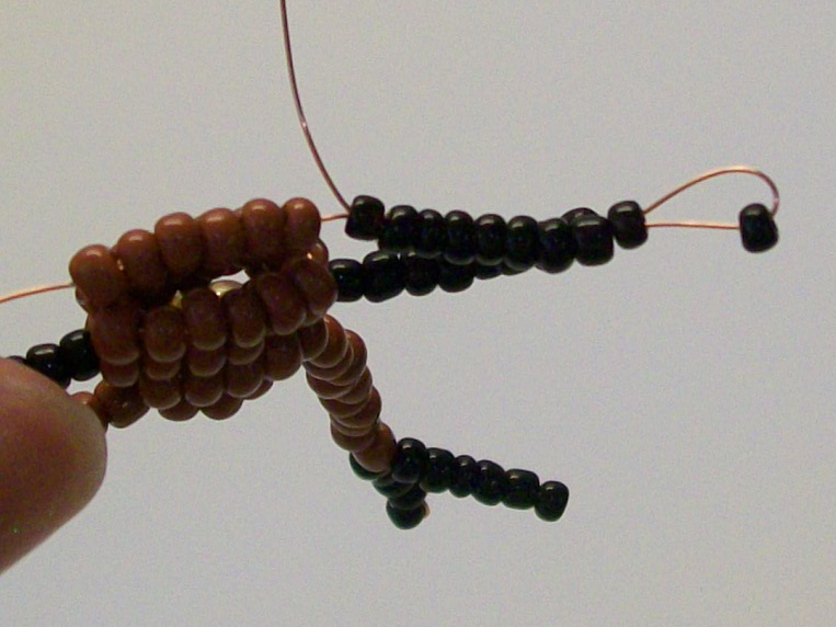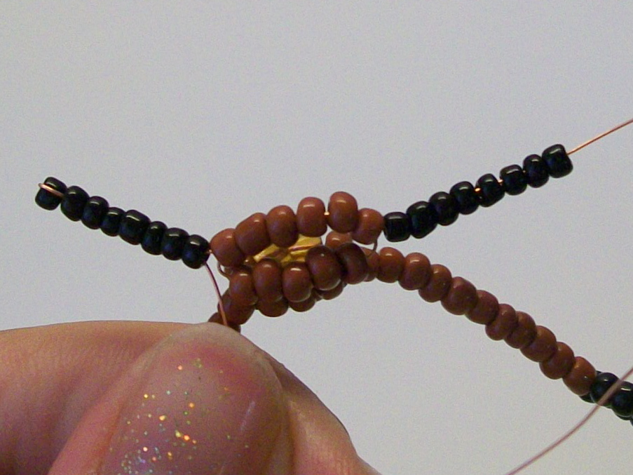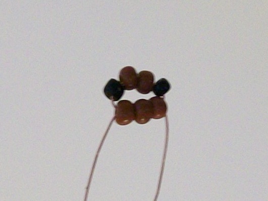 после чего, придерживая последнюю набранную бисеринку, пропускаем проволоку в обратном направлении через 4 чёрные бисеринки и затем - через 11 коричневых бисеринок.