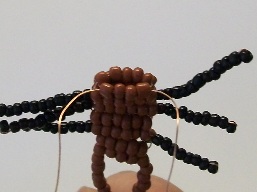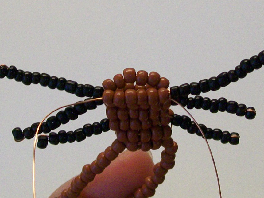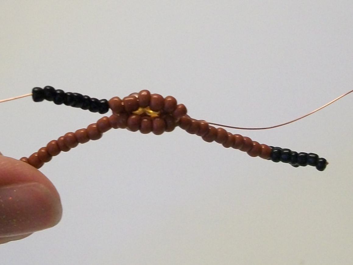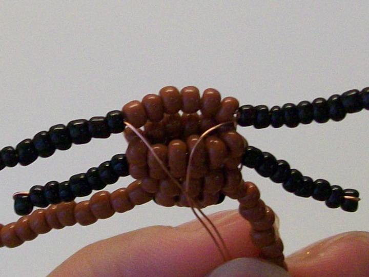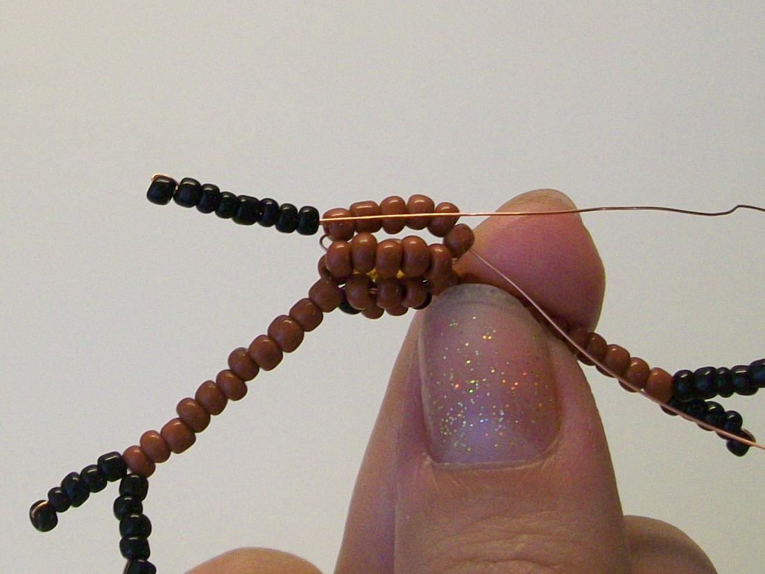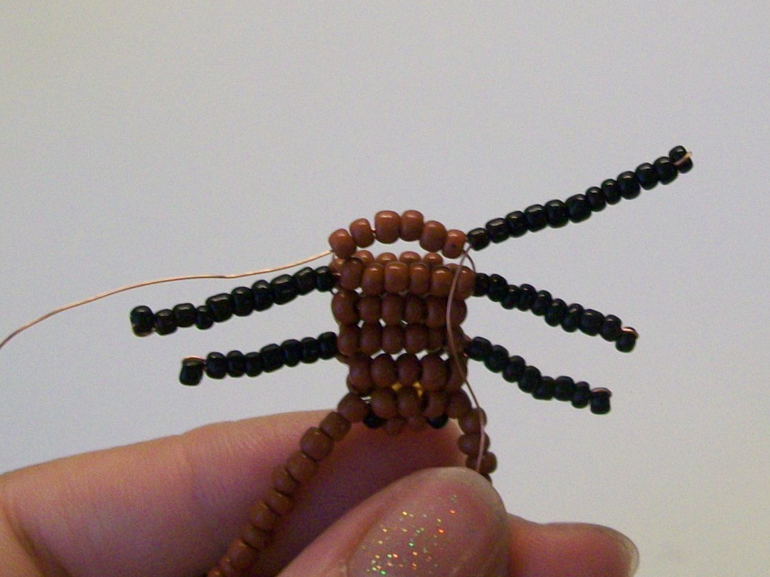 5 ряд - похож на 3-й. Сначала делаем верхний ярус из 6 коричневых бисеринок, затем плетем лапки - из 10 чёрных бисеринок каждую, затем делаем нижний ярус из 6 коричневых бисеринок.