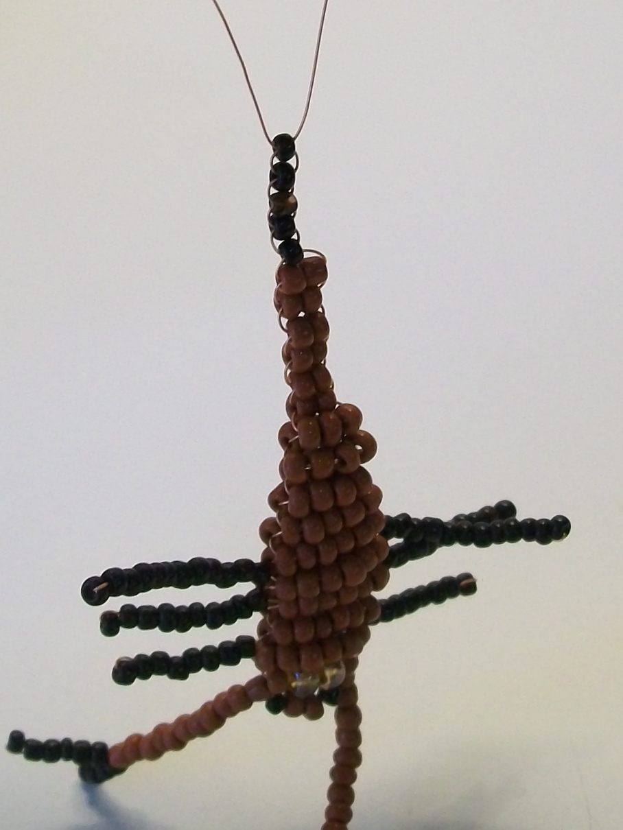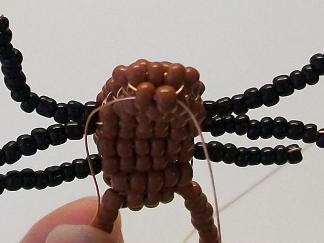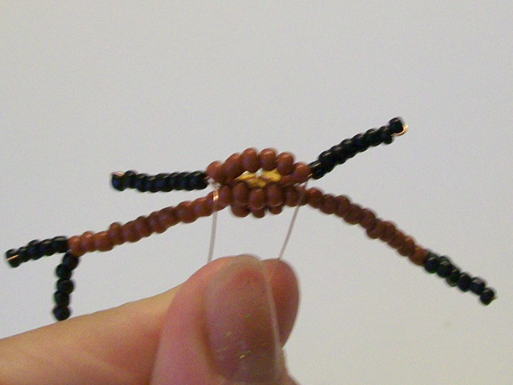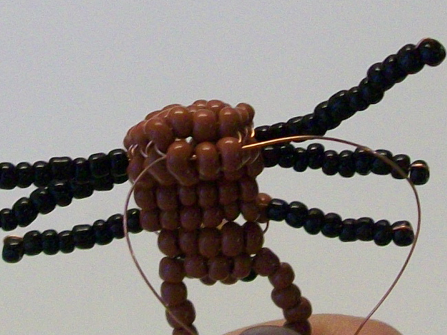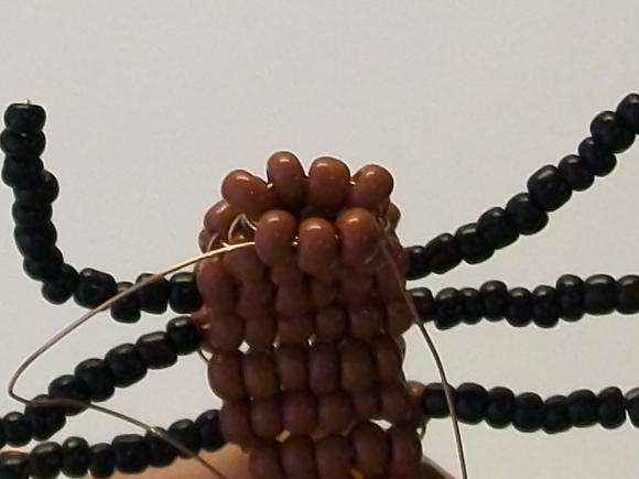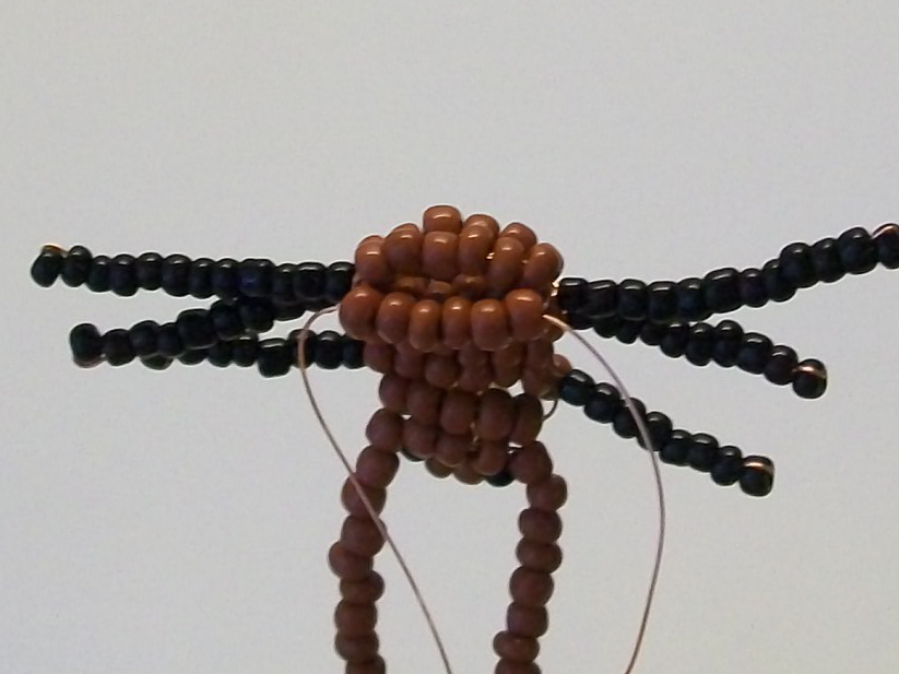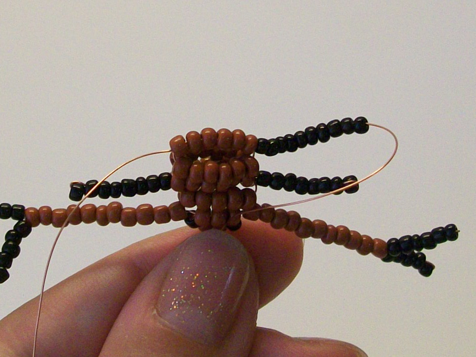 5 ряд - похож на 3-й. Сначала делаем верхний ярус из 6 коричневых бисеринок, затем плетем лапки - из 10 чёрных бисеринок каждую, затем делаем нижний ярус из 6 коричневых бисеринок.