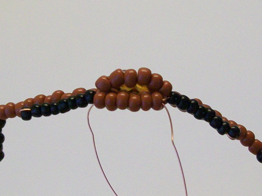 Сначала делаем верхний ярус. Набираем на один конец проволоки бисеринки в следующей последовательности: 1 коричневую, 2 жёлтые, 1 коричневую, после чего другой конец проволоки пропускаем через все только что набранные бисеринки. Сгибаем проволоку таким образом, чтобы бисеринки легли параллельно верхнему ярусу предыдущего ряда.