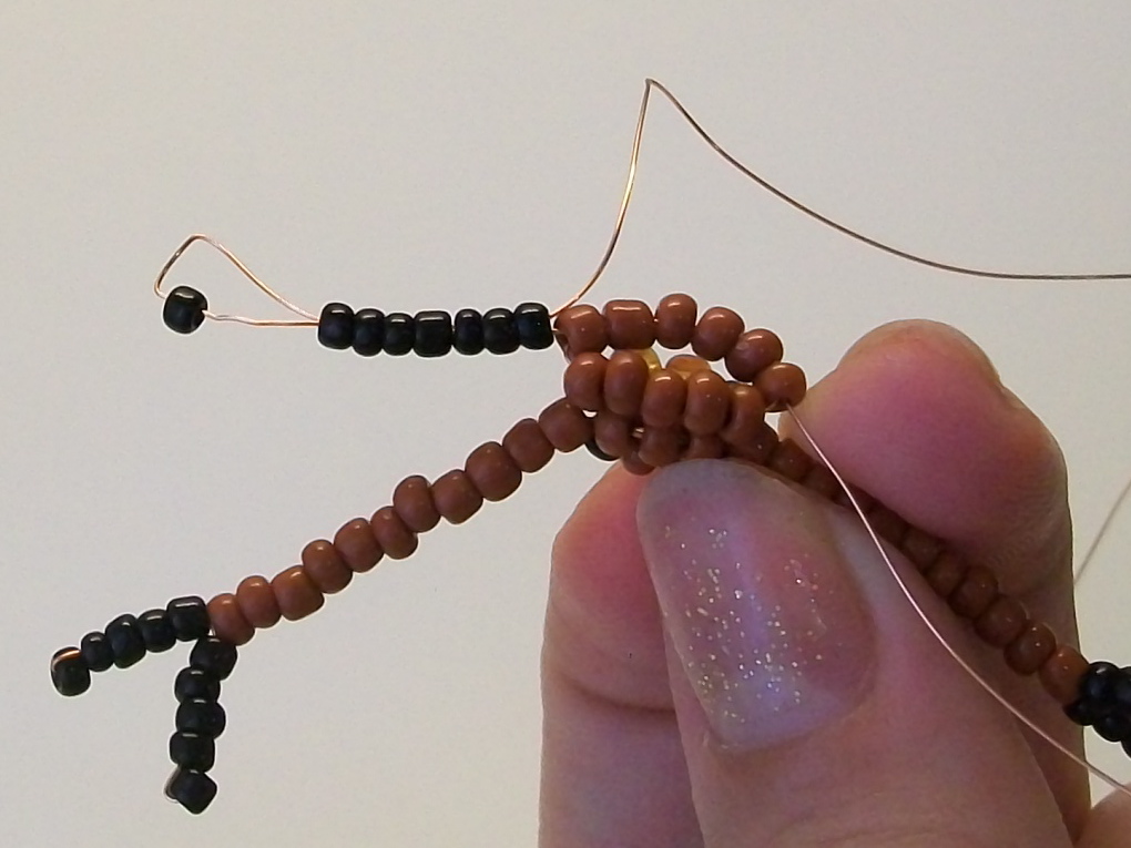 Далее плетём хвост, используя технику обычного параллельного плетения (располагаем все ряды друг за другом). Сначала плетём 5 рядов по 2 коричневые бисеринки в каждом, затем - ещё 5 рядов по 1 чёрной бисеринке в каждом ряду.