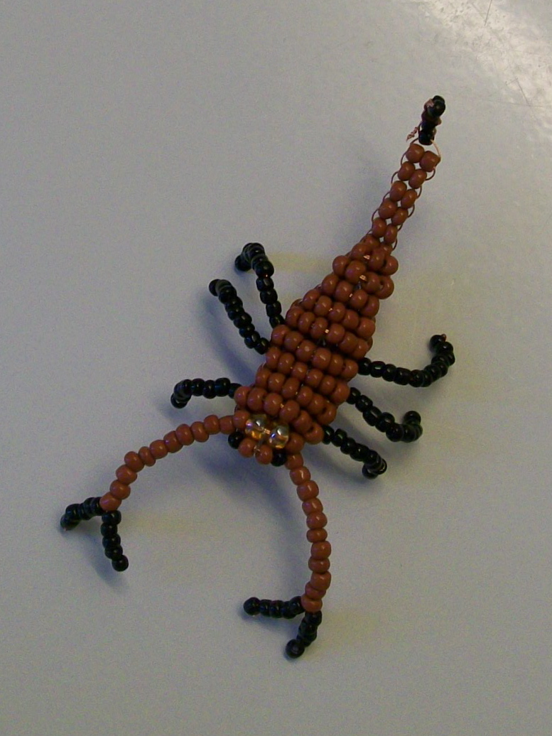 Скорпиона плетём на проволоке длиной 150 см, используя технику объёмного плетения. Верхние ярусы бисеринок будут образовывать спинку скорпиона, а нижние ярусы бисеринок - его живот.