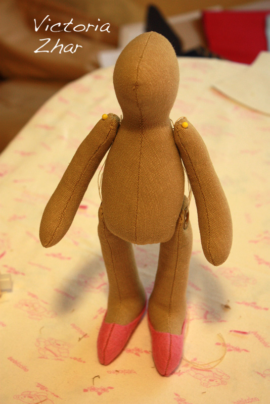 согласно Марининому МК верхние лапы-руки крепятся окончательно в момент одевания куклы. здесь я их приколола булавками на время