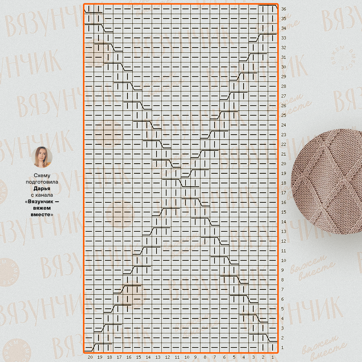 Раппорт узора — 20 петель и 36 рядов. На схеме и лицевые, и изнаночные ряды при вязании по кругу, центральный раппорт.