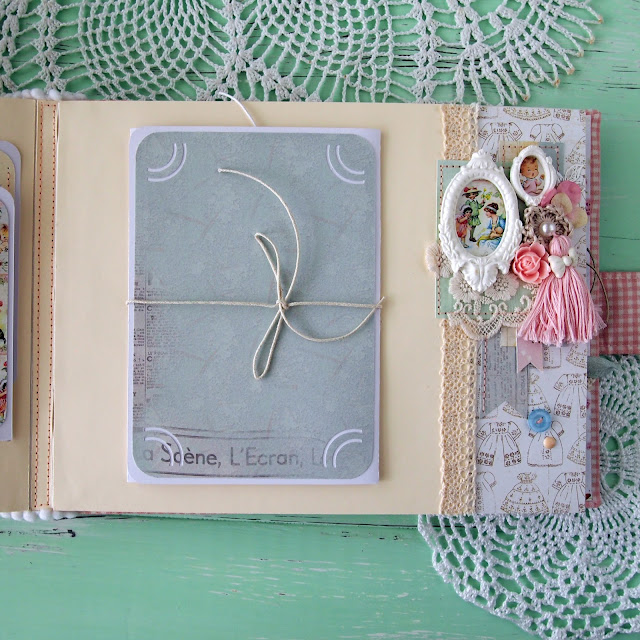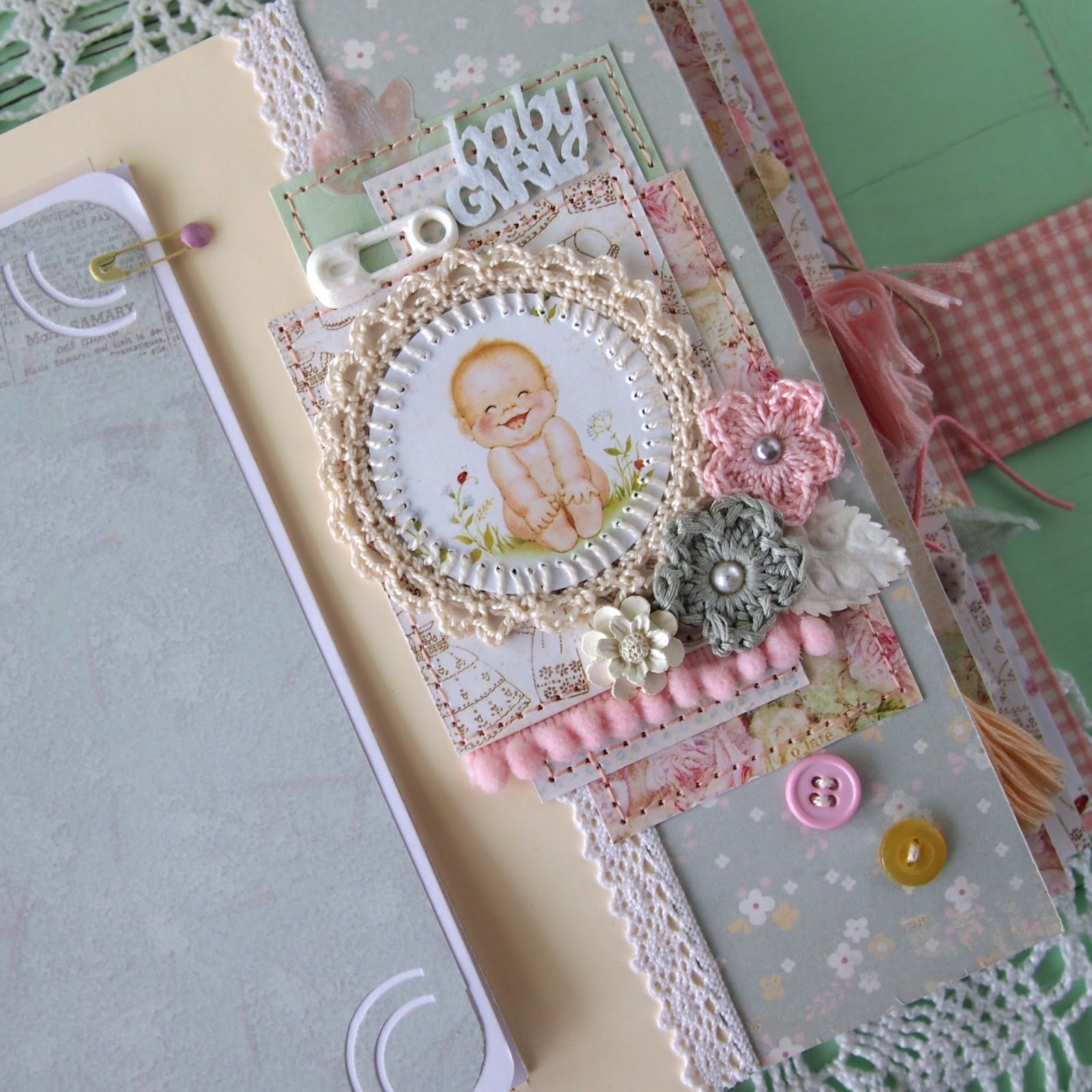 Чтобы поддержать и дополнить всю нежность и уютность этой бумаги , я использовала очень много украшений, созданных своими руками. Это рюши из фатина, вязаные цветы, пинетки, обвязанные картинки (вырезанные из листов бумаги), обтянутые тканью пуговки, кисточки из ниток, тканевые цветы и т.д.