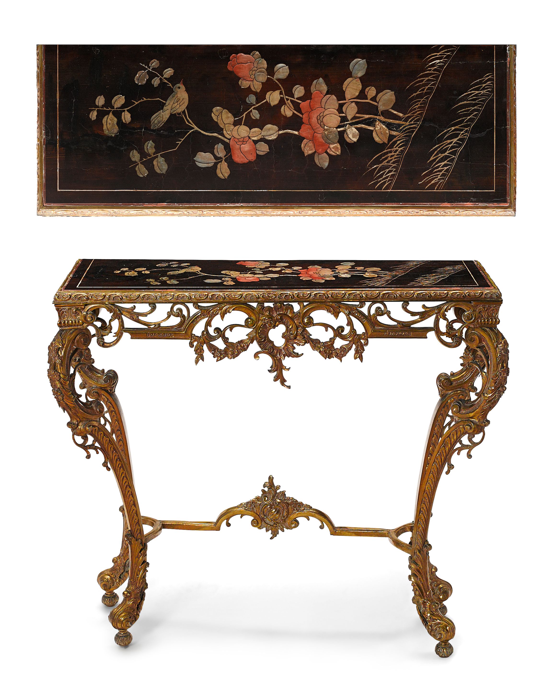 A Rococo style gilt bronze and Chinese calamander console