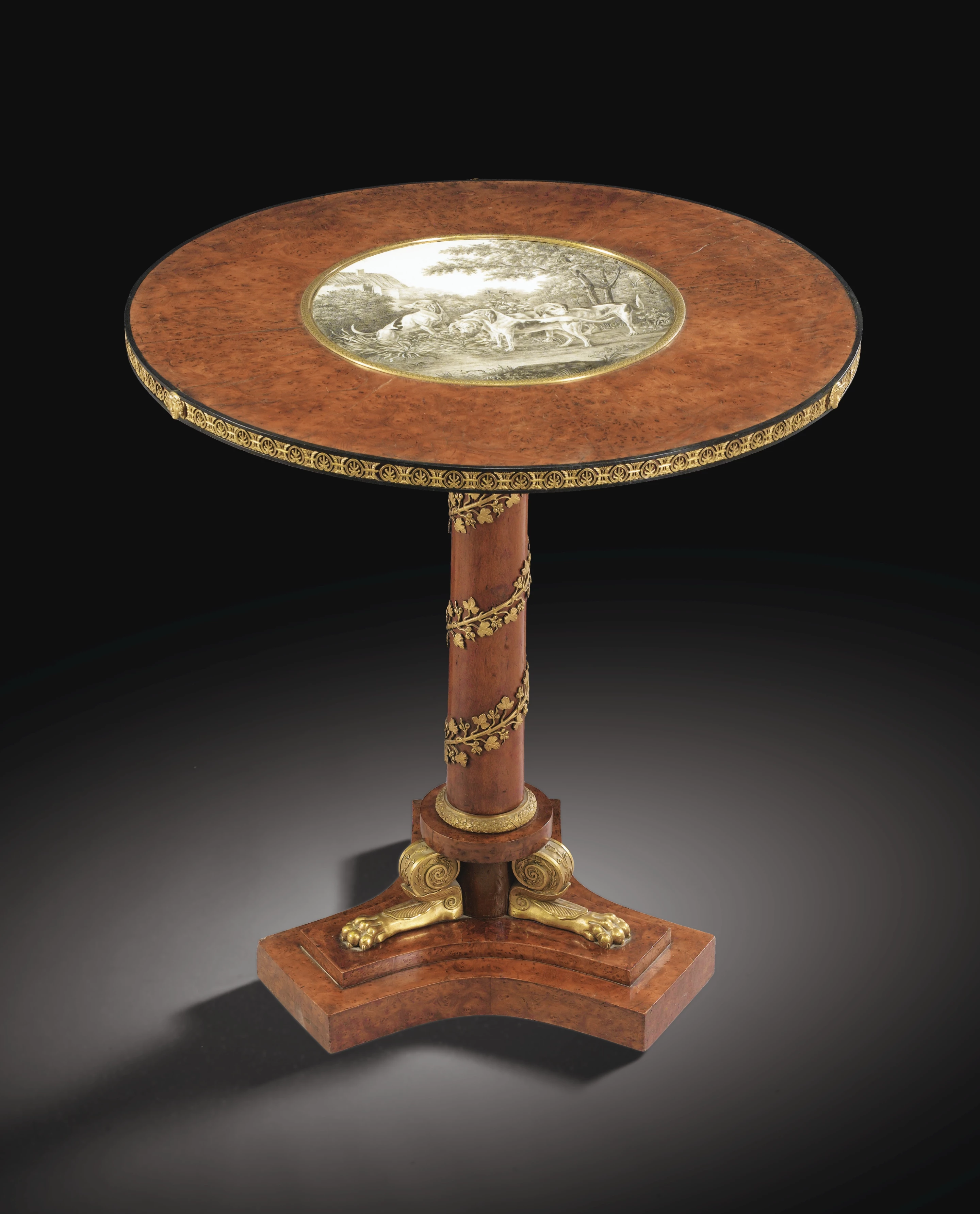 Rare guéridon en placage de loupe d'orme, orme et porcelaine de Paris d'époque Empire