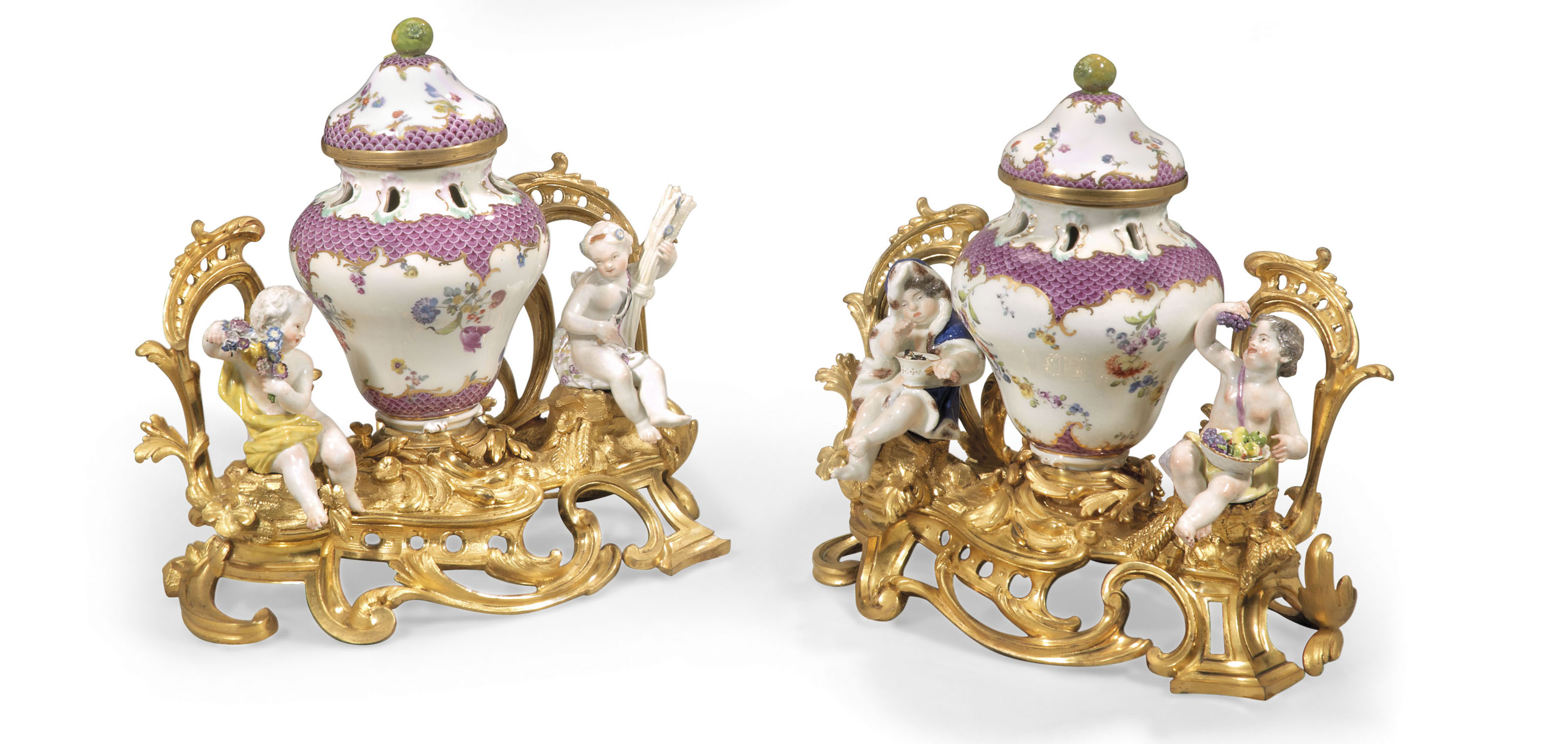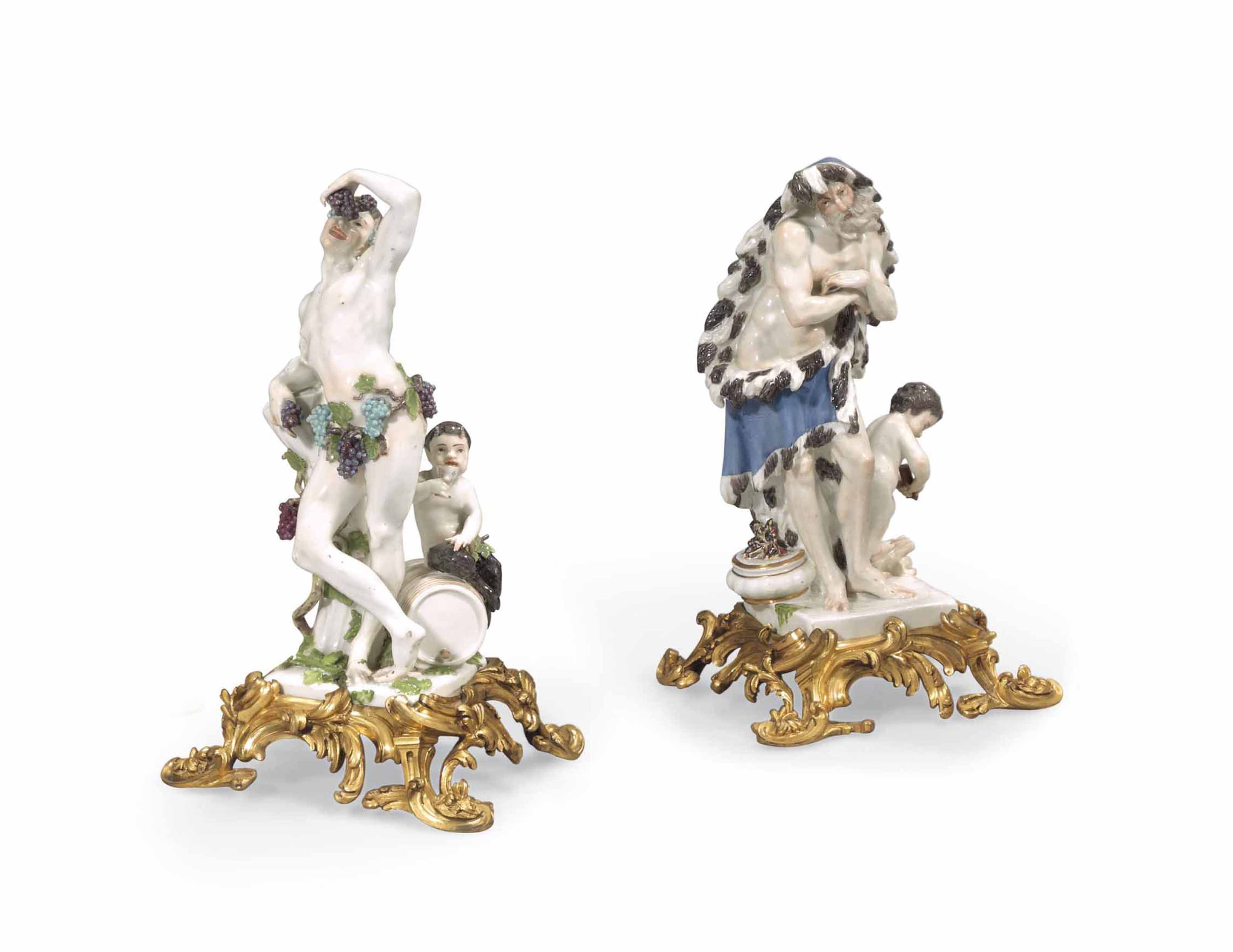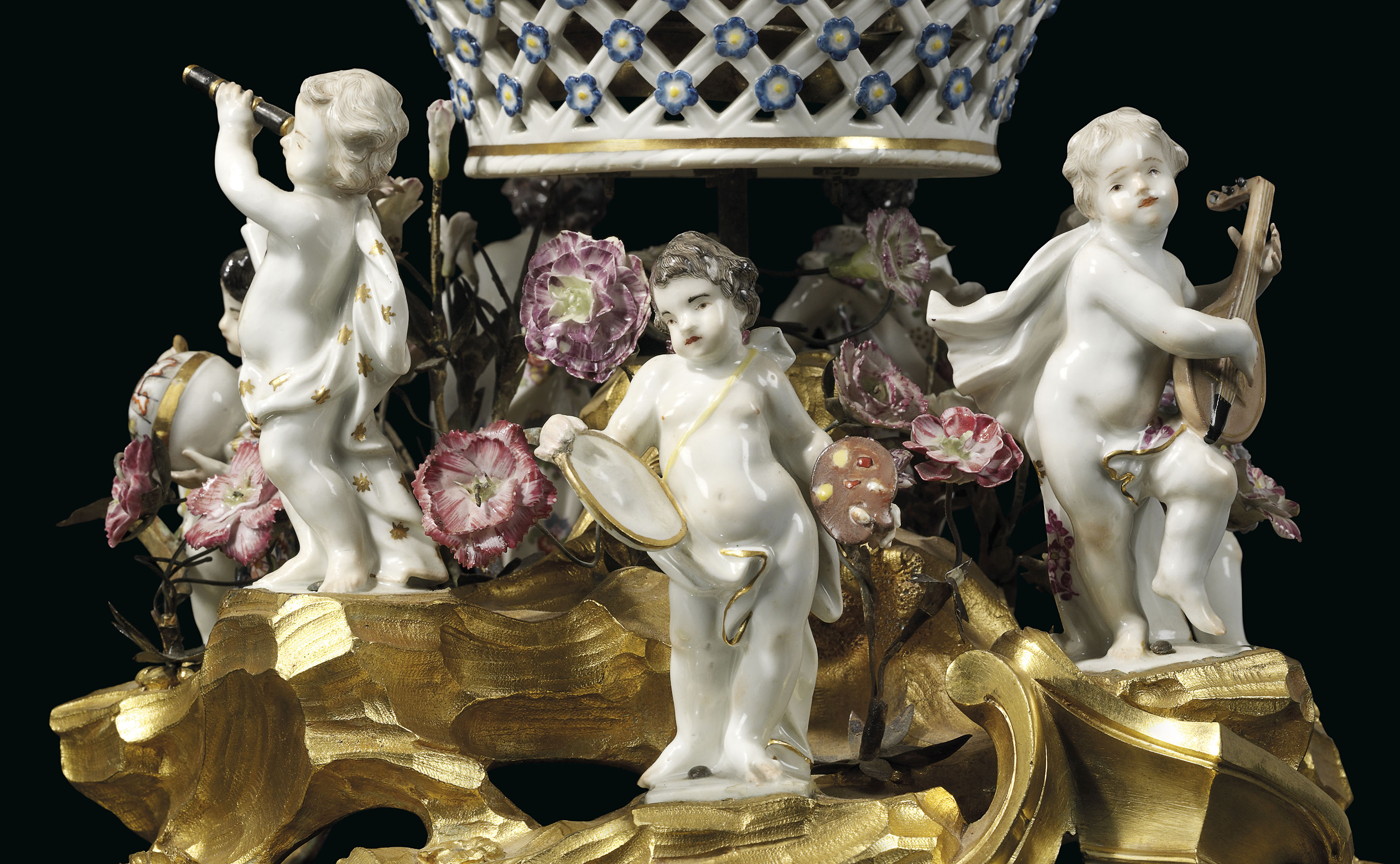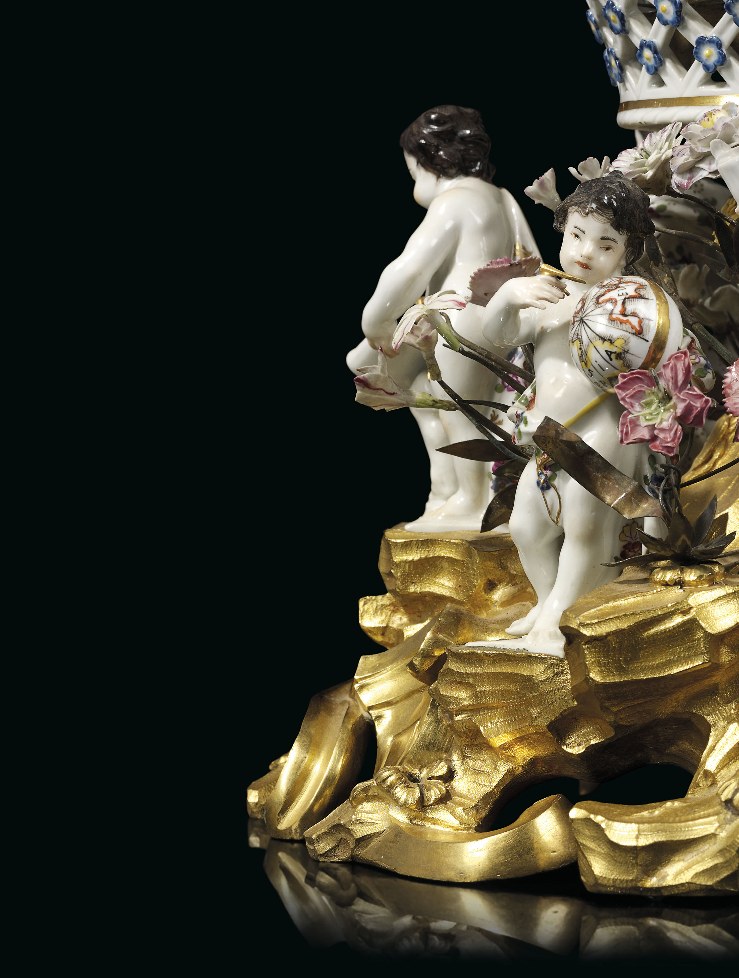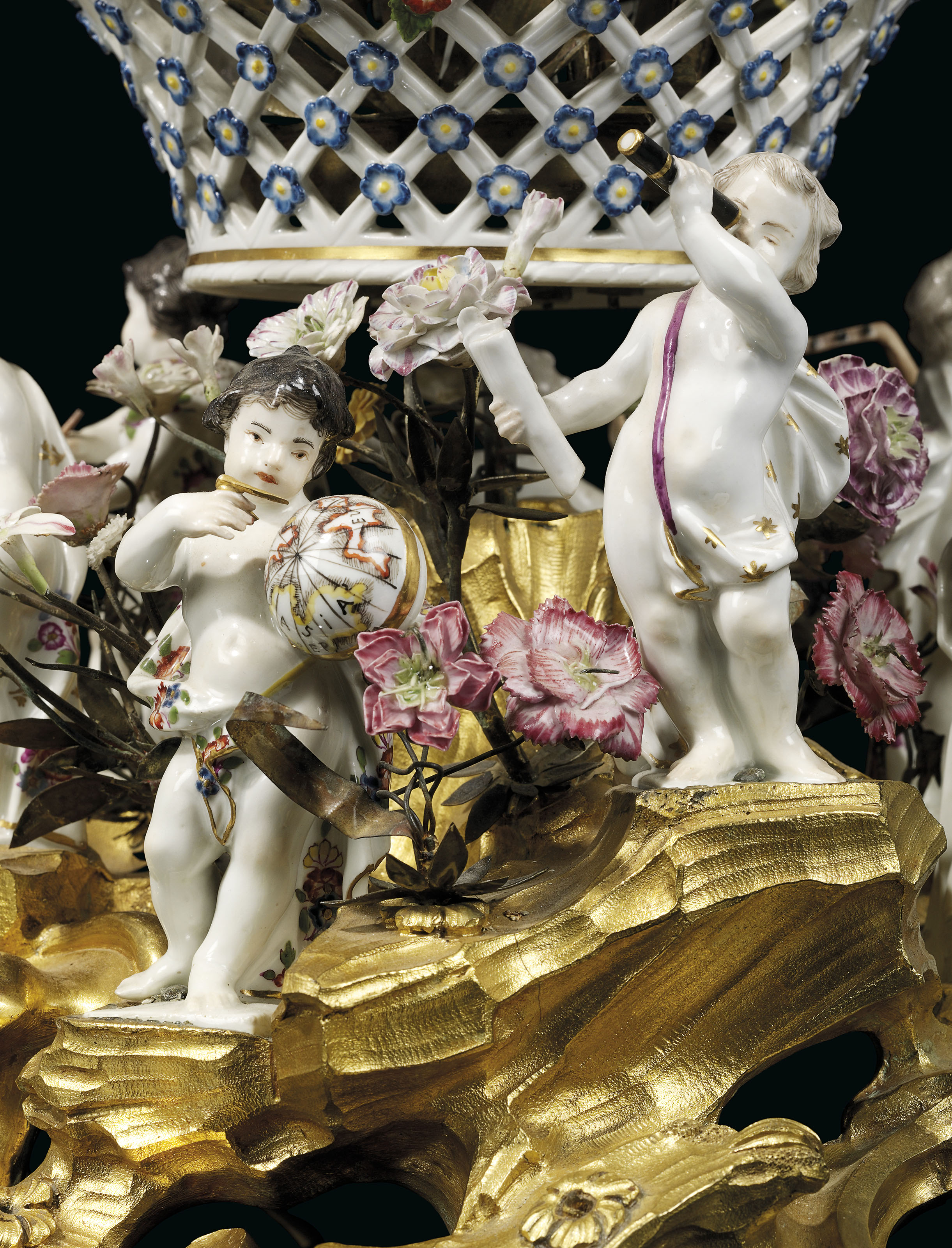 Íàáîð èç ÷åòûðåõ ìåéñåíñêèõ ãðóïï àëëåãîðè÷åñêèõ ôèãóð, ïðåäñòàâëÿþùèõ ÷åòûðå âðåìåíè ãîäà, íà ïîçîëî÷åííûõ áðîíçîâûõ òðåõñâåòíûõ êàíäåëÿáðàõ, ôàðôîð îêîëî 1755-60 ãîäîâ, ìîíòèðîâêè êîíöà 19 âåêà