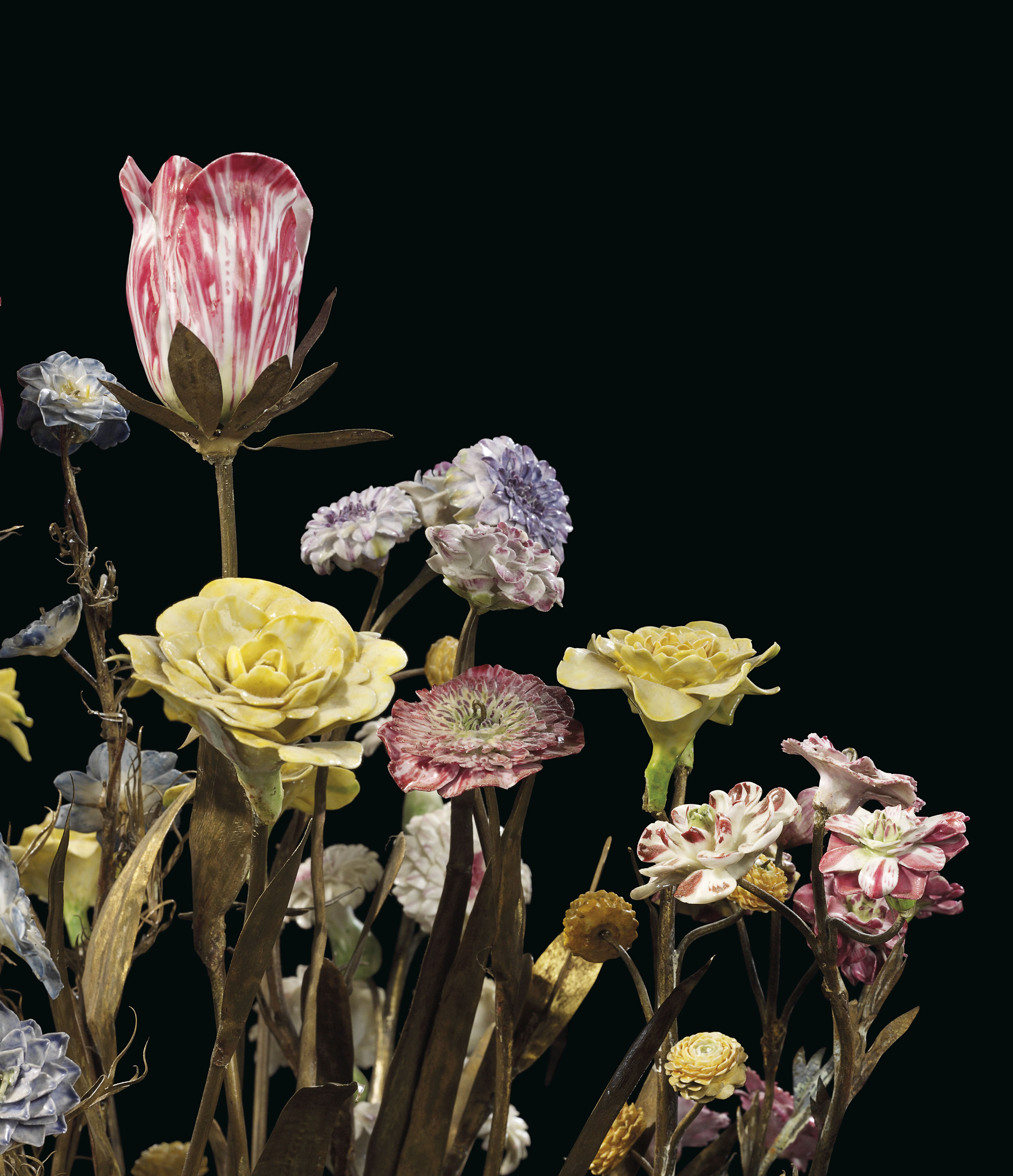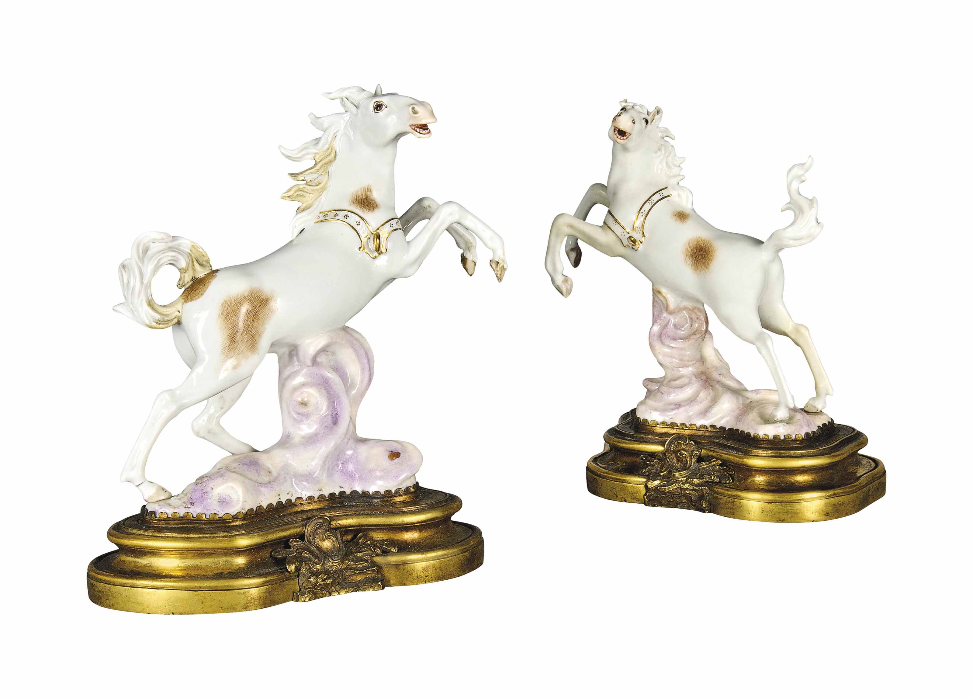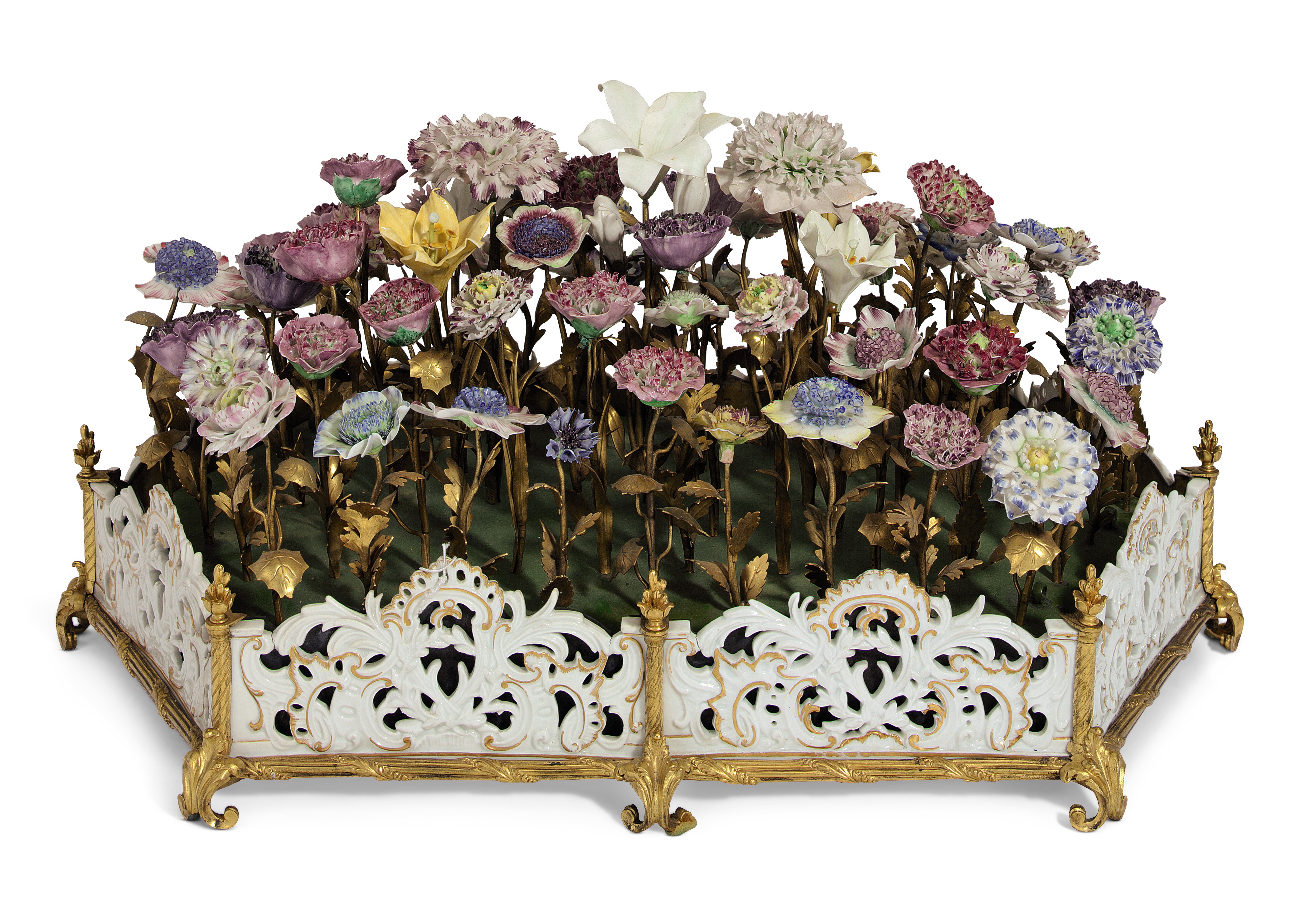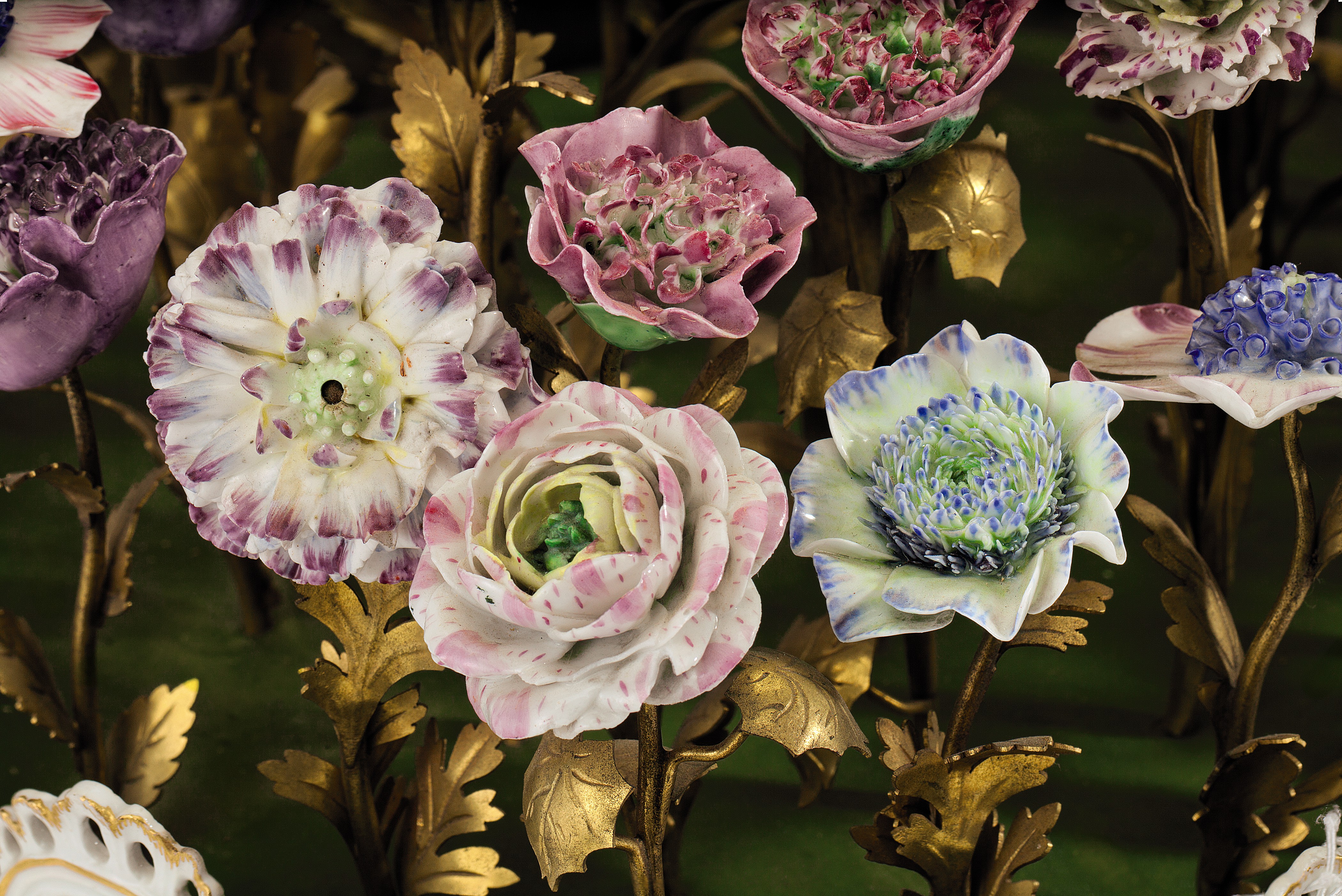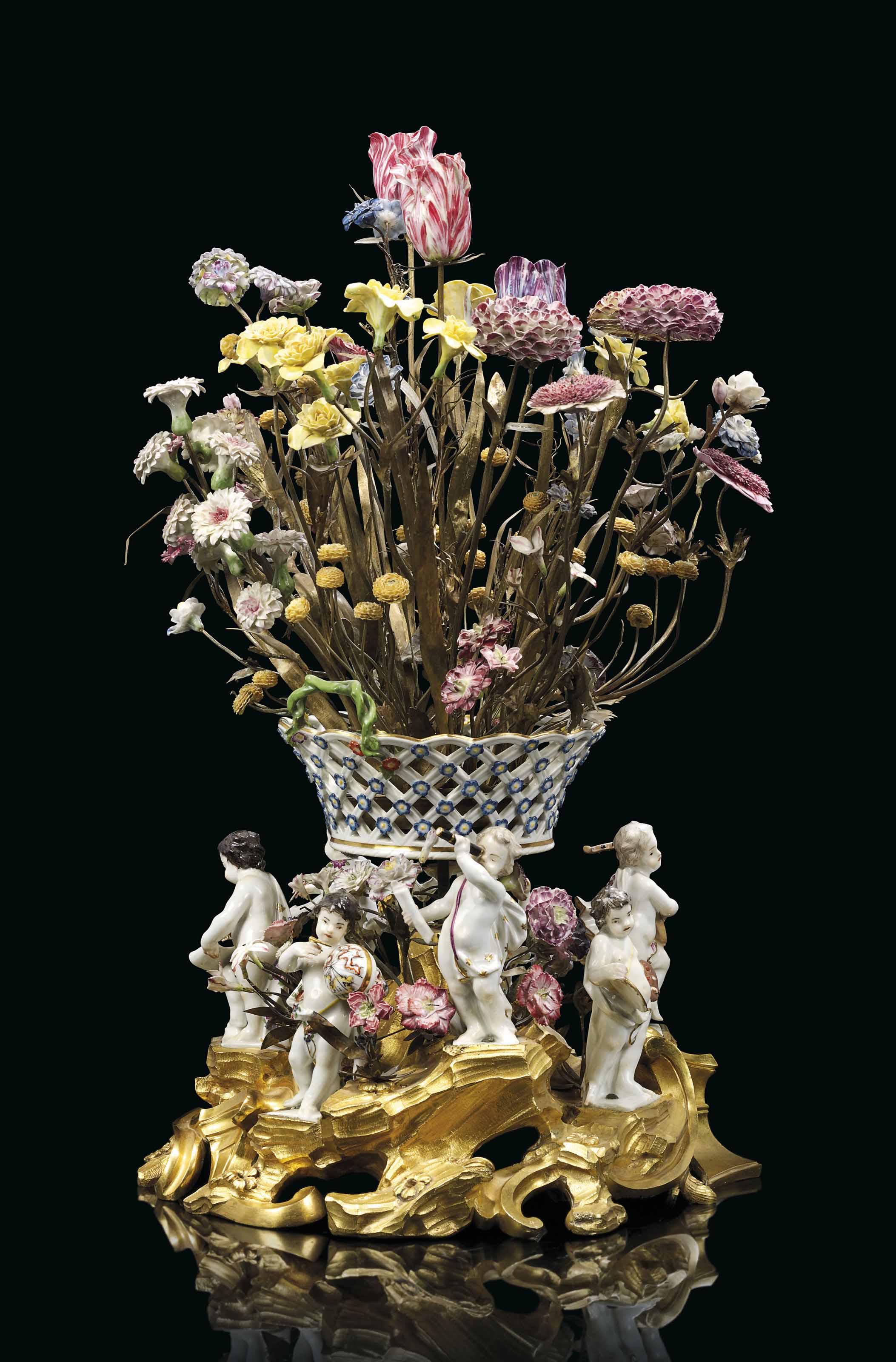 Íàáîð èç ÷åòûðåõ ìåéñåíñêèõ ãðóïï àëëåãîðè÷åñêèõ ôèãóð, ïðåäñòàâëÿþùèõ ÷åòûðå âðåìåíè ãîäà, íà ïîçîëî÷åííûõ áðîíçîâûõ òðåõñâåòíûõ êàíäåëÿáðàõ, ôàðôîð îêîëî 1755-60 ãîäîâ, ìîíòèðîâêè êîíöà 19 âåêà