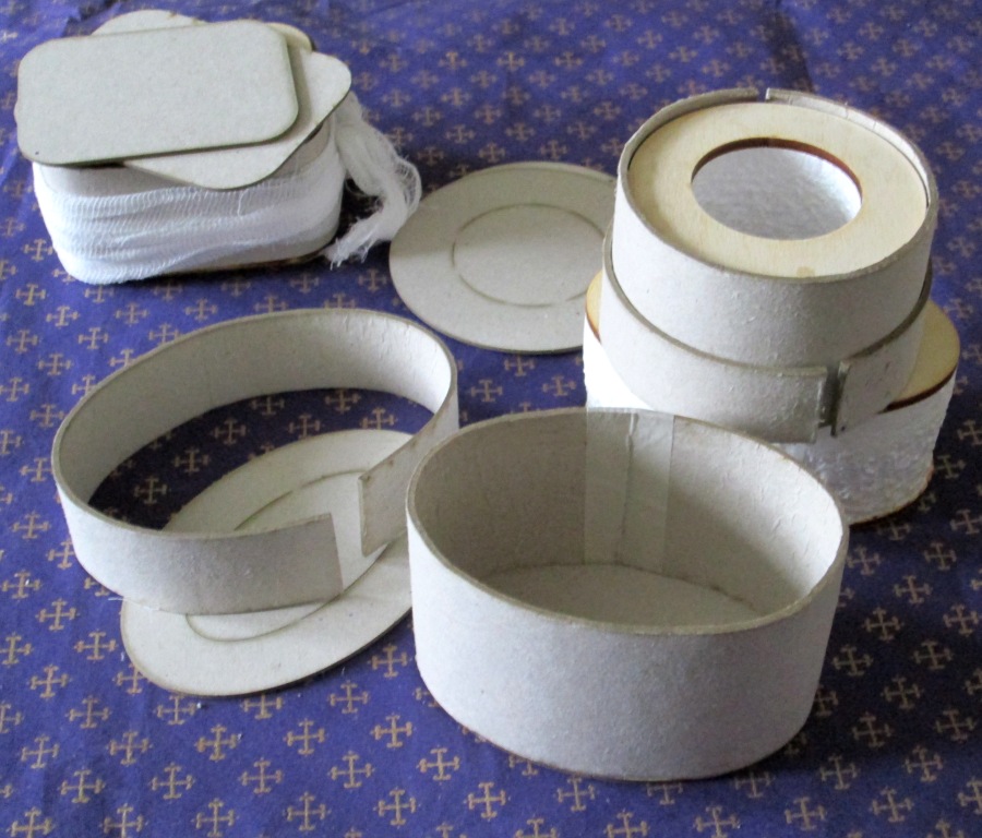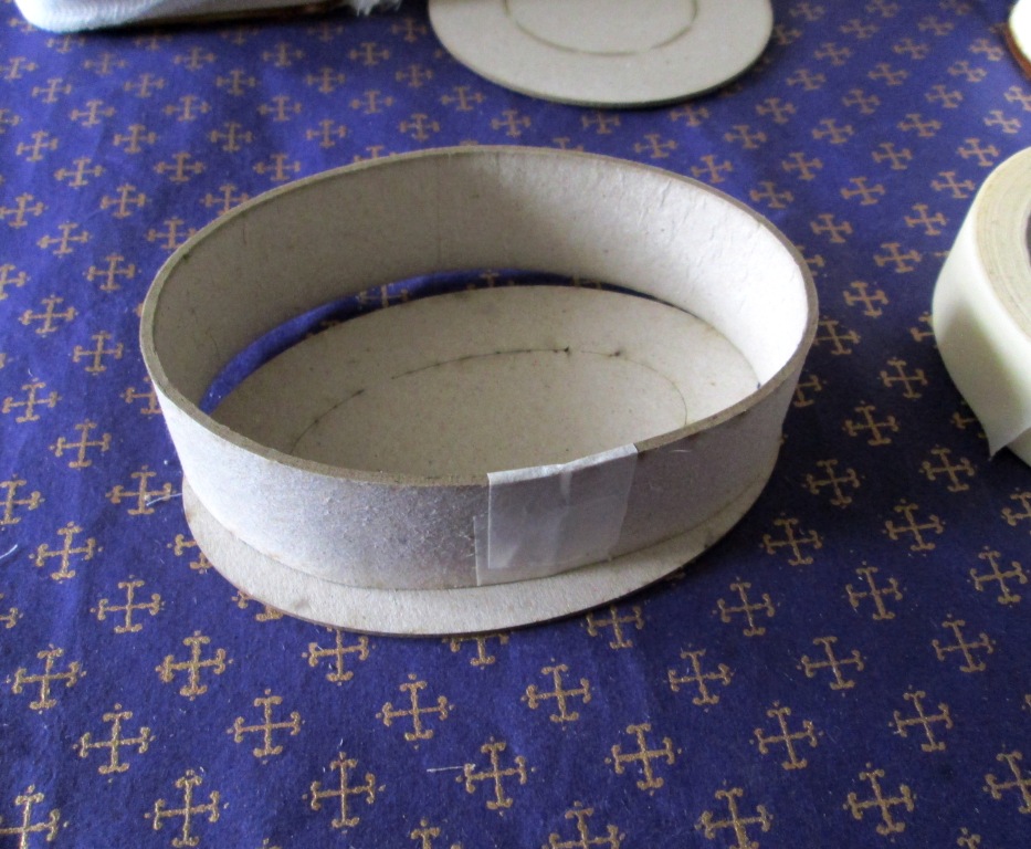 2. Оборачиваем мокрым картоном болванку. Если коробка с крышкой (не откидной!), то бортик от крышки кладем поверх тела шкатулки. На фото: большое кольцо - тело шкатулки. Маленькое кольцо - бортик крышки.