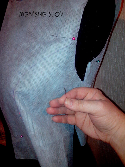 Первым делом распарываю нагрудную вытачку, направленую вниз (в готовой выкройке она так расположена по модели), и боковые швы. Далее расправляю полочку на уровне ширины груди и фиксирую булавкой.