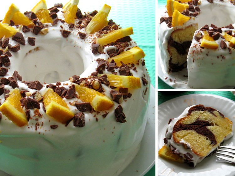 Я посыпала рубленным шоколадом с орехами и украсила дольками апельсина.