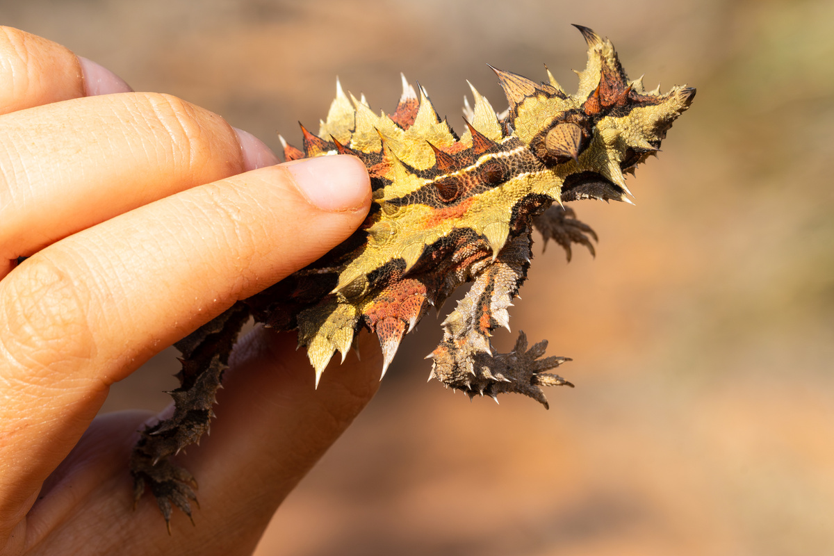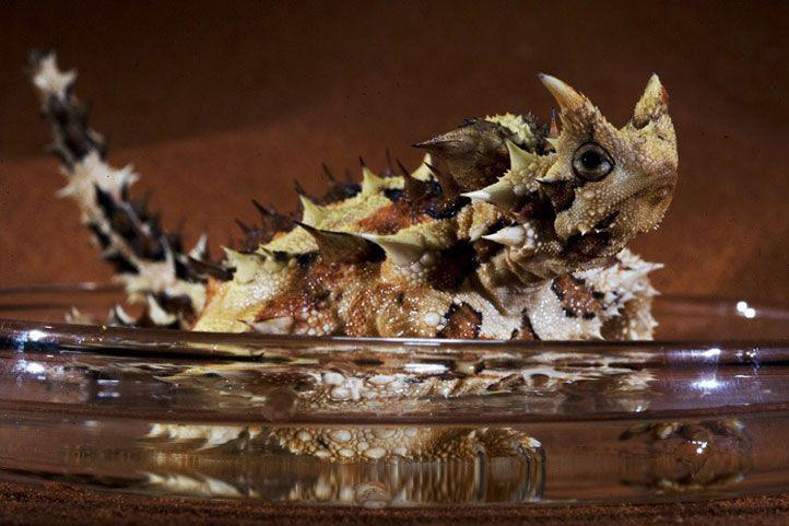 В предрассветных сумерках, когда воздух начинает нагреваться, влага выпадает в виде капелек росы. Оседает вода, в том числе, и на молохе, который в этот час специально забирается на какую-нибудь дюну или камень. А дальше происходит какая-то магия. Оседающая на молохе роса всасывается в микроскопические каналы и по ним течёт прямо ко рту рептилии. Всё, что ему нужно — это просто слизать воду!
