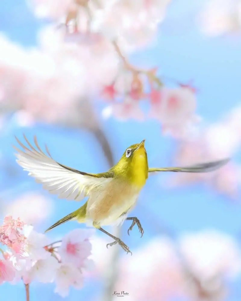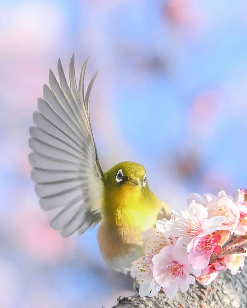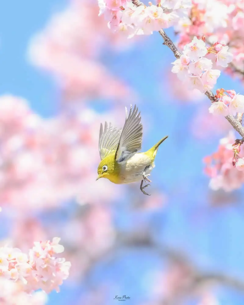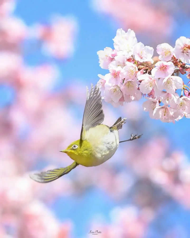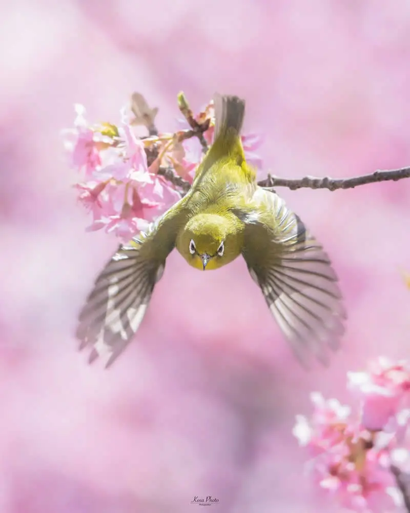 Когда вишневые деревья зацветают, превращаясь нежные розовые облака, японские белоглазки покоряют всех, стремительно паря, зависая в воздухе и позируя так, словно знают, что это время года принадлежит им.