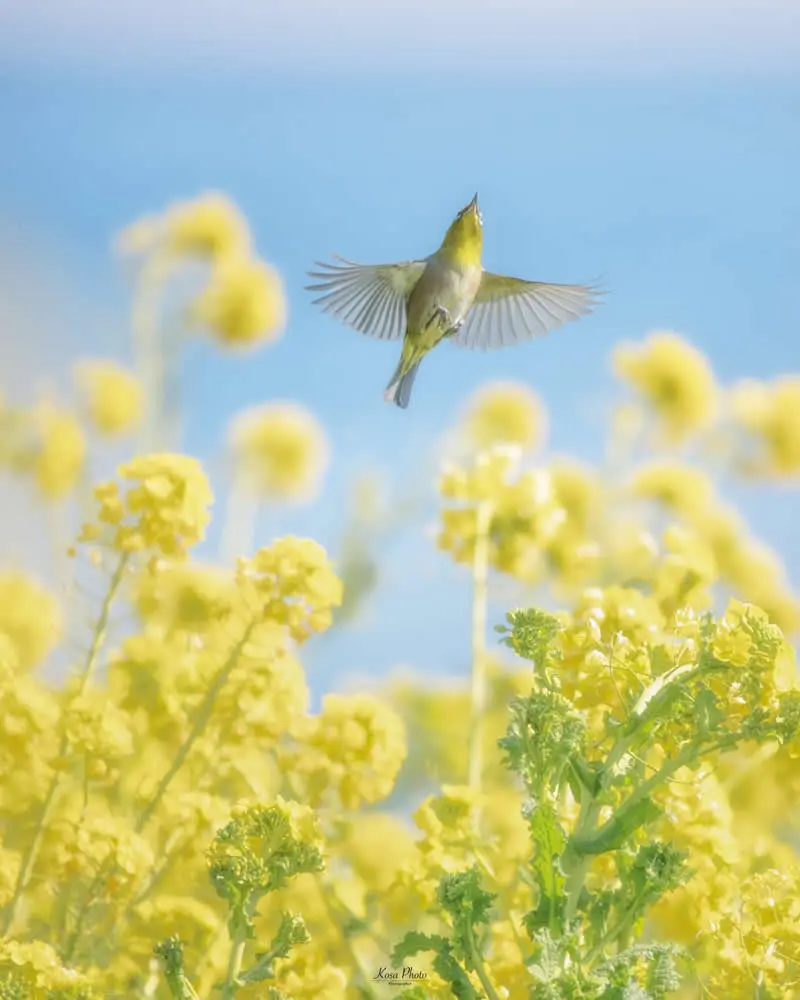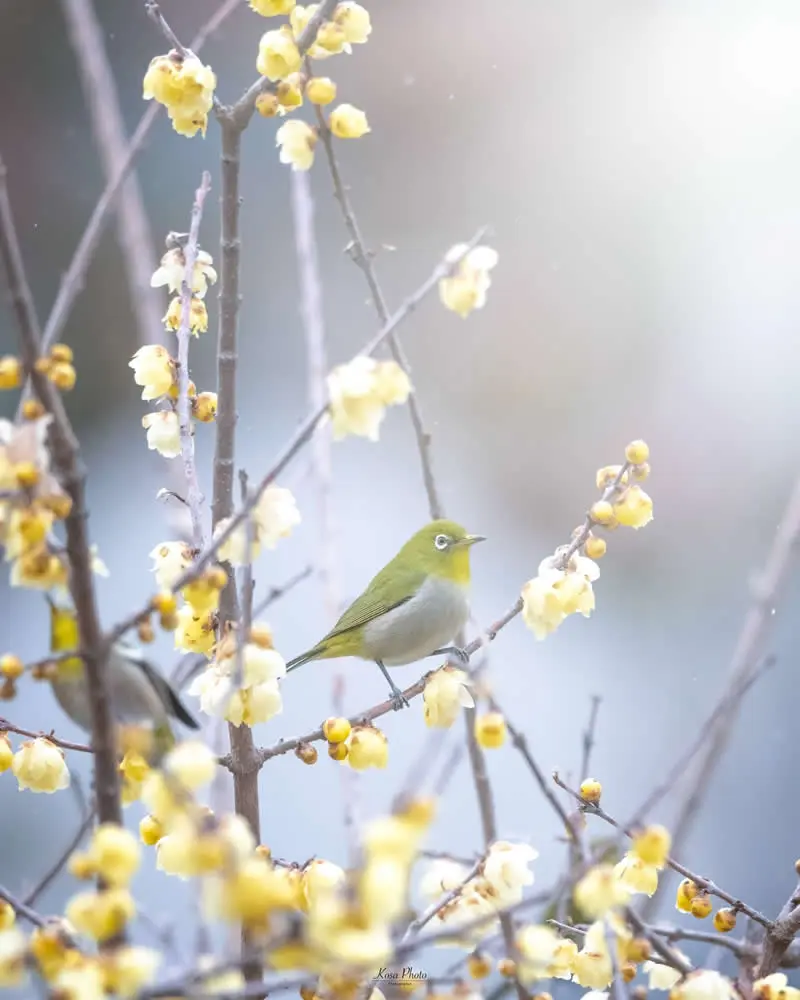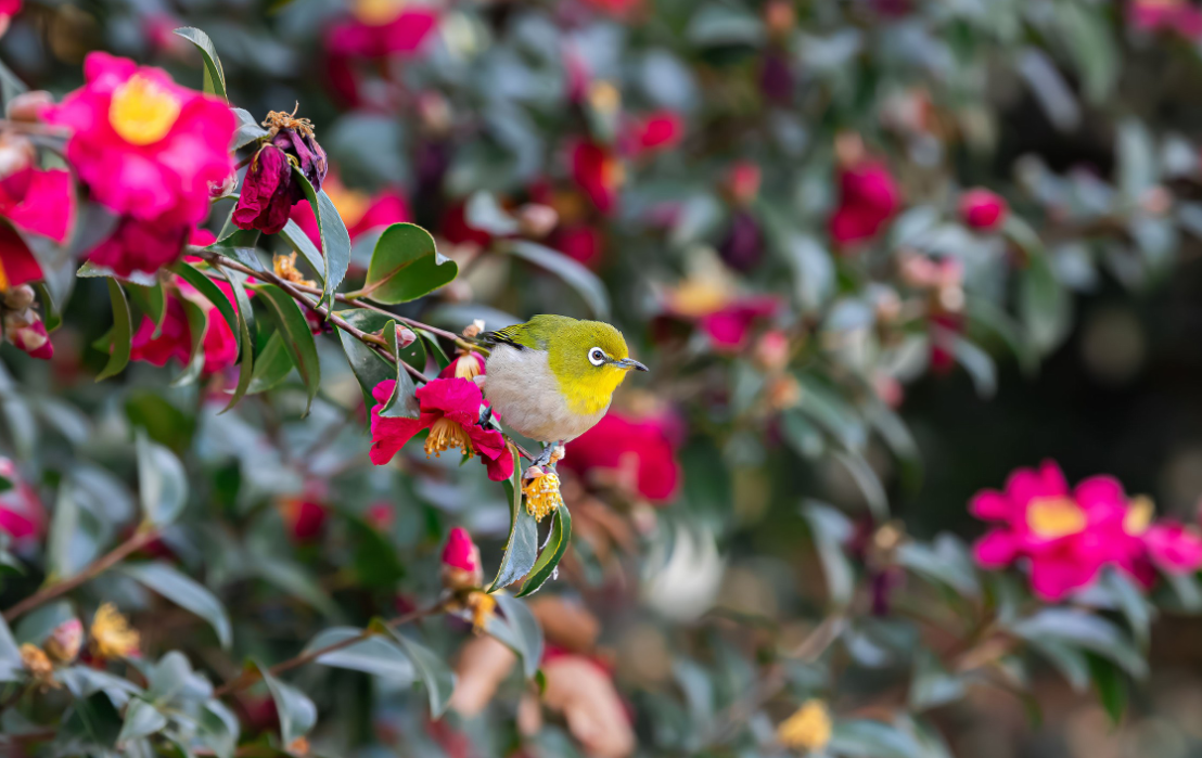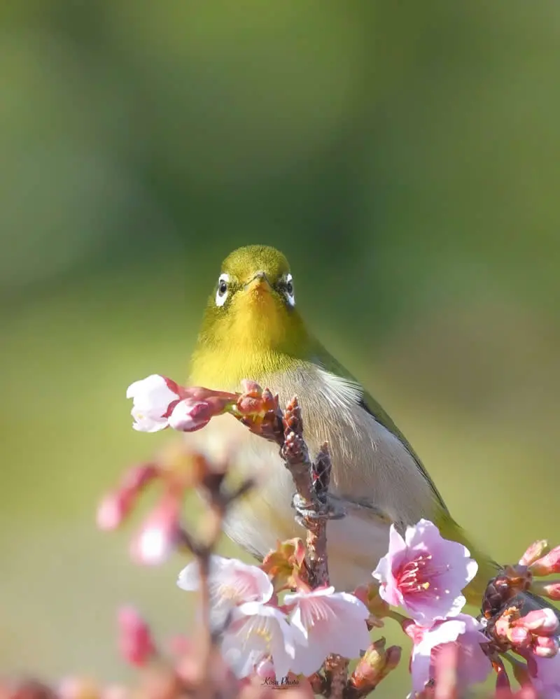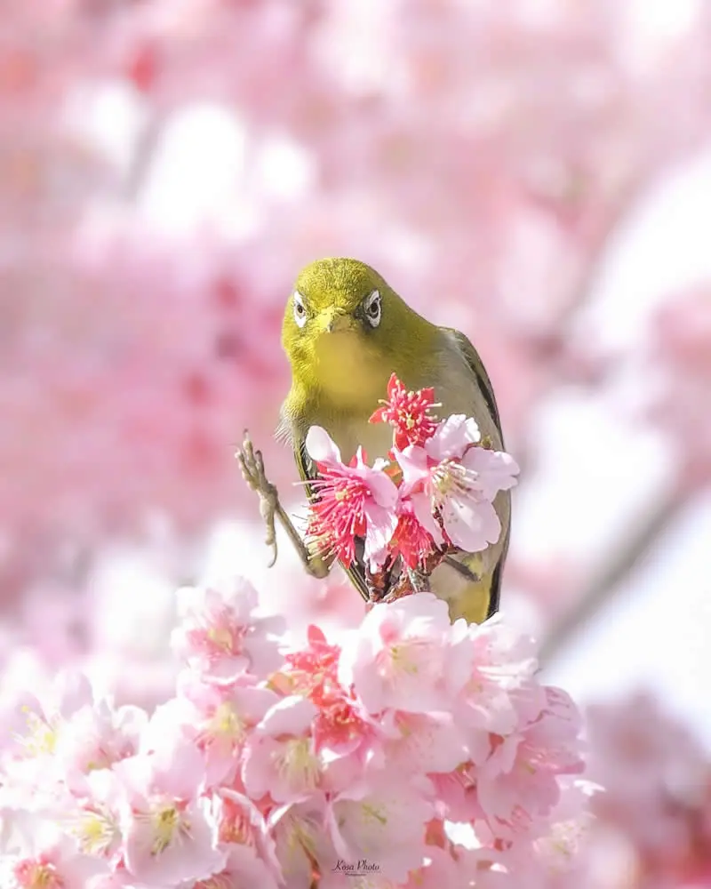 Когда вишневые деревья зацветают, превращаясь нежные розовые облака, японские белоглазки покоряют всех, стремительно паря, зависая в воздухе и позируя так, словно знают, что это время года принадлежит им.