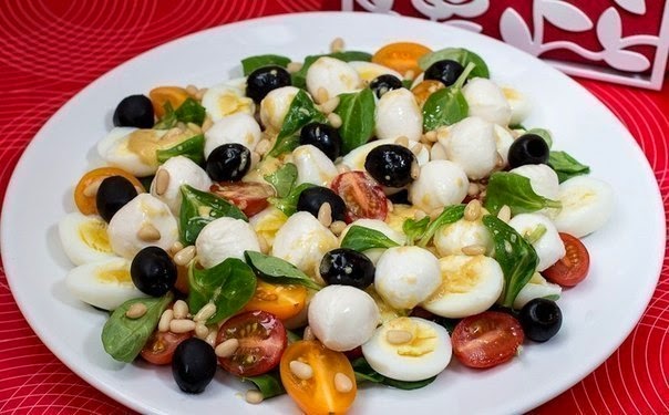 Приготовление: 1.На дно тарелки выкладываем салатные листья. 2.Режем пополам сваренные перепелиные яйца, выкладываем их на салат. Режем пополам помидоры черри, выкладываем на яйца. Па помидоры кладем моцареллу. 3.Сверху посыпаем кедровыми орешками и выкладываем маслины. Украшаем зеленью на свой вкус. 4.Готовим заправку. В оливковое масло добавляем горчицу, соль и лимонный сок. Заправляем наш салат. 5.Сверху посыпаем кедровыми орешками и выкладываем маслины. Украшаем зеленью на свой вкус.