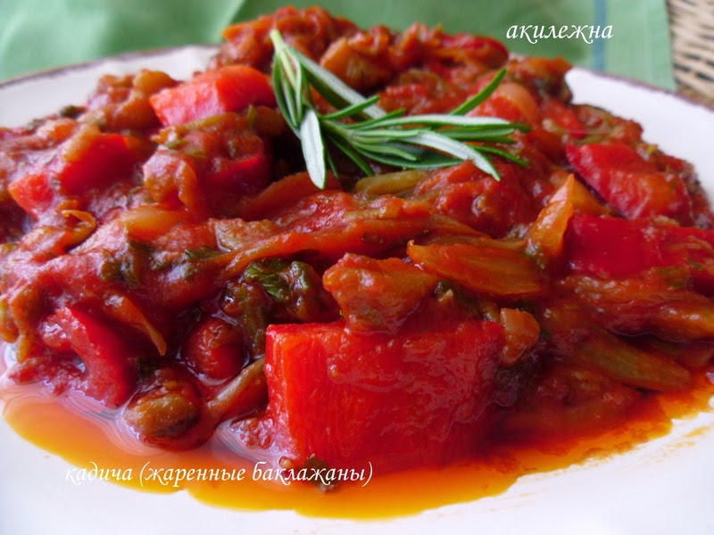 Затем в раст. масле обжарить лук нарезанный на кольца до золотистого цвета потом добавляем туда нарезанные помидоры, кладём перец нарезанный так же соломкой или на кубики добавляем все специи, соевый соус, тушим все это в течении 15 минут, после добавляем уже жаренные баклажаны и тушим еще 3 минуты.в самом конце добавляем чеснок через чеснокодавку ,и мелко нарезанную кинзу или петрушку солим перчим все по вкусу.
