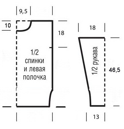 Вязать, как спинку. Но на высоте 42 см=110 р. от планки начать формировать вырез горловины. Закрыть средние 13 (15) 17 п.