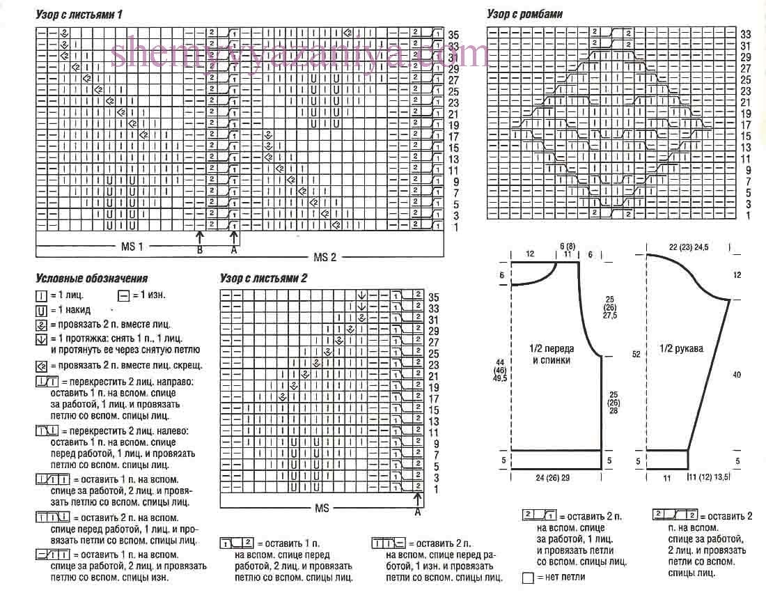 Внимание! Число петель в узорах с листьями меняется, поэтому рекомендуем сделать выкройку в натуральную величину и выполнять по ней соответствующие прибавления и убавления.