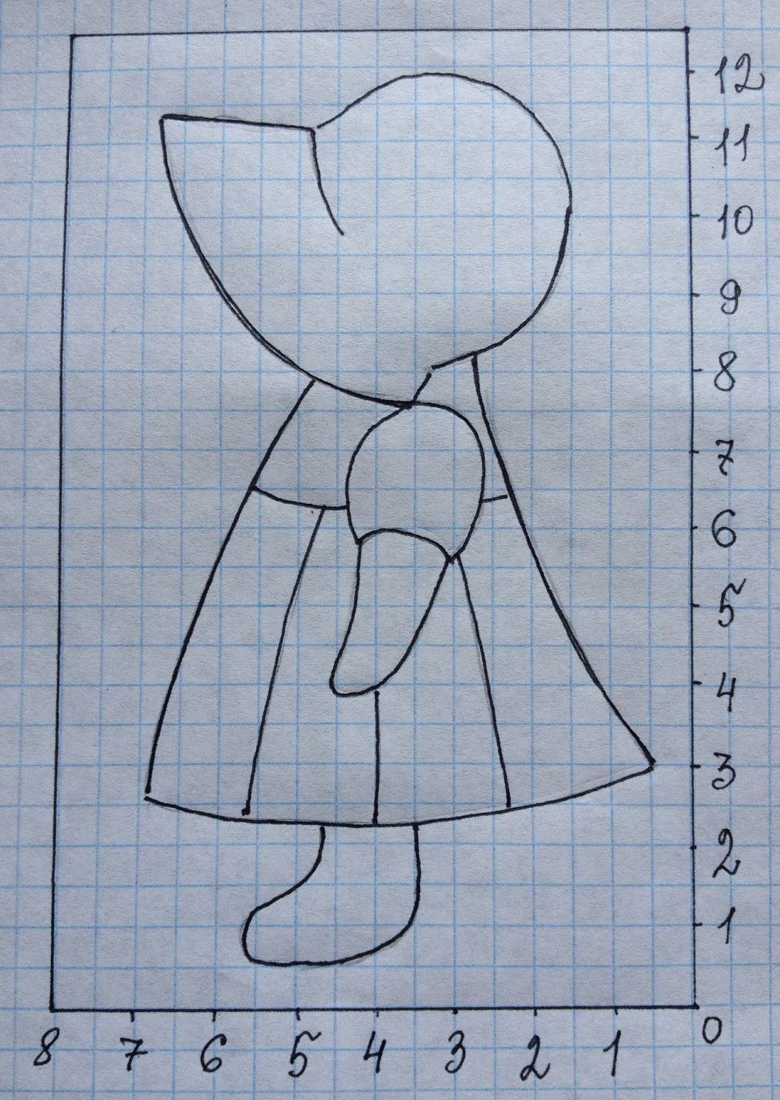 Удлиняем эти детальки с той стороны, где она покрывается следующей по счету. Например, ручка прячется под рукавчиком; со стороны рукавчика ее удлиняем и рисуем дополнительно 4-5 мм. Клин платья 5 прячется за клином платья 6 и т. д.