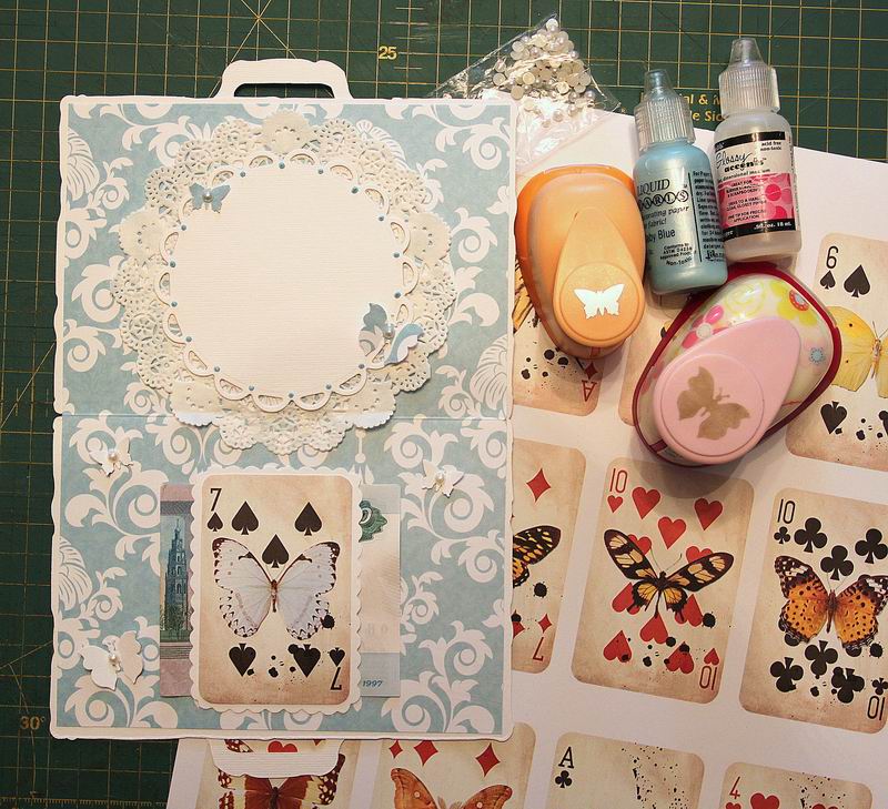 Используя цветы, дырокольные веточки, вырубные завитки и пр., украшаем переднюю сторону чемоданчика. Заднюю сторону я украсила только авторским штампом.