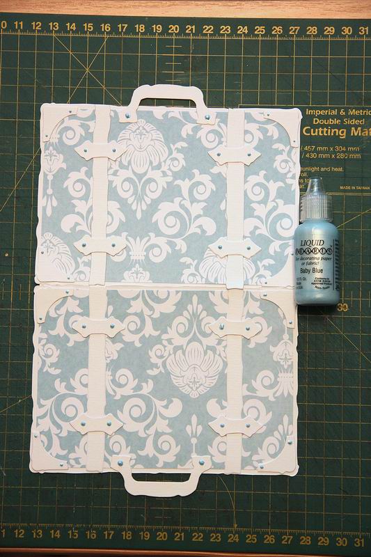 С помощью ножа от Tim Holtz вырезаем основу для чемоданчика - 2 прямоугольника, декоративные уголки, ремни, петли, ручки. Но это можно легко сделать и вручную, ведь все формы не сложные и размеры известны (см. фото на макетном коврике).