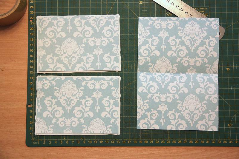 Раскладываем прямоугольные заготовки в виде открытого чемоданчика, измеряем размер внутреннего прямоугольника из скрапбумаги - 20,5*14,5см.