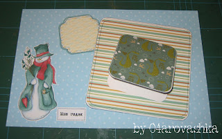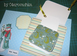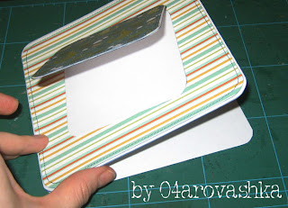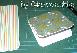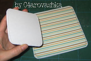 Далее беру скрап-бумагу и раскраиваю ее на 2-3 мм меньше по краям, чем основание из белой бумаги. У меня получилось 14,2*14,2см.