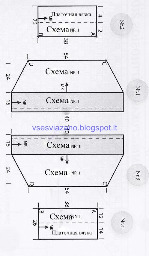 Наберите 52 петли+2 кромочные=54 петли:( 1 кромочная+ 28 петли платочной вязкой+ 1 изн.+22 петли( схема № 1)+ 1 изн.+ 1 кромочная) и вяжите деталь длиной 38 см. Все петли закройте в одном ряду. Маленькую деталь пришейте к большой, т.е сшейте стороны АВ и CD.