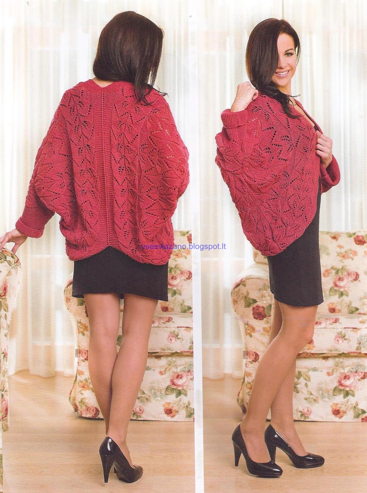 Наберите 31 петлю + 2 кромочных=33 петли ( 1 кромочная+ 1 изнаночная + 22 петли ( схема № 1) + 1 изнаночная+7 петель чулочной вязкой+ 1 кромочная), провяжите полосу длиной 140 см и все петли закройте в одном ряду. С правого края полосы наберите петли ( 1 боковая петля= 1 набираемой петле) и, руководствуясь той же схемой, свяжите деталь длиной 24 см. Деталь сужайте, провязывая с обоих краев 2 петли в одну в каждом 6 ряду.Провязывая последний ряд, вяжите в одну петлю поочередно по 3 и по 2 петли для присбаривания предрукавной части. Оставшиеся петли закройте в одном ряду.