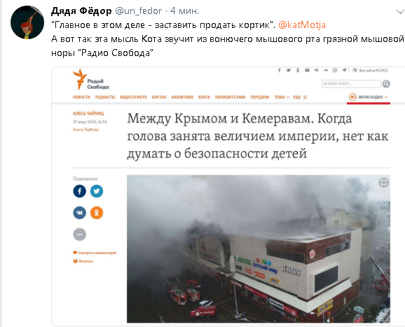 Назвав случившееся в Кемерово терактом я не опечаталась. Ибо случившееся странным образом случилось ровно через неделю после выборов, случилось в воскресенье в самом многолюдном для воскресного дня месте и в самое многолюдное время. Случившееся было рассчитано на то, чтобы убить как можно большее количество людей и детей. После случившегося интернет и все телеканалы переполнены обвинением в случившемся действующей власти.