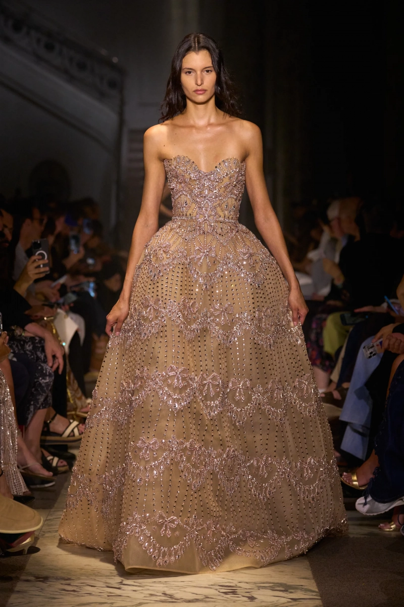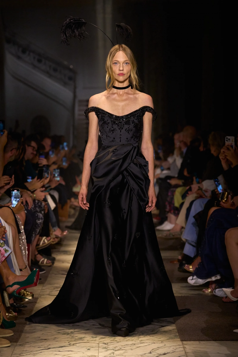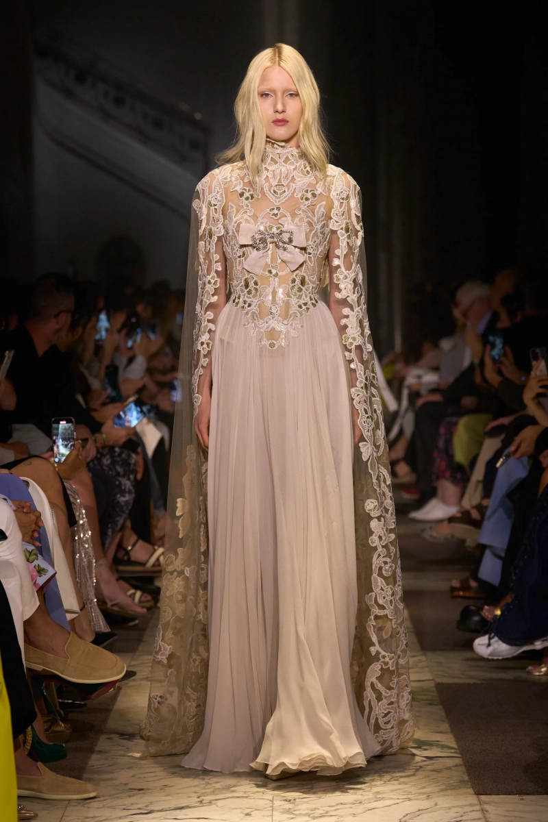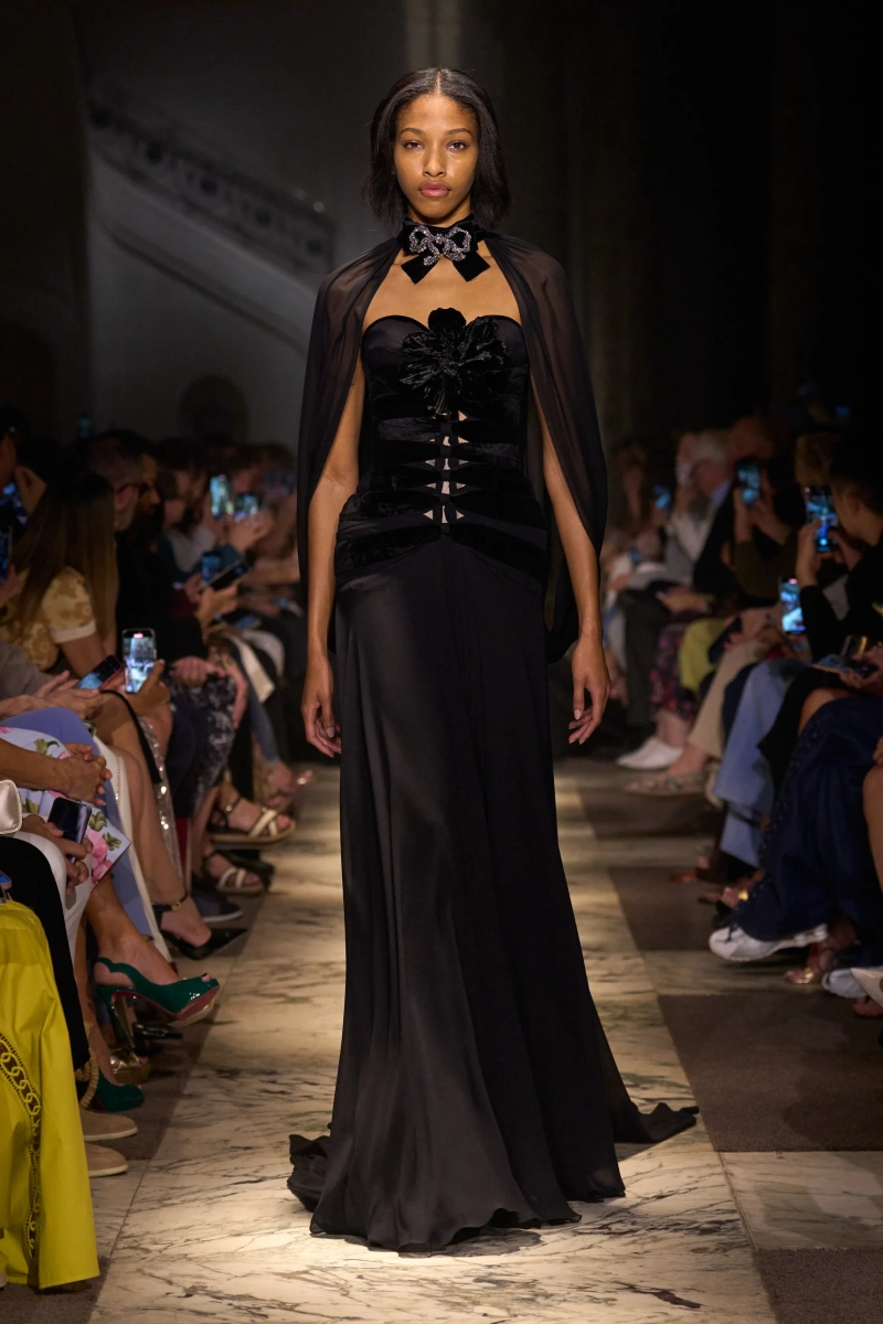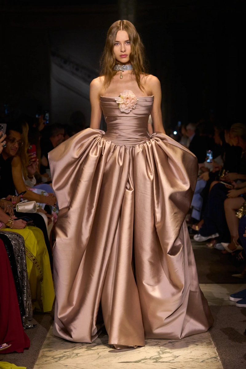 Эта коллекция — это мир, в котором Мария Антуанетта живет в 2025 году, обожает пастельные тона и имеет слабость к поп-музыке. Названная «Новый двор», коллекция играет с силуэтами XVIII века — панье, корсеты, рюши, пропущенные через юный, современный взгляд. Шоу проходило в роскошном павильоне Камбон в Париже и началось с соблазнительного поворота. Лара Стоун, Саша Пивоварова и Изабели Фонтана шли по лестнице в корсетных черных бархатных платьях — соблазнительных, скульптурных и удивительно минималистичных. Это был смелый контраст с тем, что последовало: сахарный взрыв макаронных оттенков, таких как розовый, мятный, фисташковый и небесно-голубой.