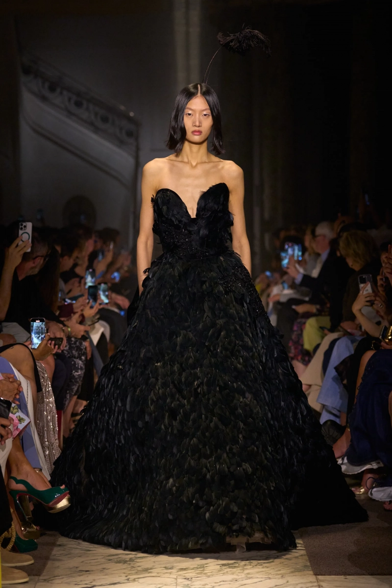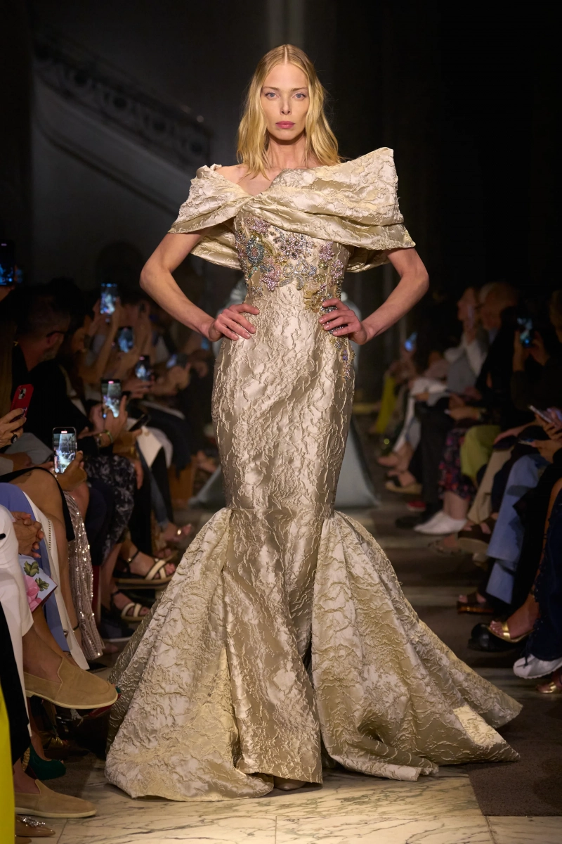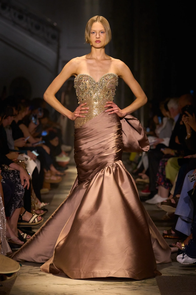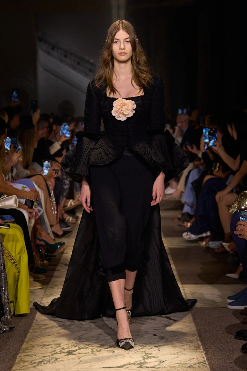 Эта коллекция — это мир, в котором Мария Антуанетта живет в 2025 году, обожает пастельные тона и имеет слабость к поп-музыке. Названная «Новый двор», коллекция играет с силуэтами XVIII века — панье, корсеты, рюши, пропущенные через юный, современный взгляд. Шоу проходило в роскошном павильоне Камбон в Париже и началось с соблазнительного поворота. Лара Стоун, Саша Пивоварова и Изабели Фонтана шли по лестнице в корсетных черных бархатных платьях — соблазнительных, скульптурных и удивительно минималистичных. Это был смелый контраст с тем, что последовало: сахарный взрыв макаронных оттенков, таких как розовый, мятный, фисташковый и небесно-голубой.