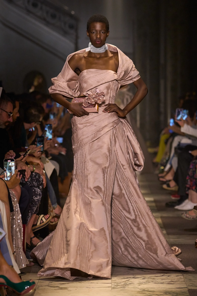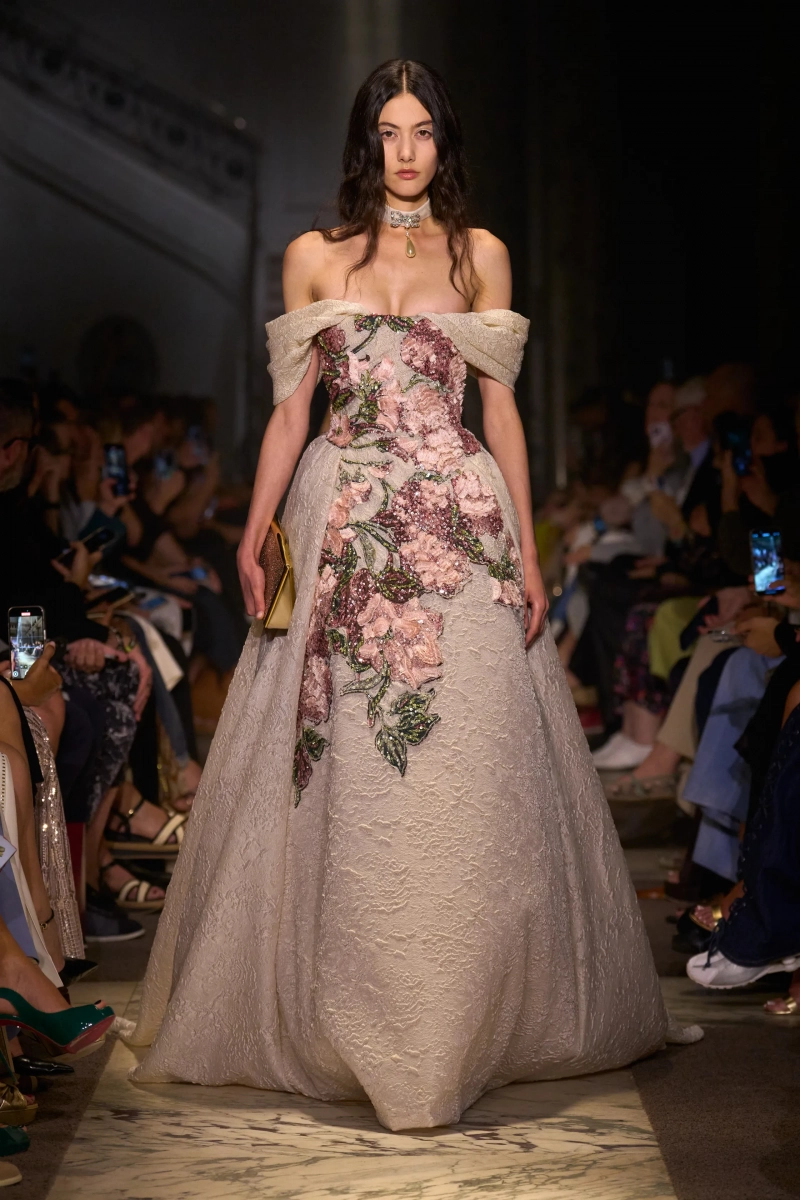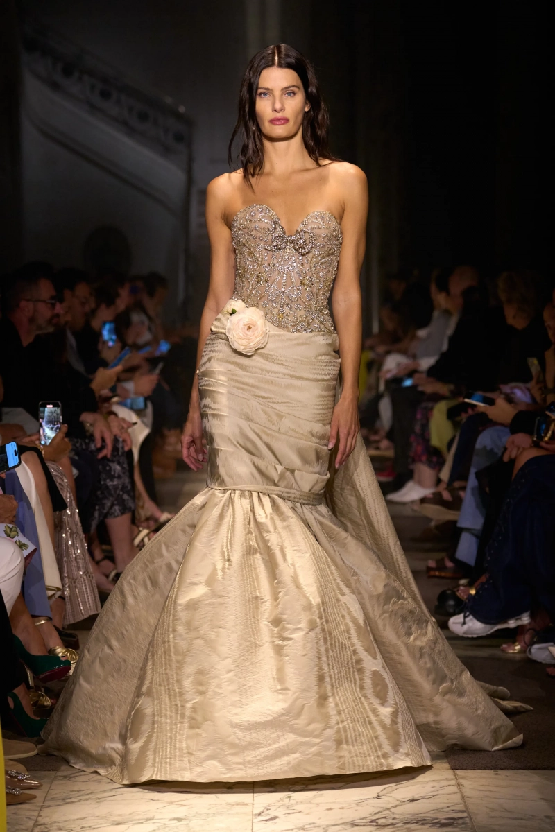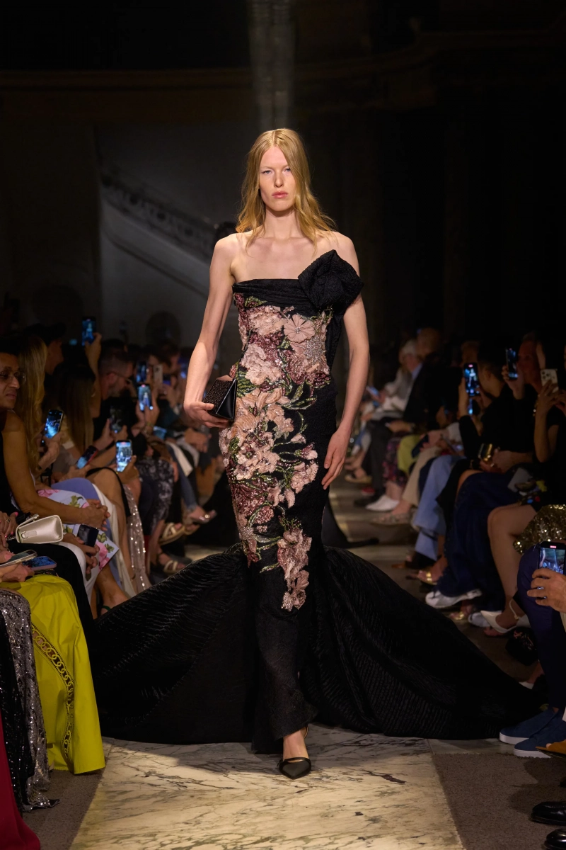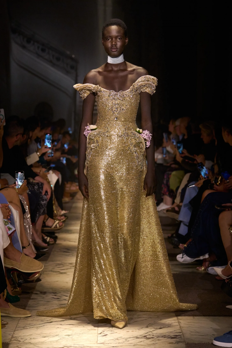 Эта коллекция — это мир, в котором Мария Антуанетта живет в 2025 году, обожает пастельные тона и имеет слабость к поп-музыке. Названная «Новый двор», коллекция играет с силуэтами XVIII века — панье, корсеты, рюши, пропущенные через юный, современный взгляд. Шоу проходило в роскошном павильоне Камбон в Париже и началось с соблазнительного поворота. Лара Стоун, Саша Пивоварова и Изабели Фонтана шли по лестнице в корсетных черных бархатных платьях — соблазнительных, скульптурных и удивительно минималистичных. Это был смелый контраст с тем, что последовало: сахарный взрыв макаронных оттенков, таких как розовый, мятный, фисташковый и небесно-голубой.