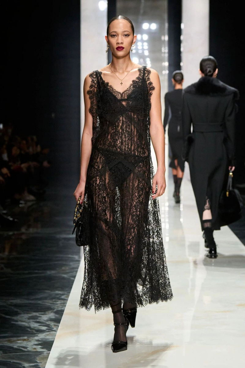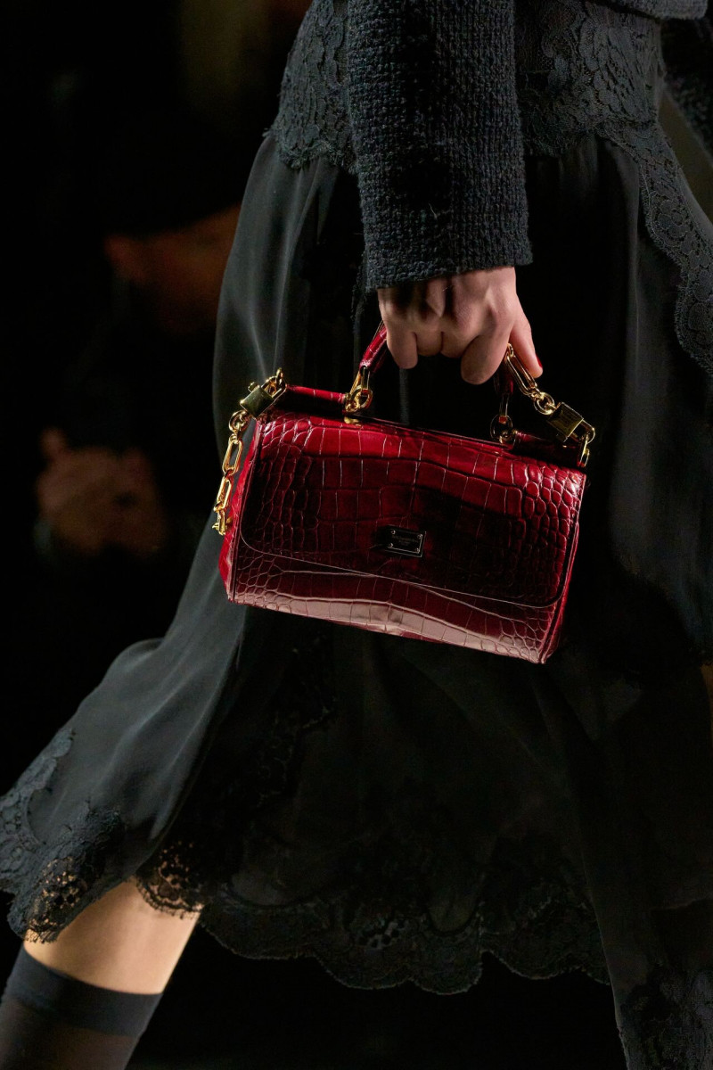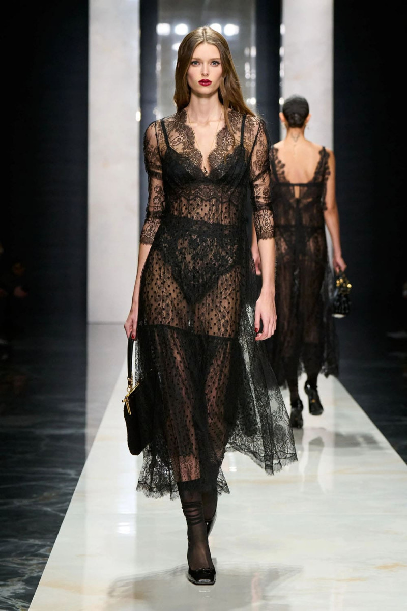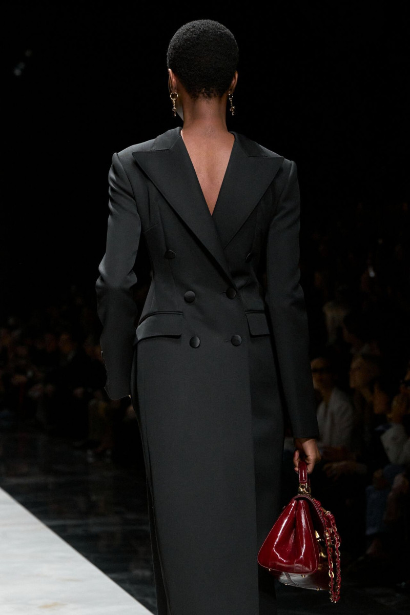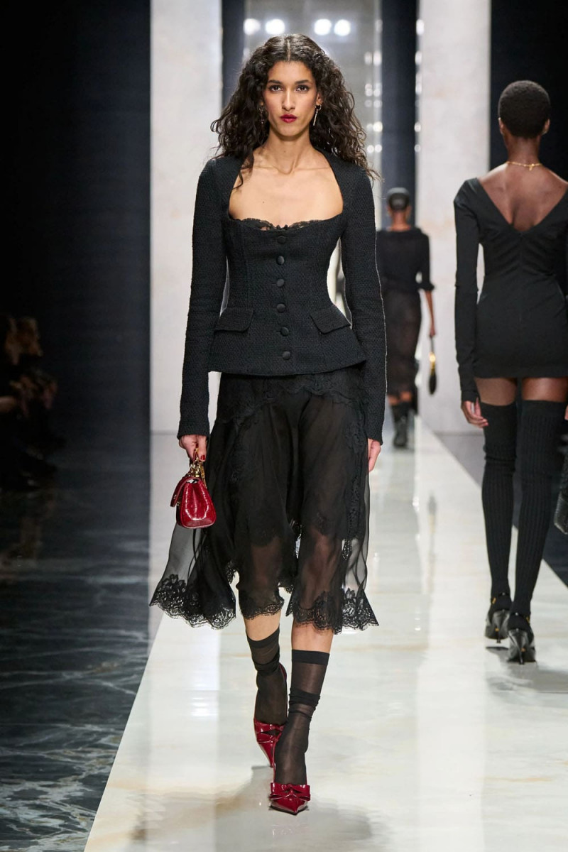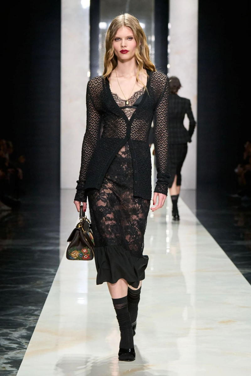Затем следуют полупрозрачные платья, расшитые черным кружевом, отсылающие как к религиозной иконографии, так и к ночной соблазнительности. Эти образы несут в себе историческую память, но никогда не кажутся театральными. Они обнажают тело, сохраняя при этом его загадочность. Скульптурное черное платье с высоким воротником подчеркивает выразительность образа. Длинные рукава, аккуратные вытачки и скрытые разрезы создают почти монашеский силуэт, который нарушает лишь темно-красная лакированная сумка. Это напряжение между сдержанностью и искушением – квинтэссенция стиля Dolce & Gabbana.