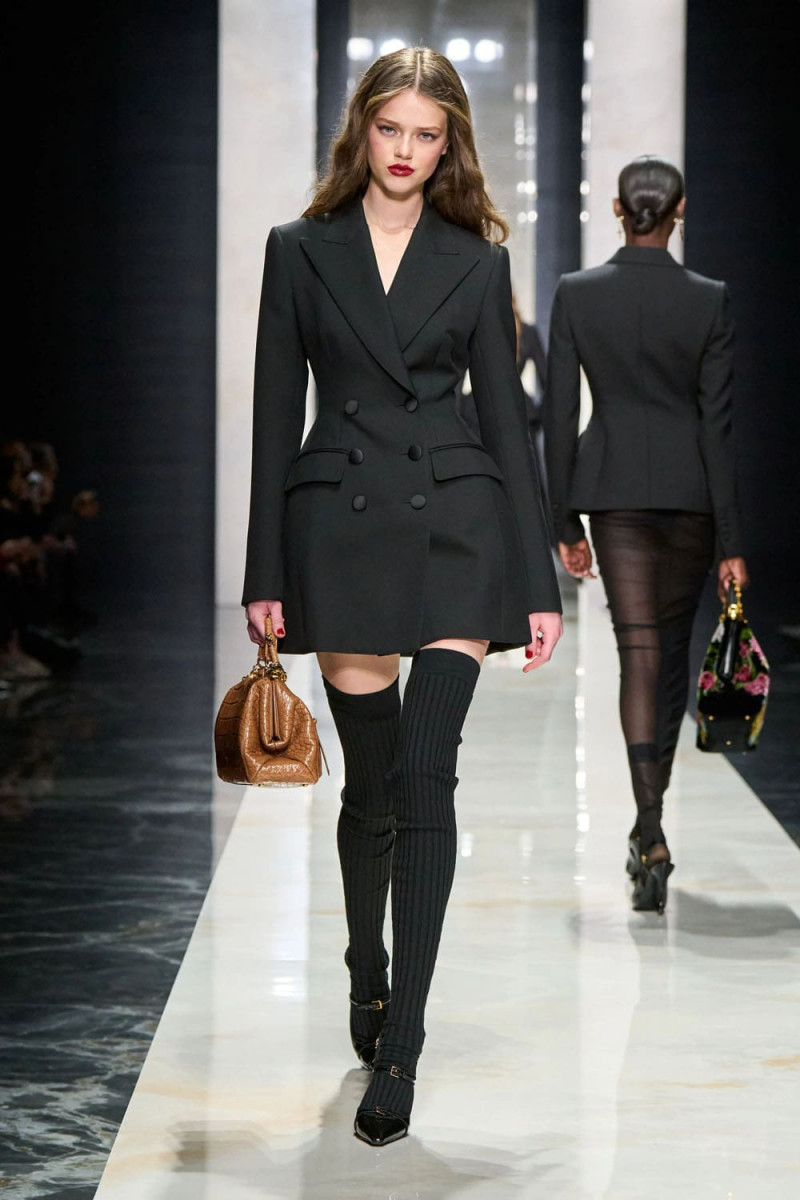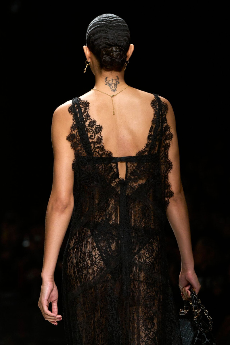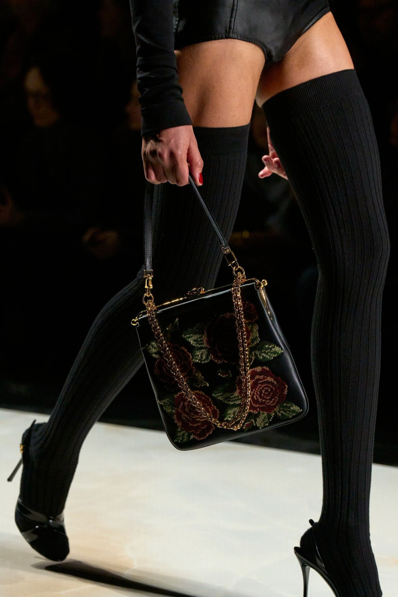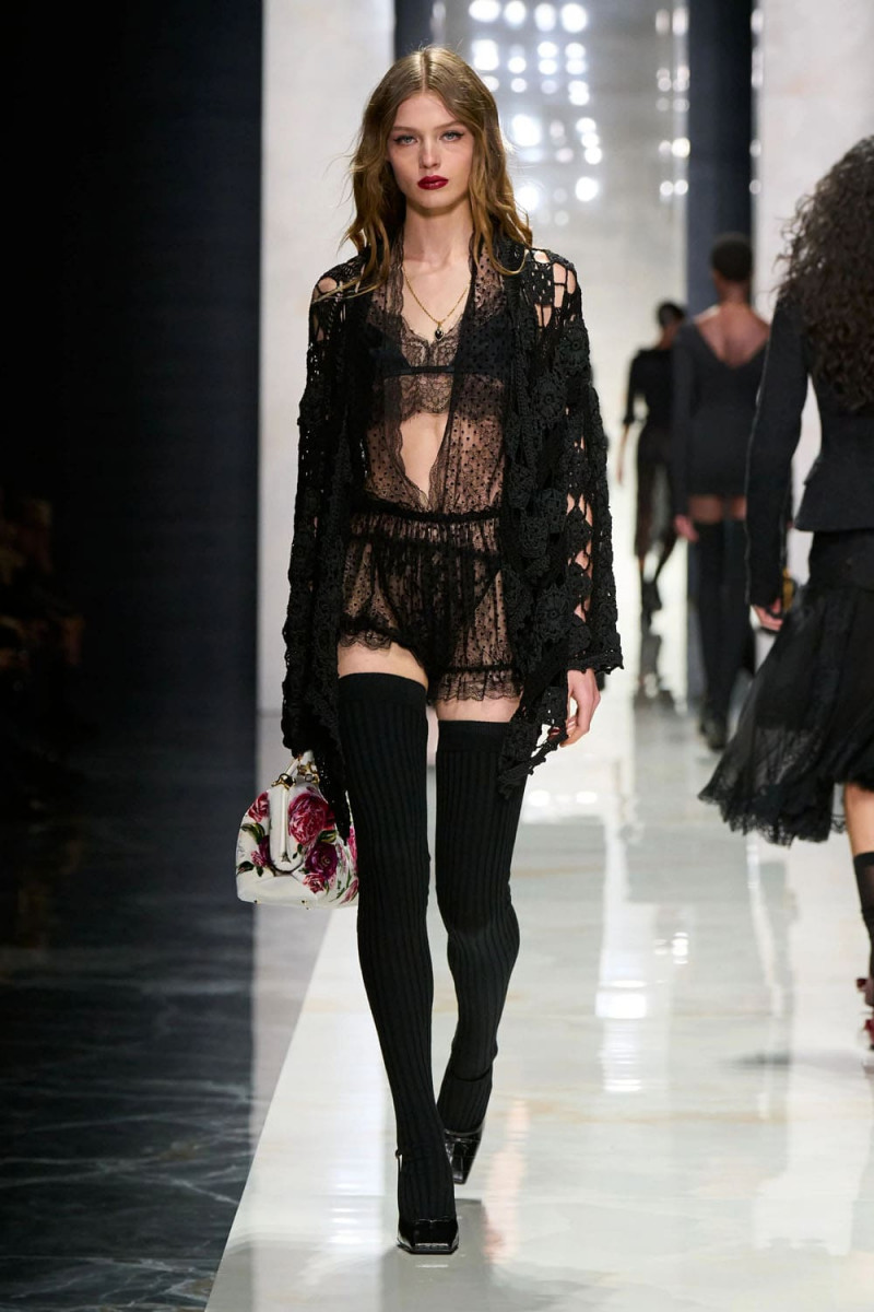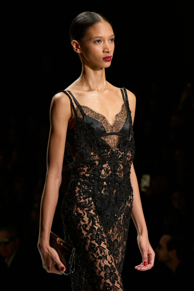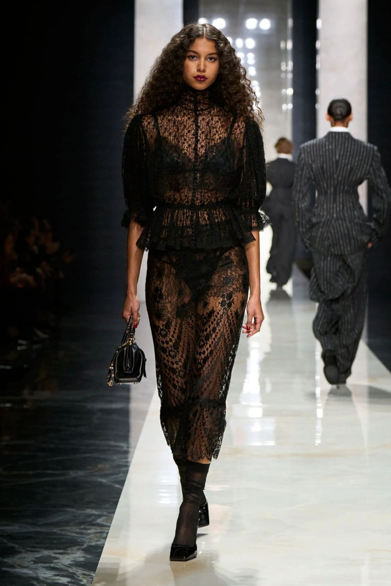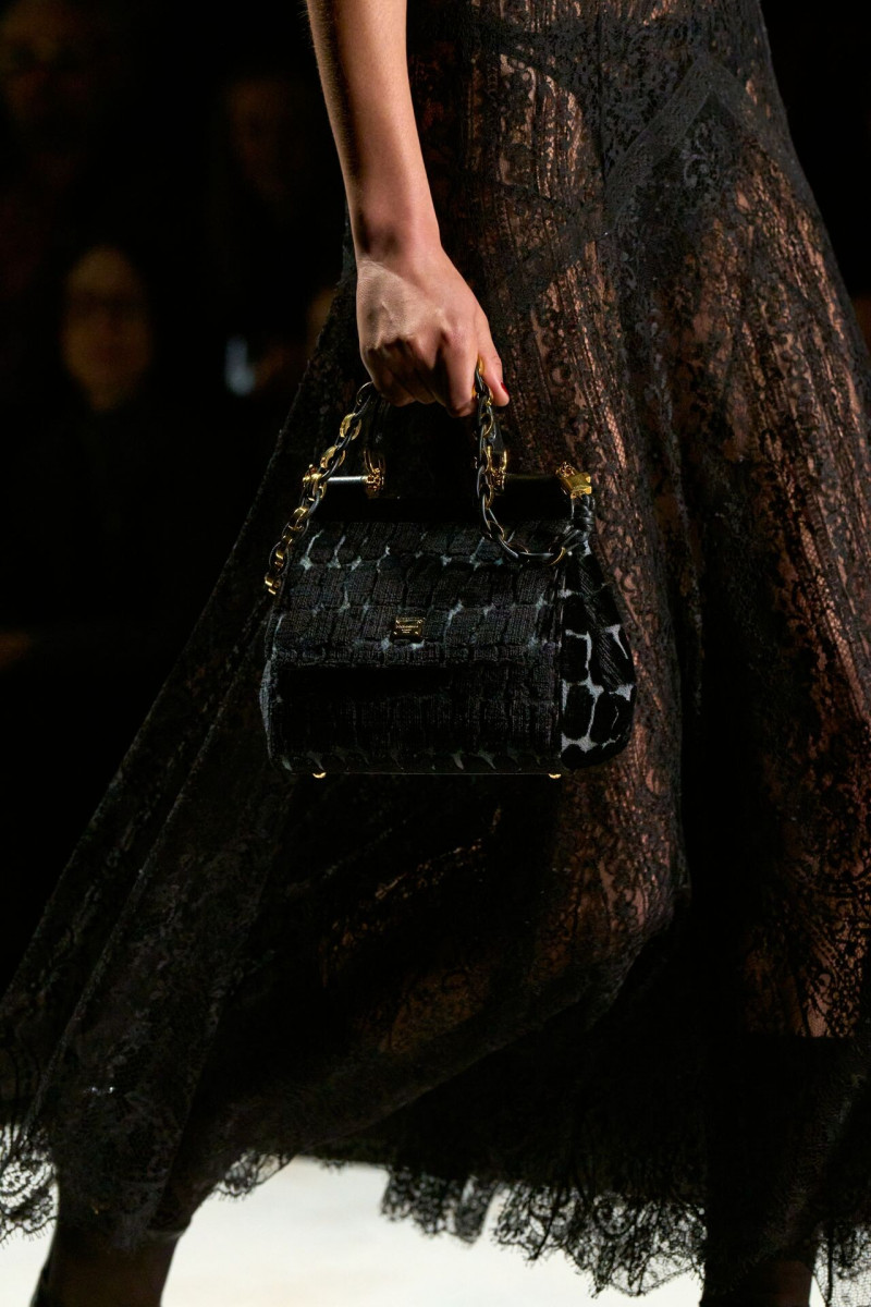 Затем следуют полупрозрачные платья, расшитые черным кружевом, отсылающие как к религиозной иконографии, так и к ночной соблазнительности. Эти образы несут в себе историческую память, но никогда не кажутся театральными. Они обнажают тело, сохраняя при этом его загадочность. Скульптурное черное платье с высоким воротником подчеркивает выразительность образа. Длинные рукава, аккуратные вытачки и скрытые разрезы создают почти монашеский силуэт, который нарушает лишь темно-красная лакированная сумка. Это напряжение между сдержанностью и искушением – квинтэссенция стиля Dolce & Gabbana.