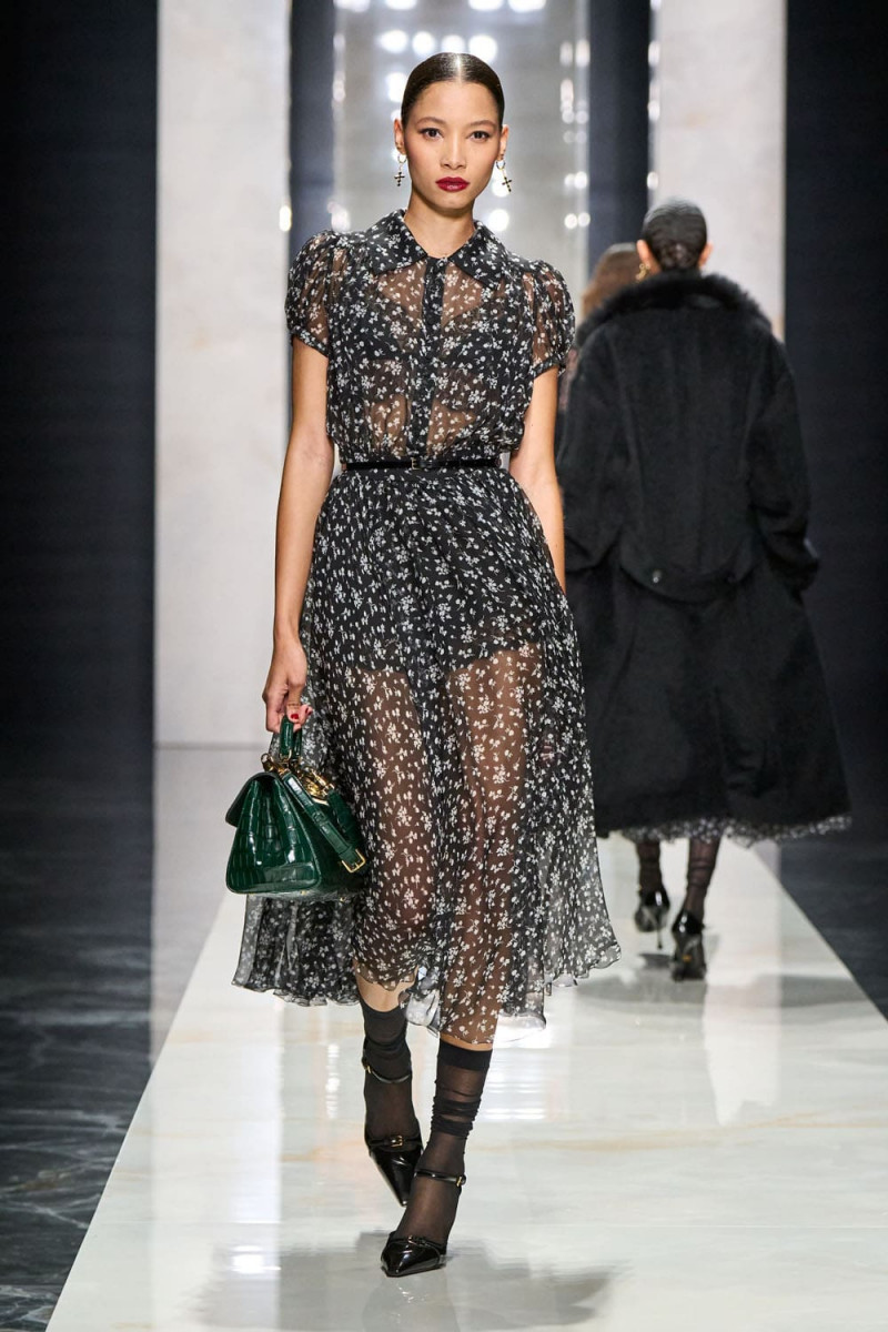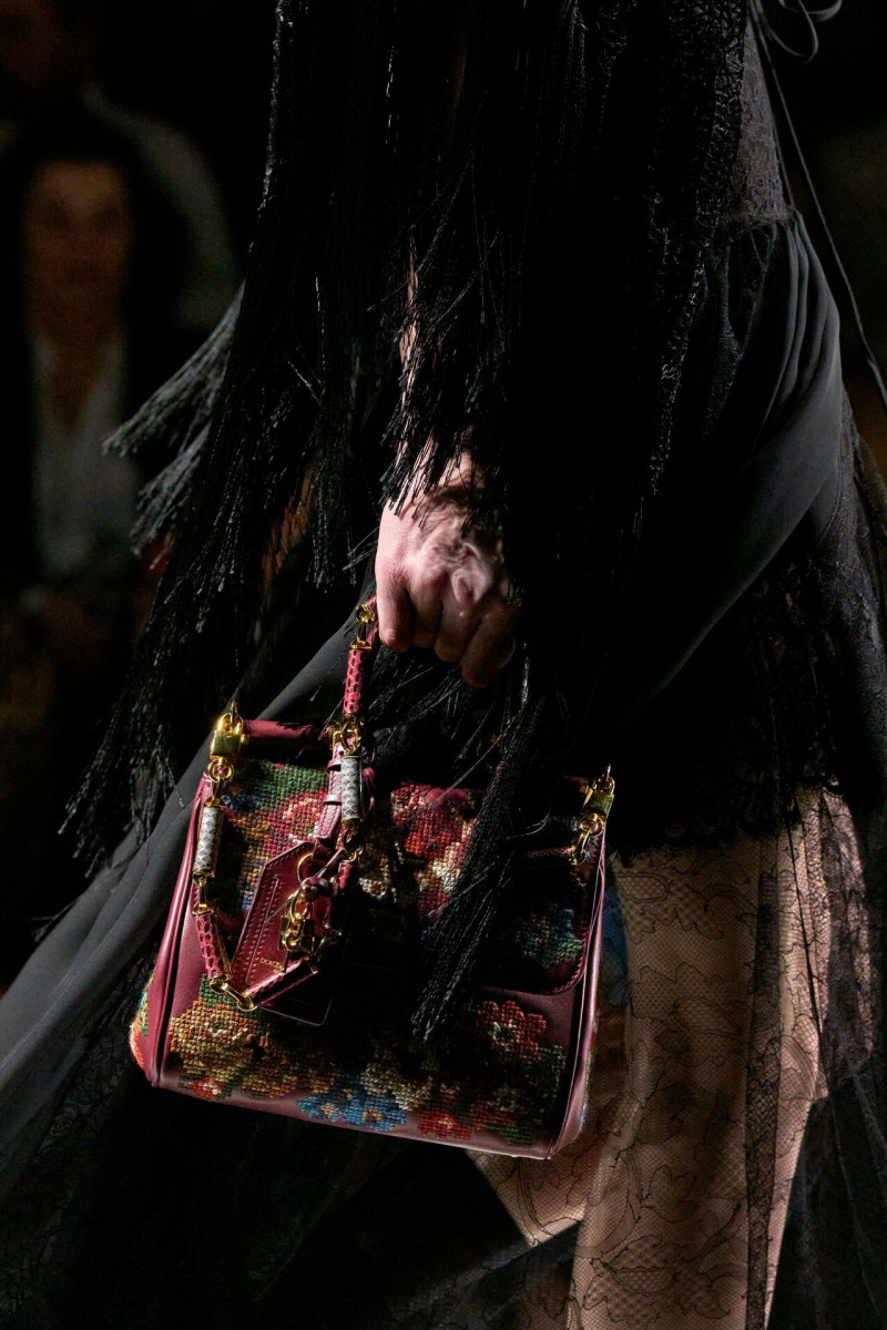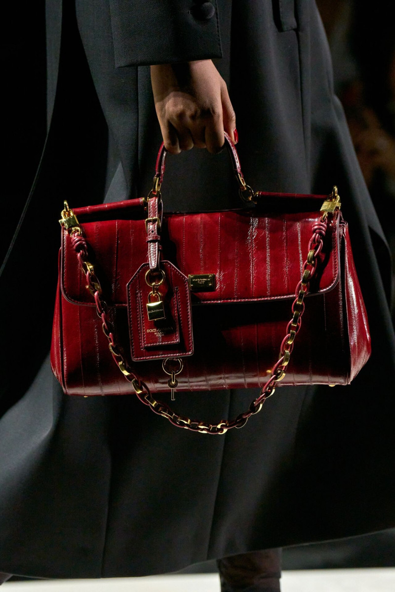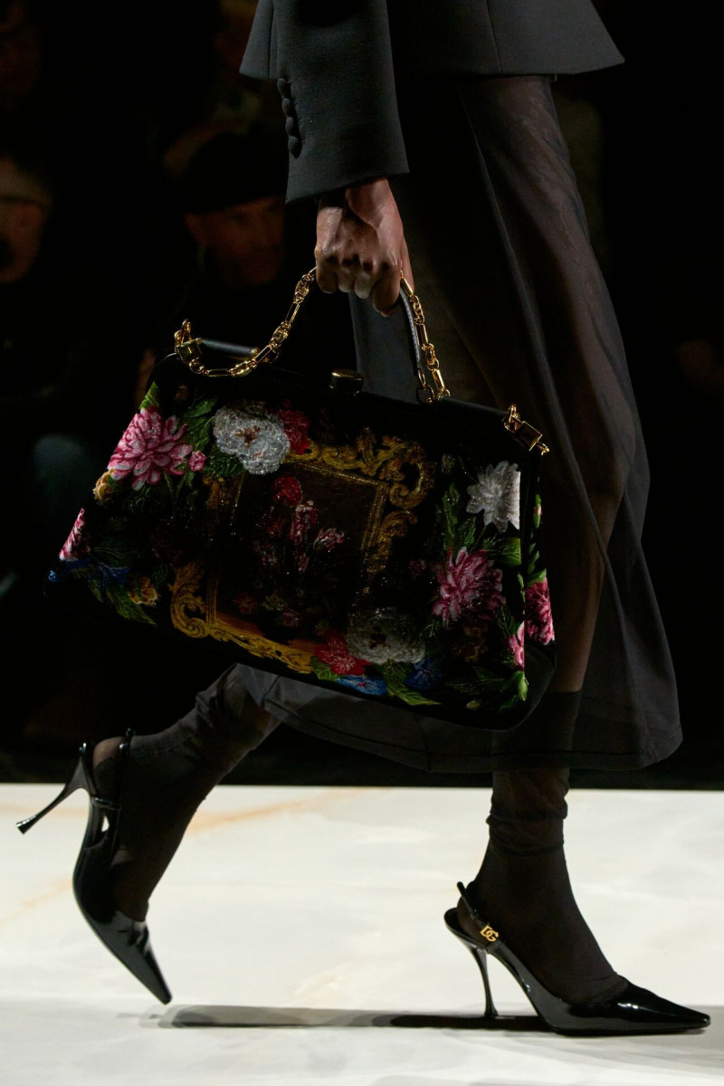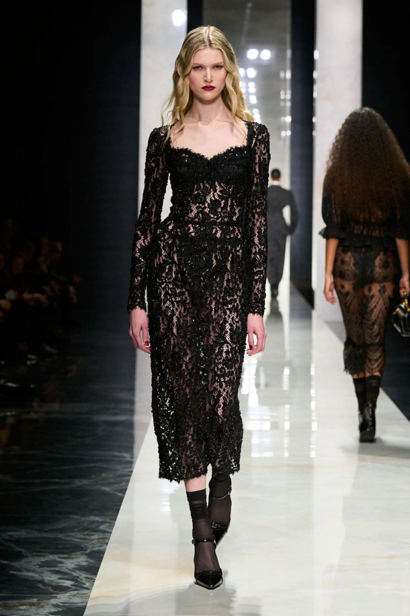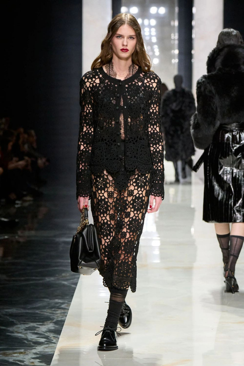 Затем следуют полупрозрачные платья, расшитые черным кружевом, отсылающие как к религиозной иконографии, так и к ночной соблазнительности. Эти образы несут в себе историческую память, но никогда не кажутся театральными. Они обнажают тело, сохраняя при этом его загадочность. Скульптурное черное платье с высоким воротником подчеркивает выразительность образа. Длинные рукава, аккуратные вытачки и скрытые разрезы создают почти монашеский силуэт, который нарушает лишь темно-красная лакированная сумка. Это напряжение между сдержанностью и искушением – квинтэссенция стиля Dolce & Gabbana.
