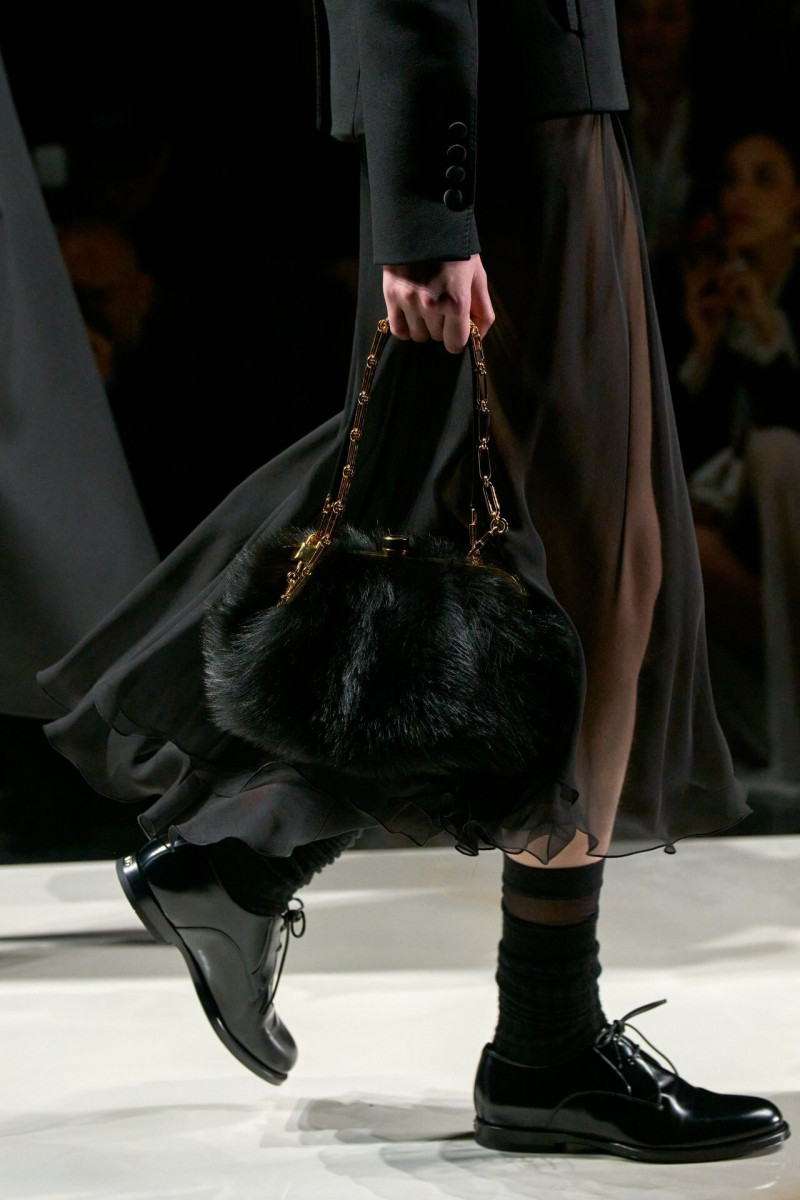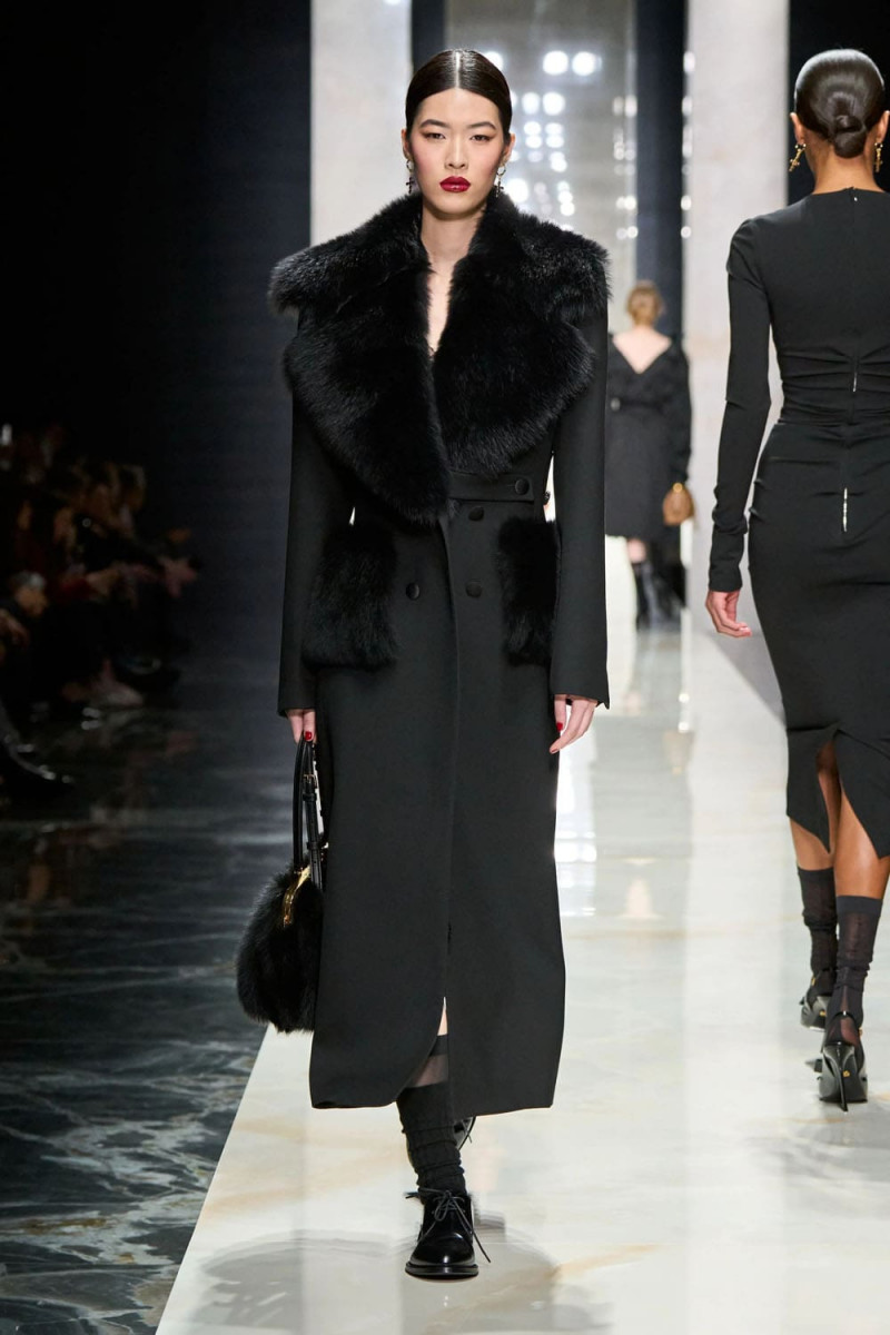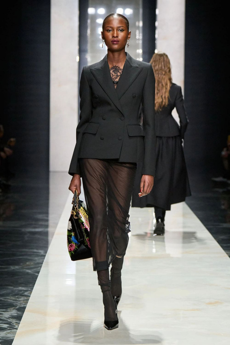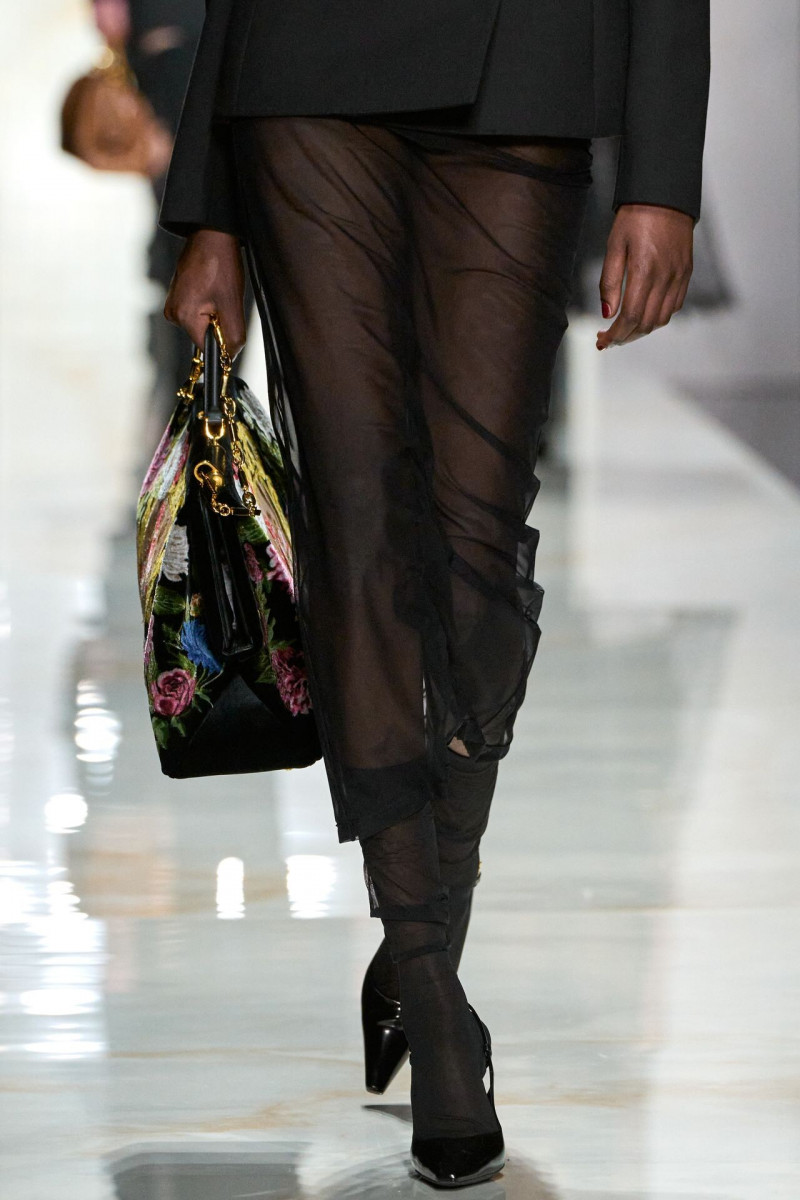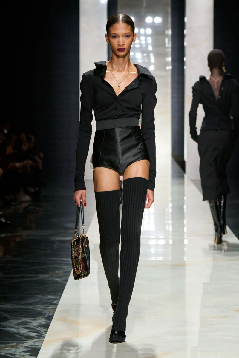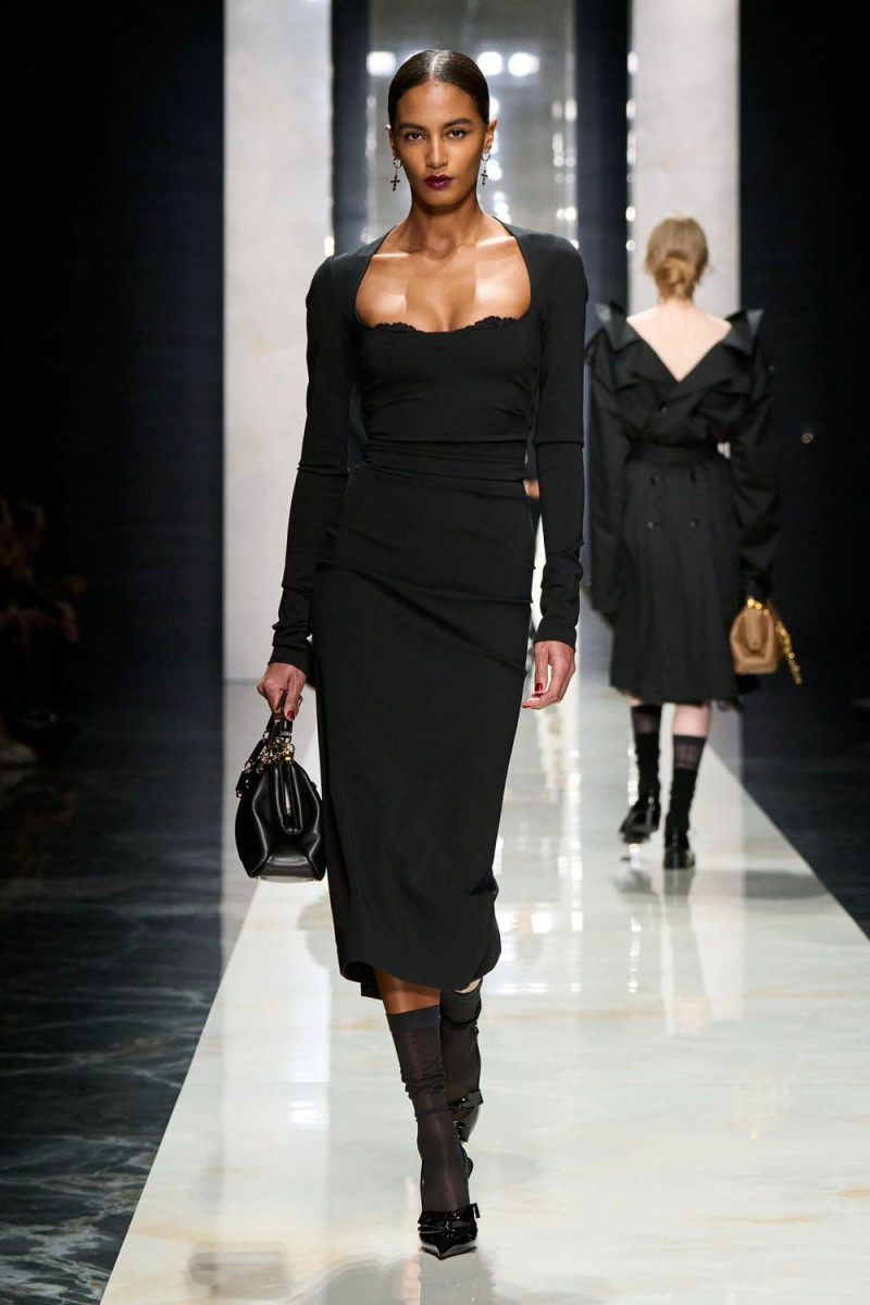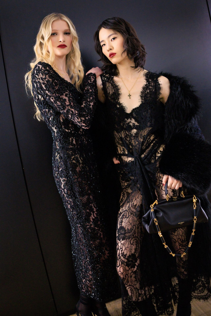 Затем следуют полупрозрачные платья, расшитые черным кружевом, отсылающие как к религиозной иконографии, так и к ночной соблазнительности. Эти образы несут в себе историческую память, но никогда не кажутся театральными. Они обнажают тело, сохраняя при этом его загадочность. Скульптурное черное платье с высоким воротником подчеркивает выразительность образа. Длинные рукава, аккуратные вытачки и скрытые разрезы создают почти монашеский силуэт, который нарушает лишь темно-красная лакированная сумка. Это напряжение между сдержанностью и искушением – квинтэссенция стиля Dolce & Gabbana.