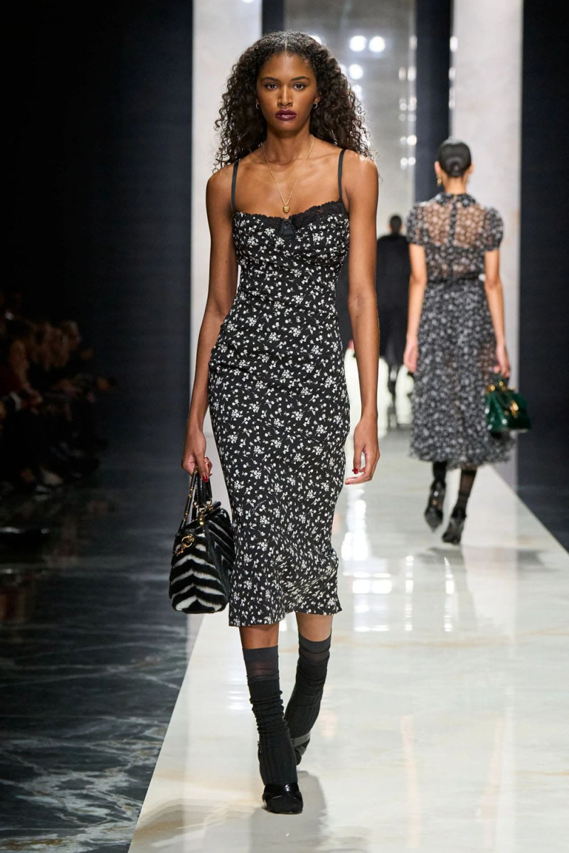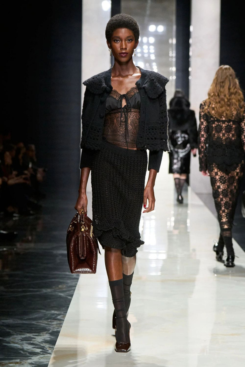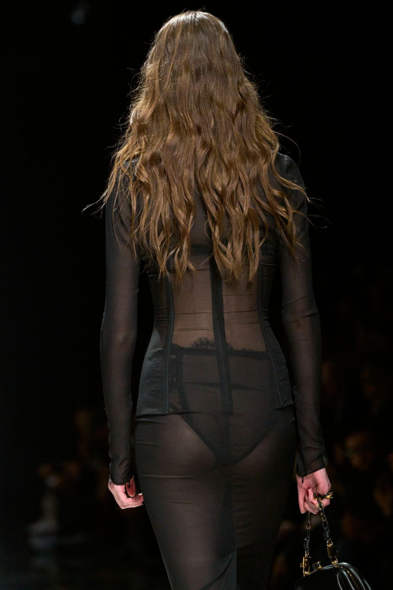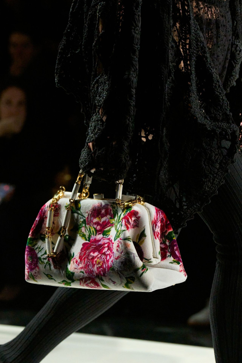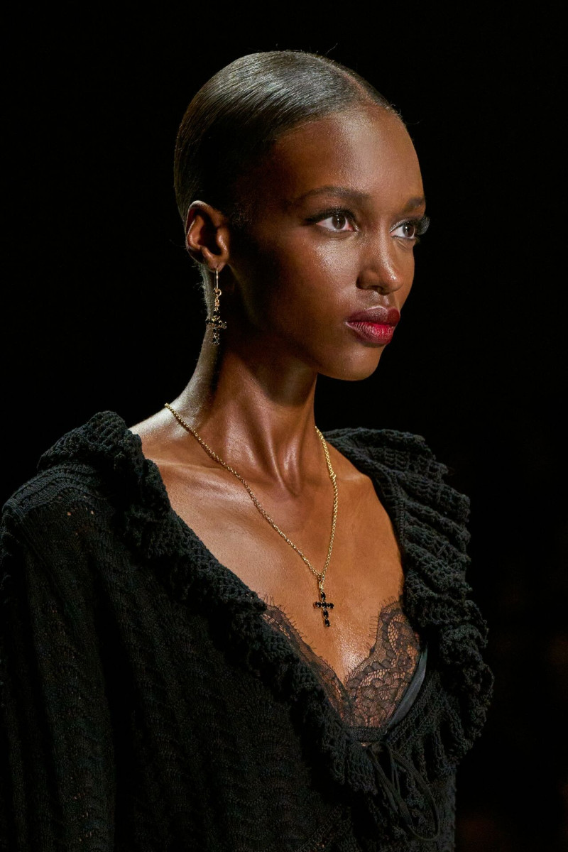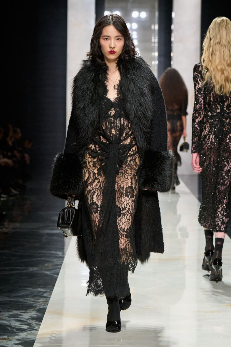 Затем следуют полупрозрачные платья, расшитые черным кружевом, отсылающие как к религиозной иконографии, так и к ночной соблазнительности. Эти образы несут в себе историческую память, но никогда не кажутся театральными. Они обнажают тело, сохраняя при этом его загадочность. Скульптурное черное платье с высоким воротником подчеркивает выразительность образа. Длинные рукава, аккуратные вытачки и скрытые разрезы создают почти монашеский силуэт, который нарушает лишь темно-красная лакированная сумка. Это напряжение между сдержанностью и искушением – квинтэссенция стиля Dolce & Gabbana.