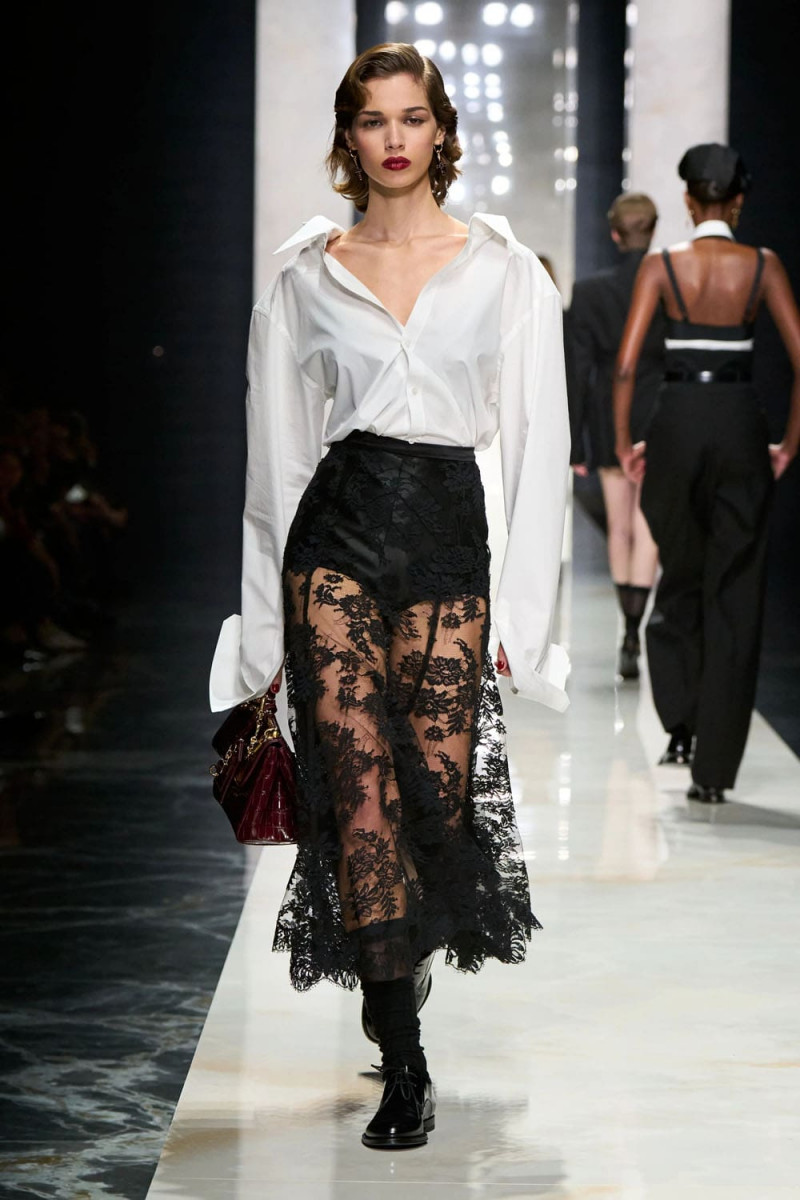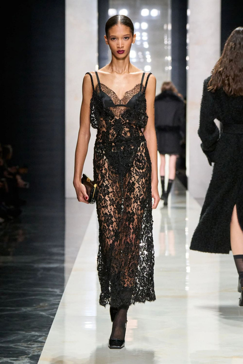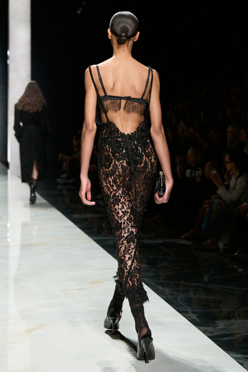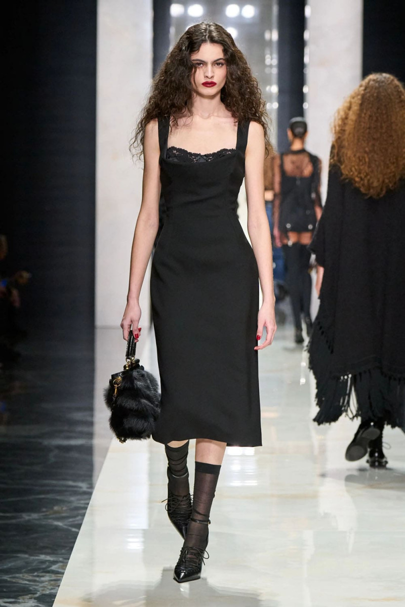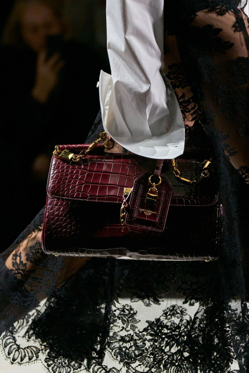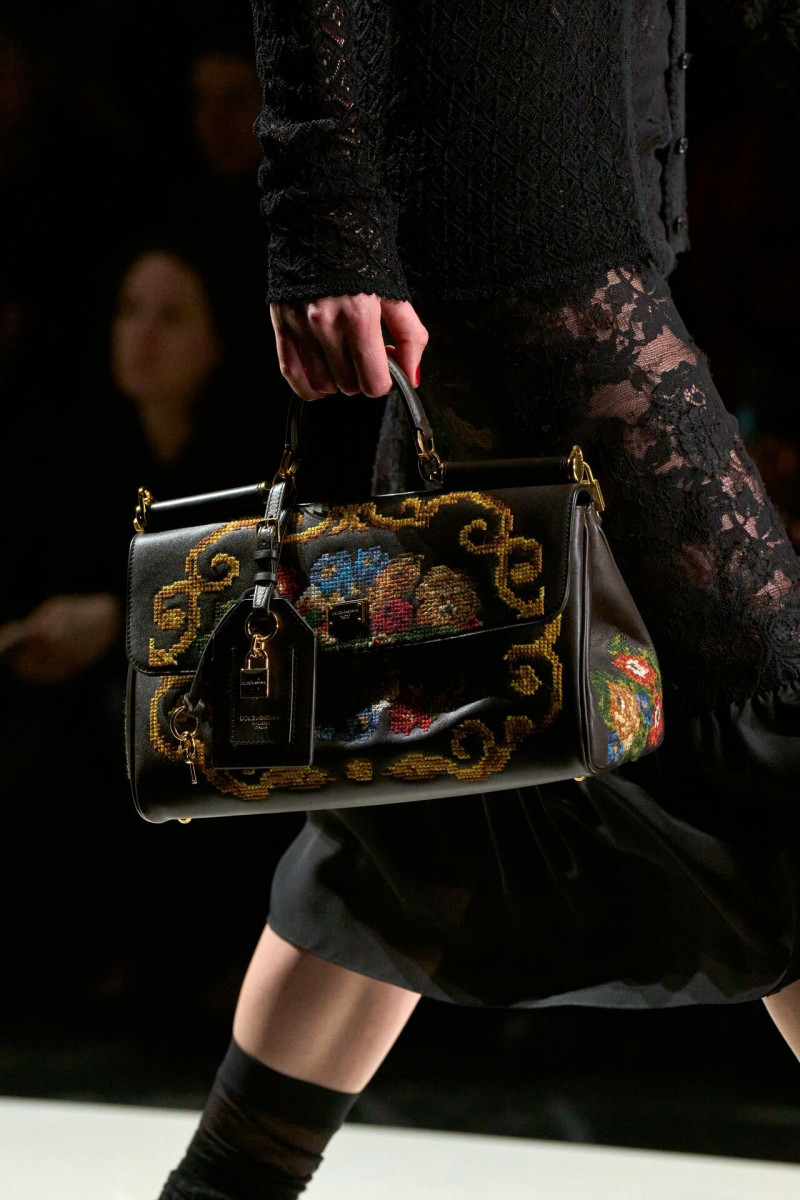 Затем следуют полупрозрачные платья, расшитые черным кружевом, отсылающие как к религиозной иконографии, так и к ночной соблазнительности. Эти образы несут в себе историческую память, но никогда не кажутся театральными. Они обнажают тело, сохраняя при этом его загадочность. Скульптурное черное платье с высоким воротником подчеркивает выразительность образа. Длинные рукава, аккуратные вытачки и скрытые разрезы создают почти монашеский силуэт, который нарушает лишь темно-красная лакированная сумка. Это напряжение между сдержанностью и искушением – квинтэссенция стиля Dolce & Gabbana.