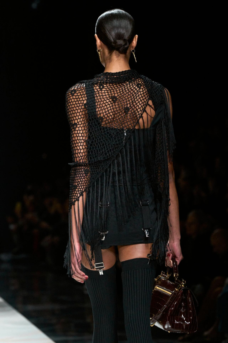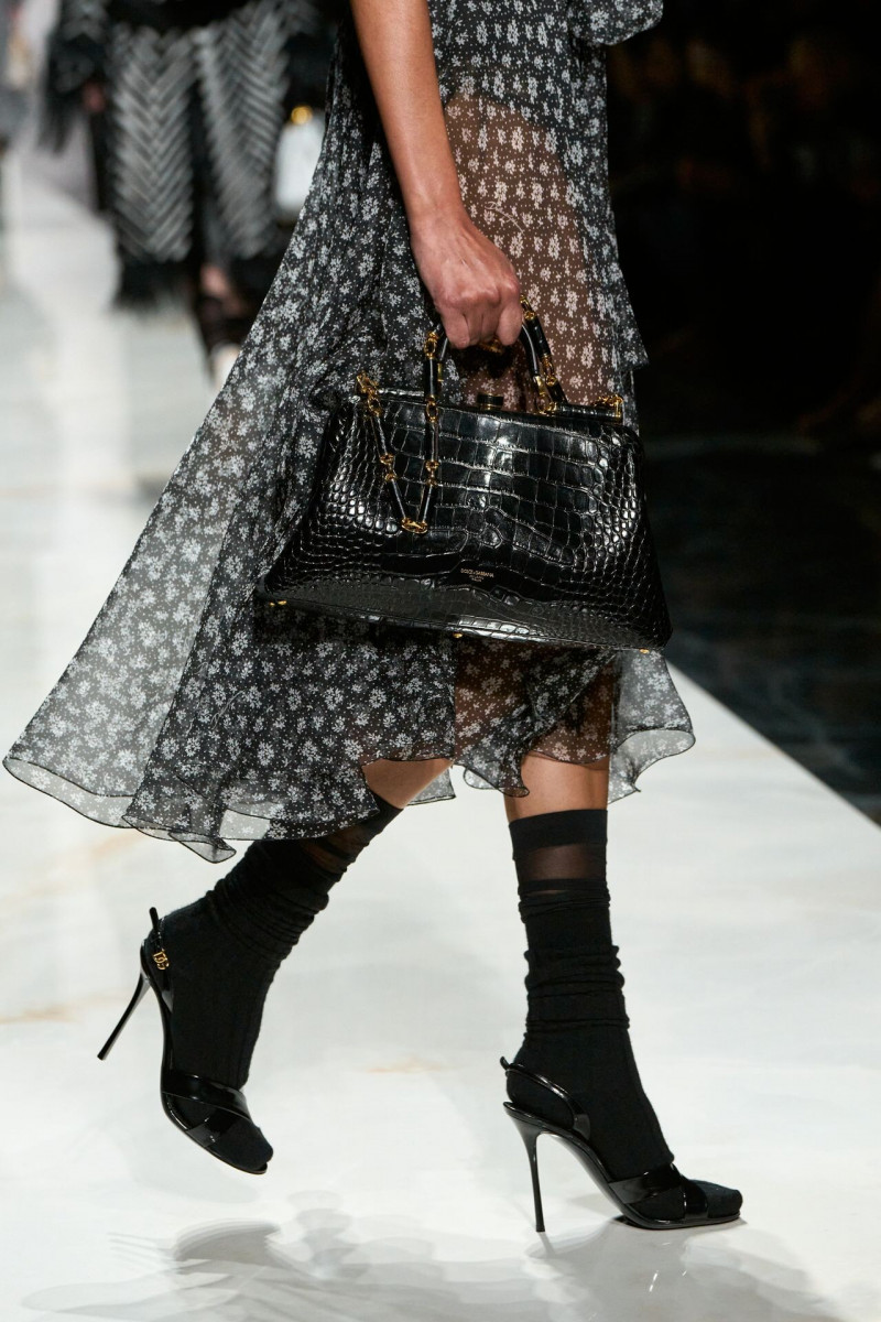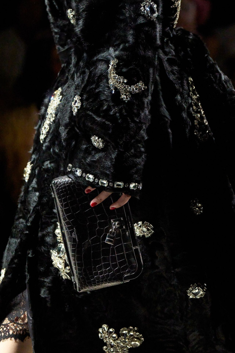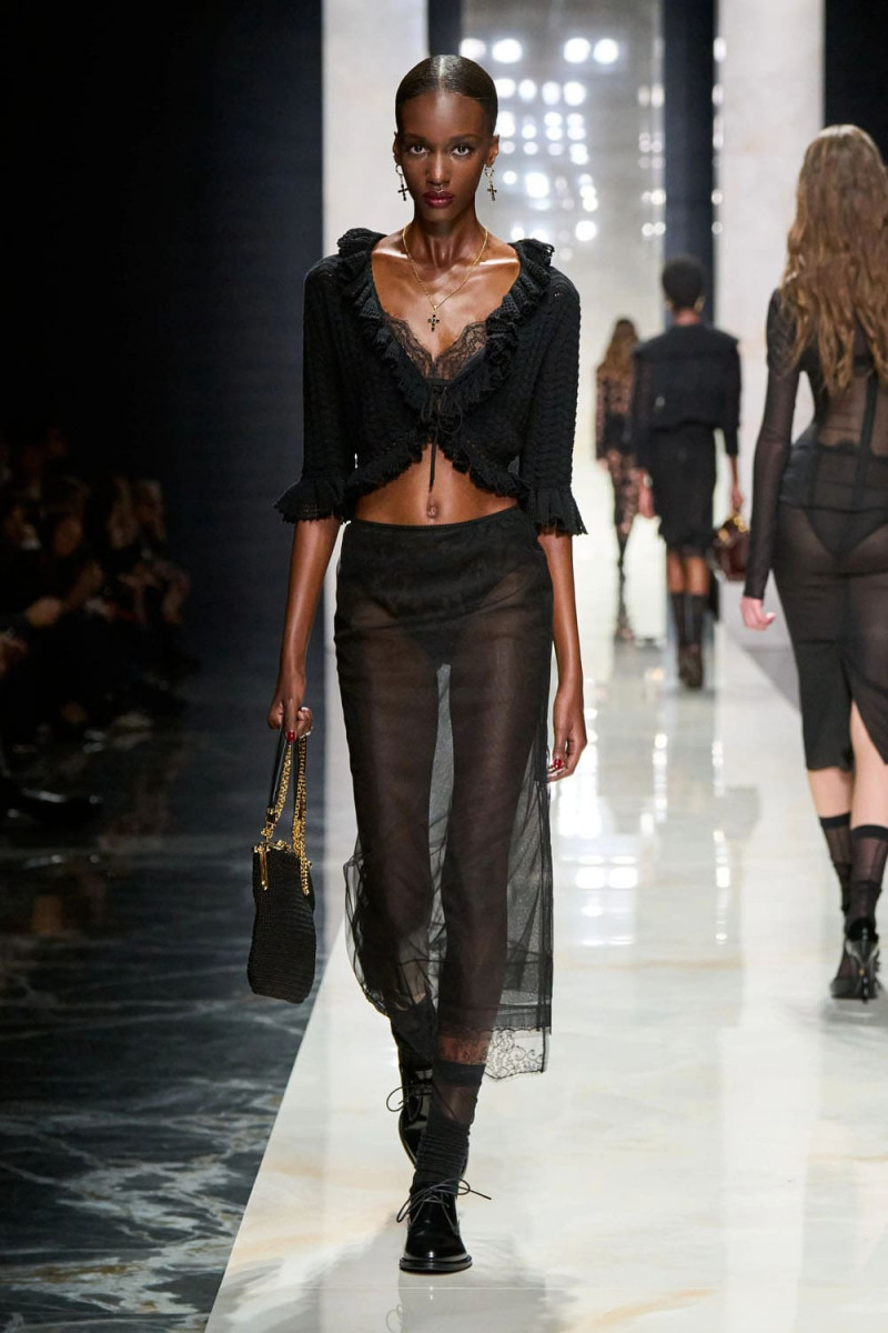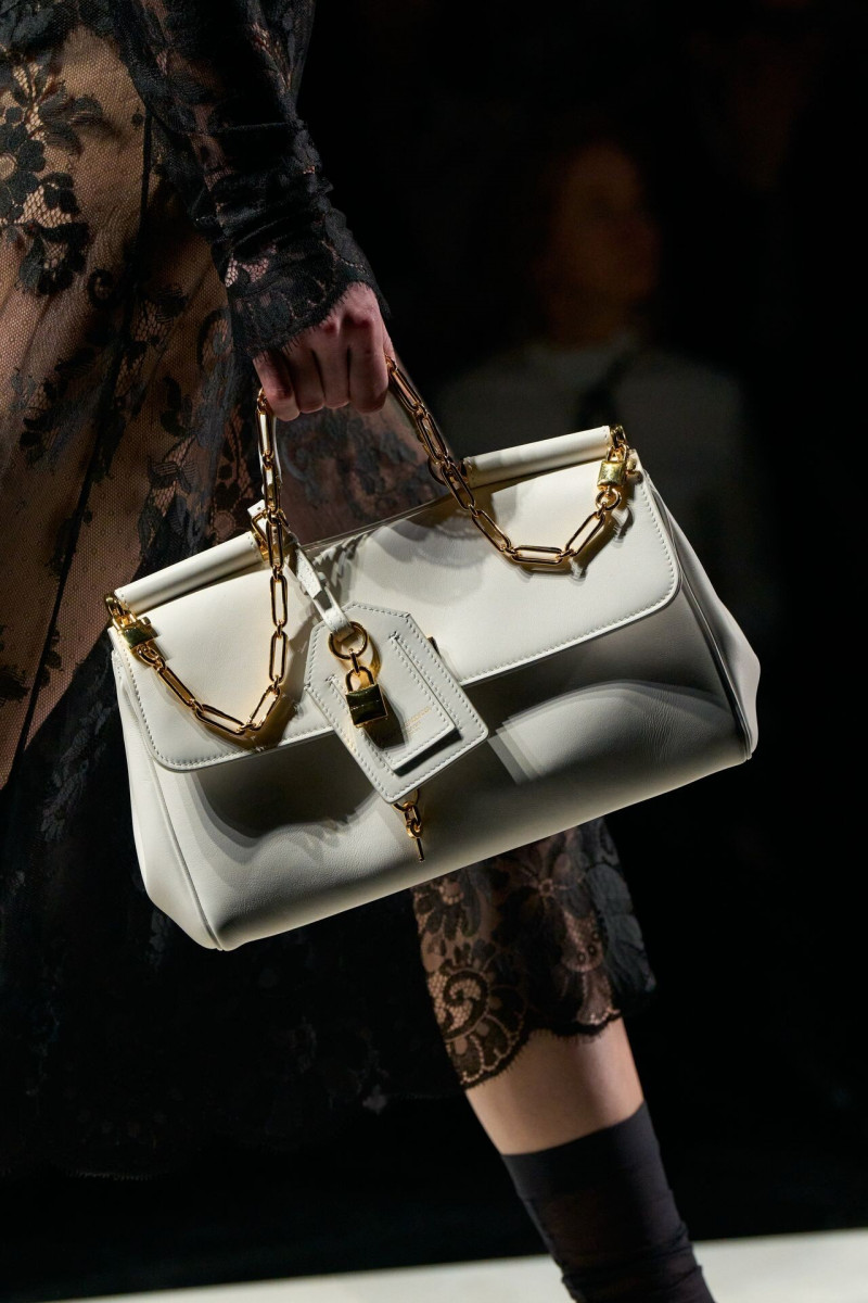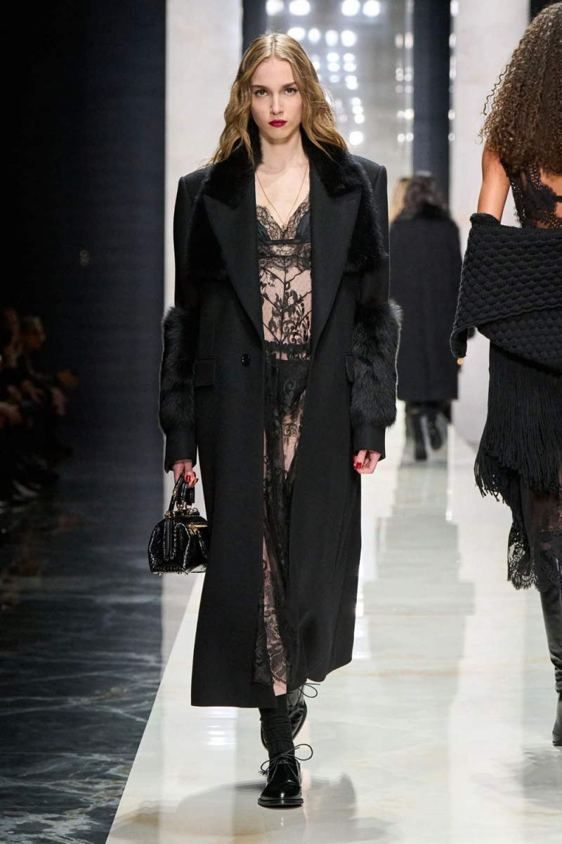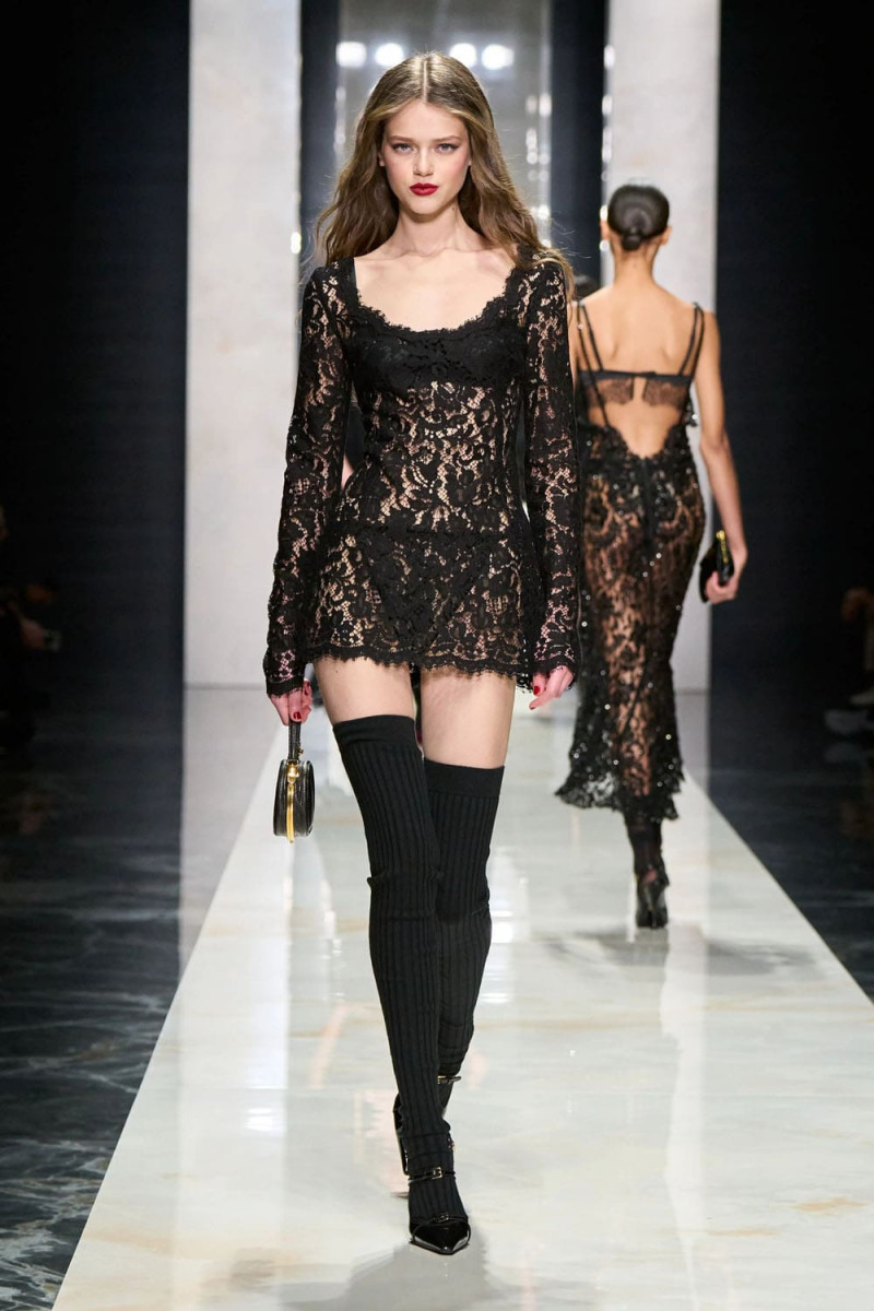 Затем следуют полупрозрачные платья, расшитые черным кружевом, отсылающие как к религиозной иконографии, так и к ночной соблазнительности. Эти образы несут в себе историческую память, но никогда не кажутся театральными. Они обнажают тело, сохраняя при этом его загадочность. Скульптурное черное платье с высоким воротником подчеркивает выразительность образа. Длинные рукава, аккуратные вытачки и скрытые разрезы создают почти монашеский силуэт, который нарушает лишь темно-красная лакированная сумка. Это напряжение между сдержанностью и искушением – квинтэссенция стиля Dolce & Gabbana.