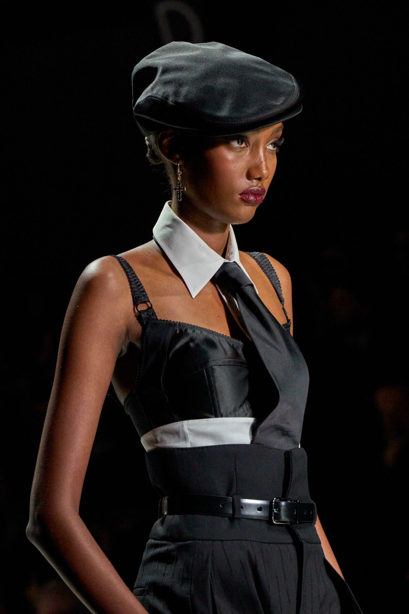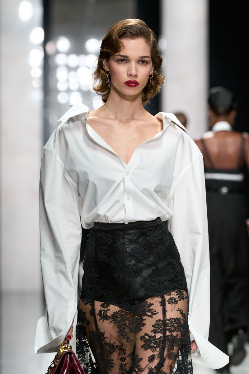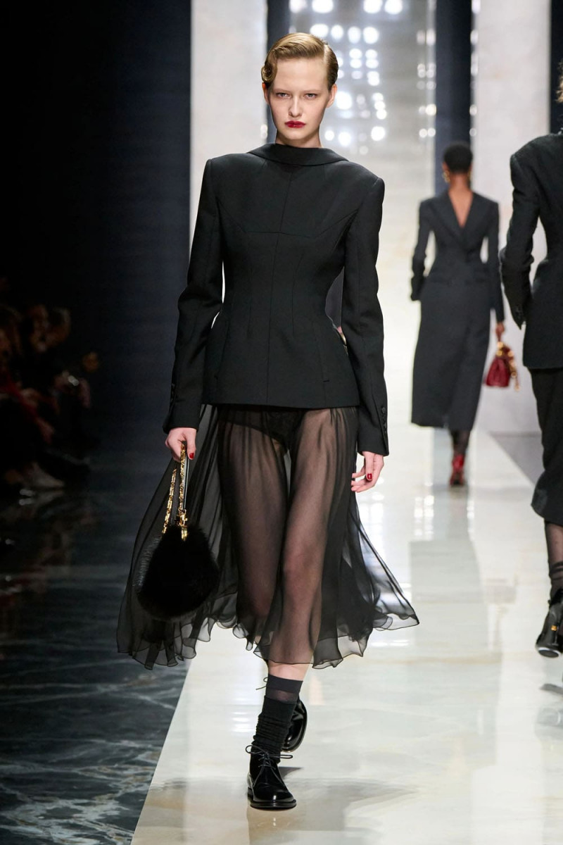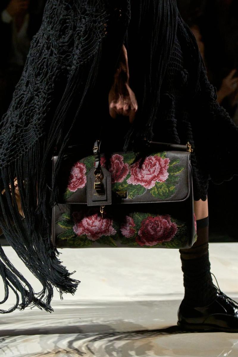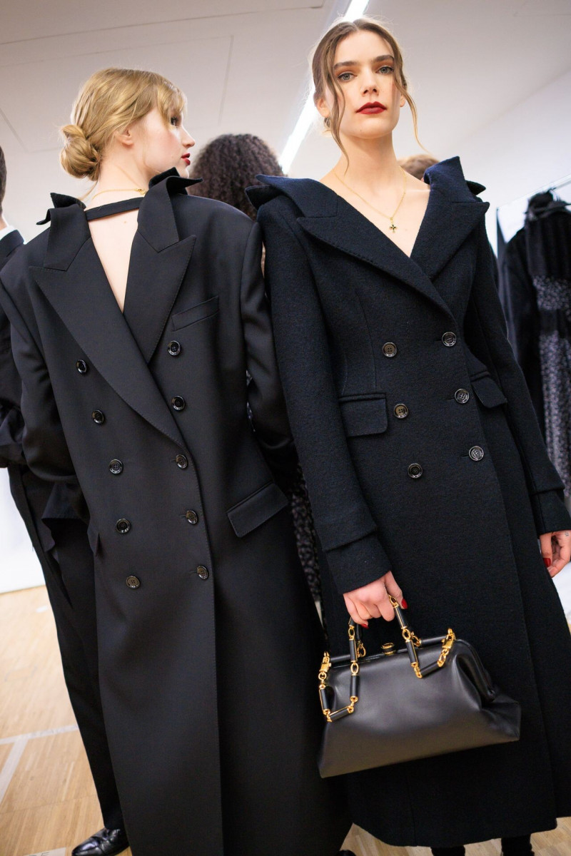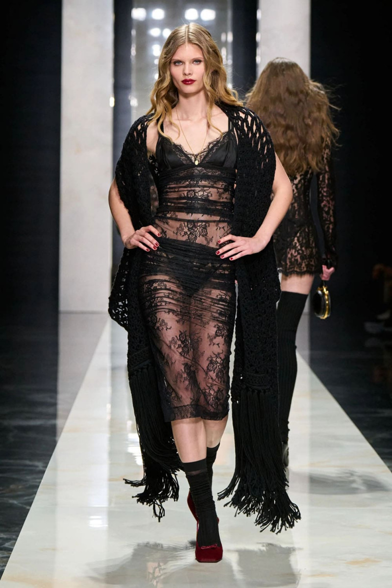 Затем следуют полупрозрачные платья, расшитые черным кружевом, отсылающие как к религиозной иконографии, так и к ночной соблазнительности. Эти образы несут в себе историческую память, но никогда не кажутся театральными. Они обнажают тело, сохраняя при этом его загадочность. Скульптурное черное платье с высоким воротником подчеркивает выразительность образа. Длинные рукава, аккуратные вытачки и скрытые разрезы создают почти монашеский силуэт, который нарушает лишь темно-красная лакированная сумка. Это напряжение между сдержанностью и искушением – квинтэссенция стиля Dolce & Gabbana.