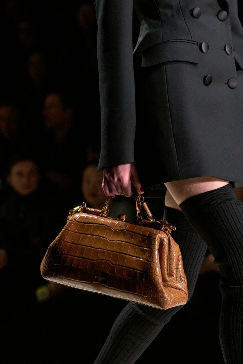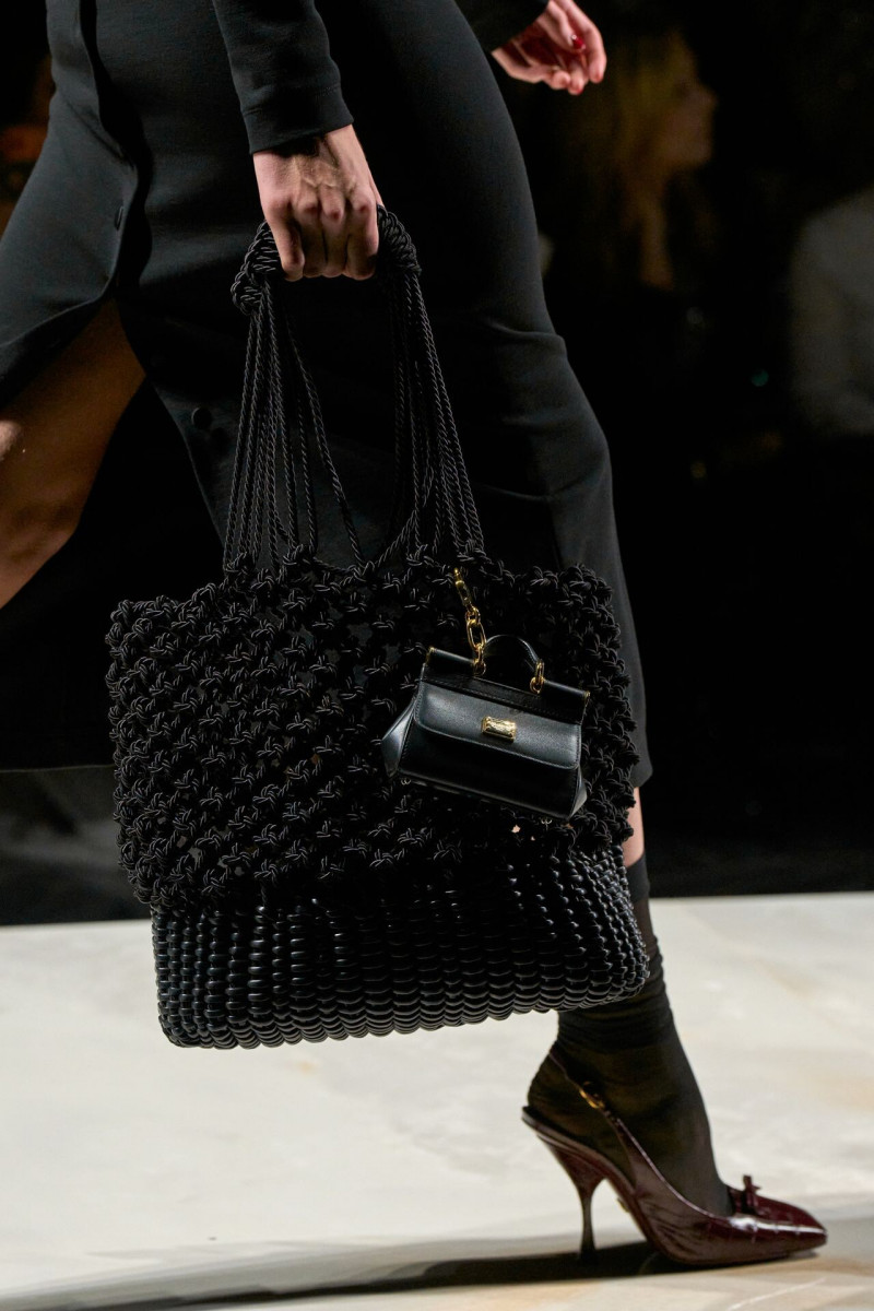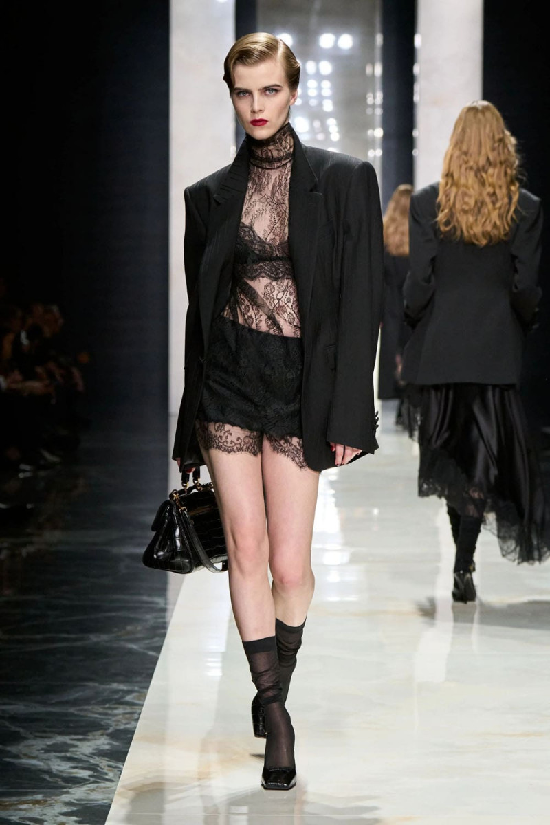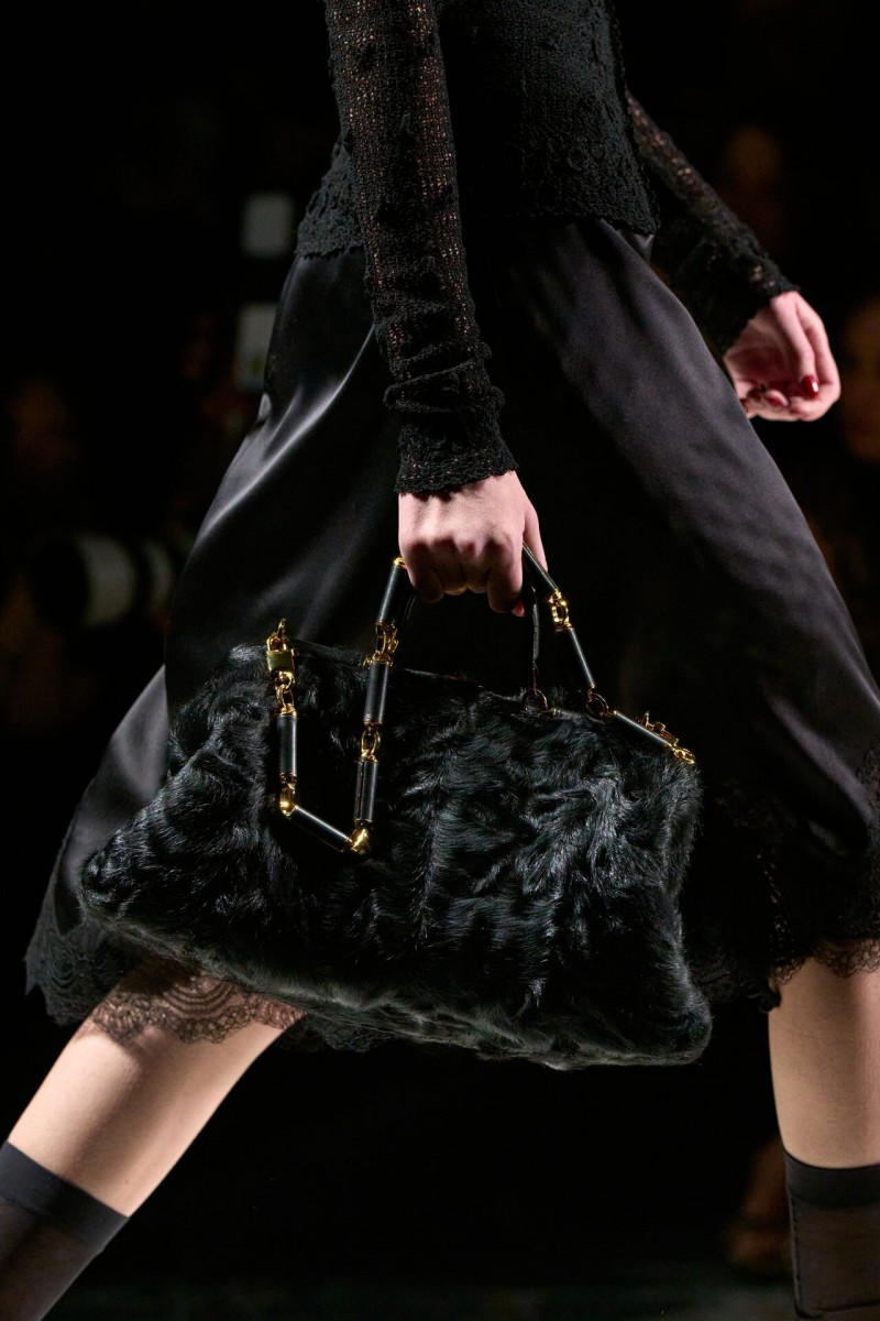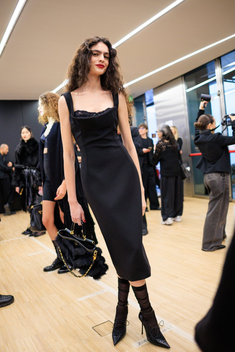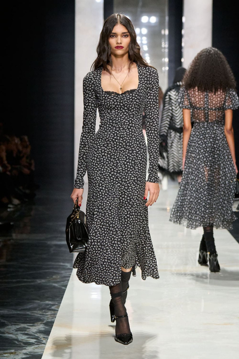 Затем следуют полупрозрачные платья, расшитые черным кружевом, отсылающие как к религиозной иконографии, так и к ночной соблазнительности. Эти образы несут в себе историческую память, но никогда не кажутся театральными. Они обнажают тело, сохраняя при этом его загадочность. Скульптурное черное платье с высоким воротником подчеркивает выразительность образа. Длинные рукава, аккуратные вытачки и скрытые разрезы создают почти монашеский силуэт, который нарушает лишь темно-красная лакированная сумка. Это напряжение между сдержанностью и искушением – квинтэссенция стиля Dolce & Gabbana.