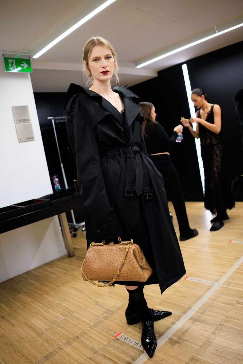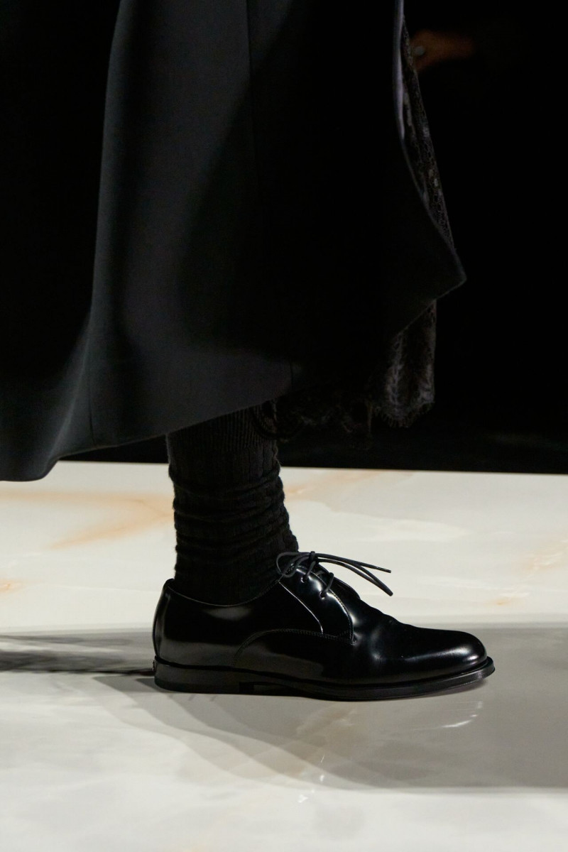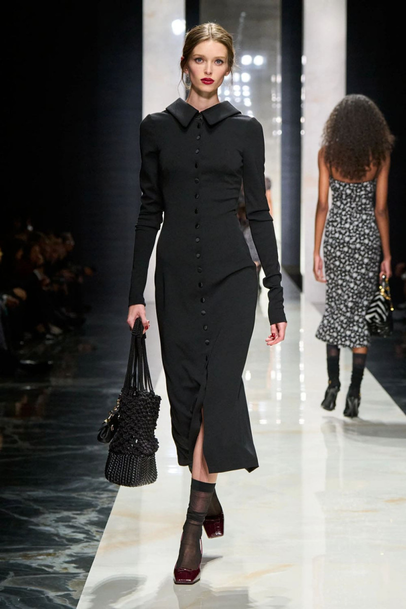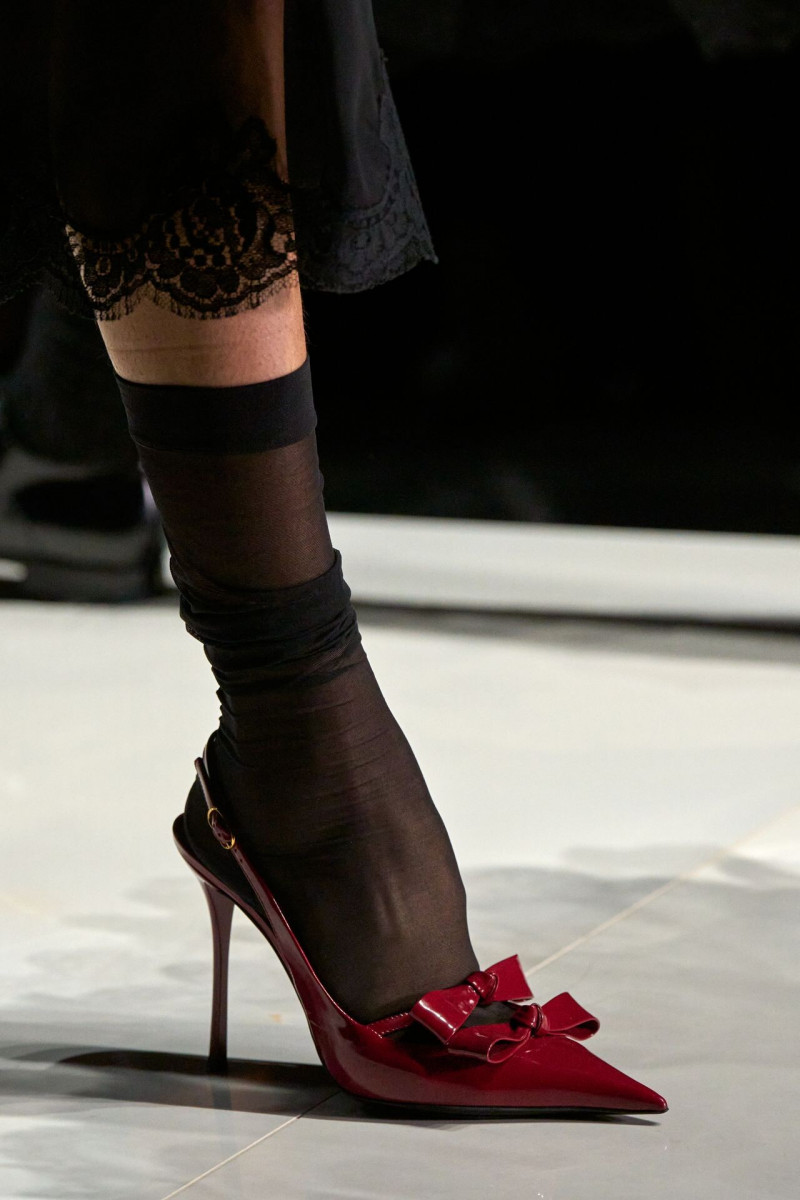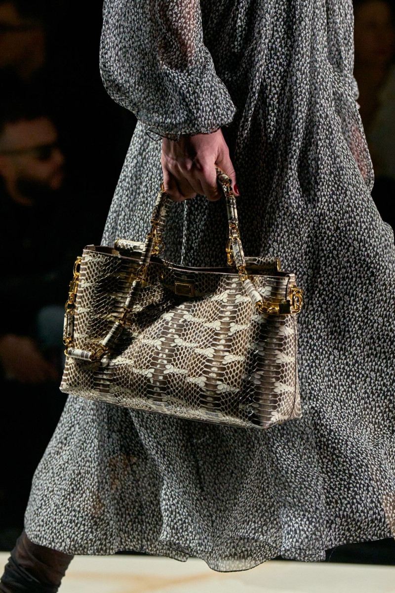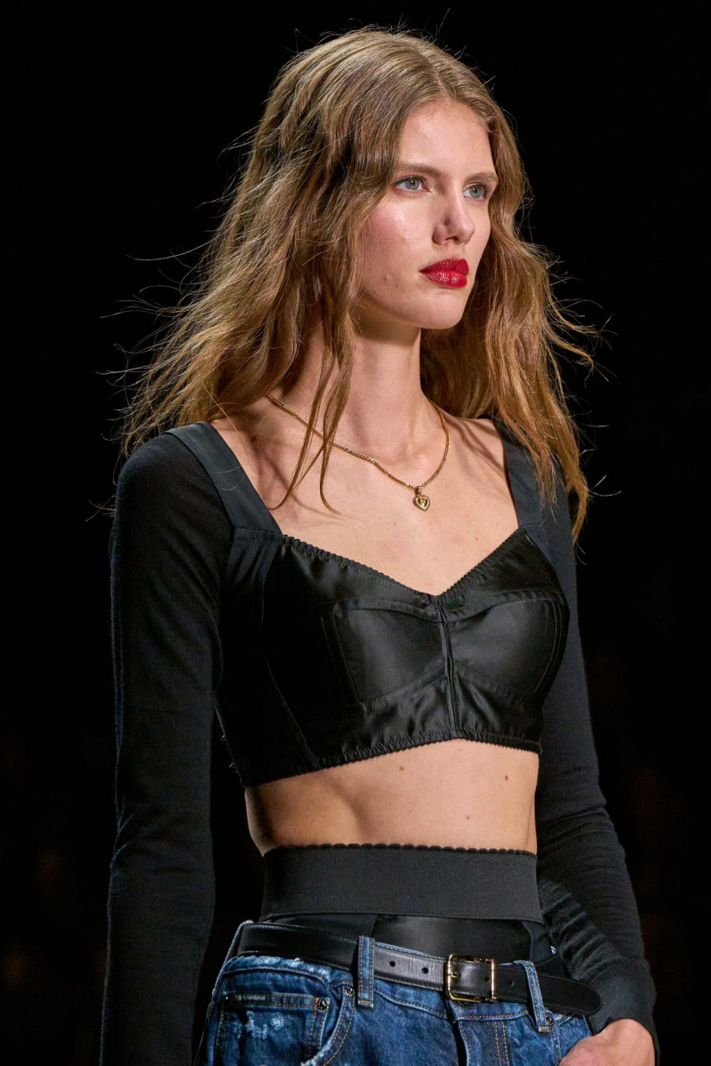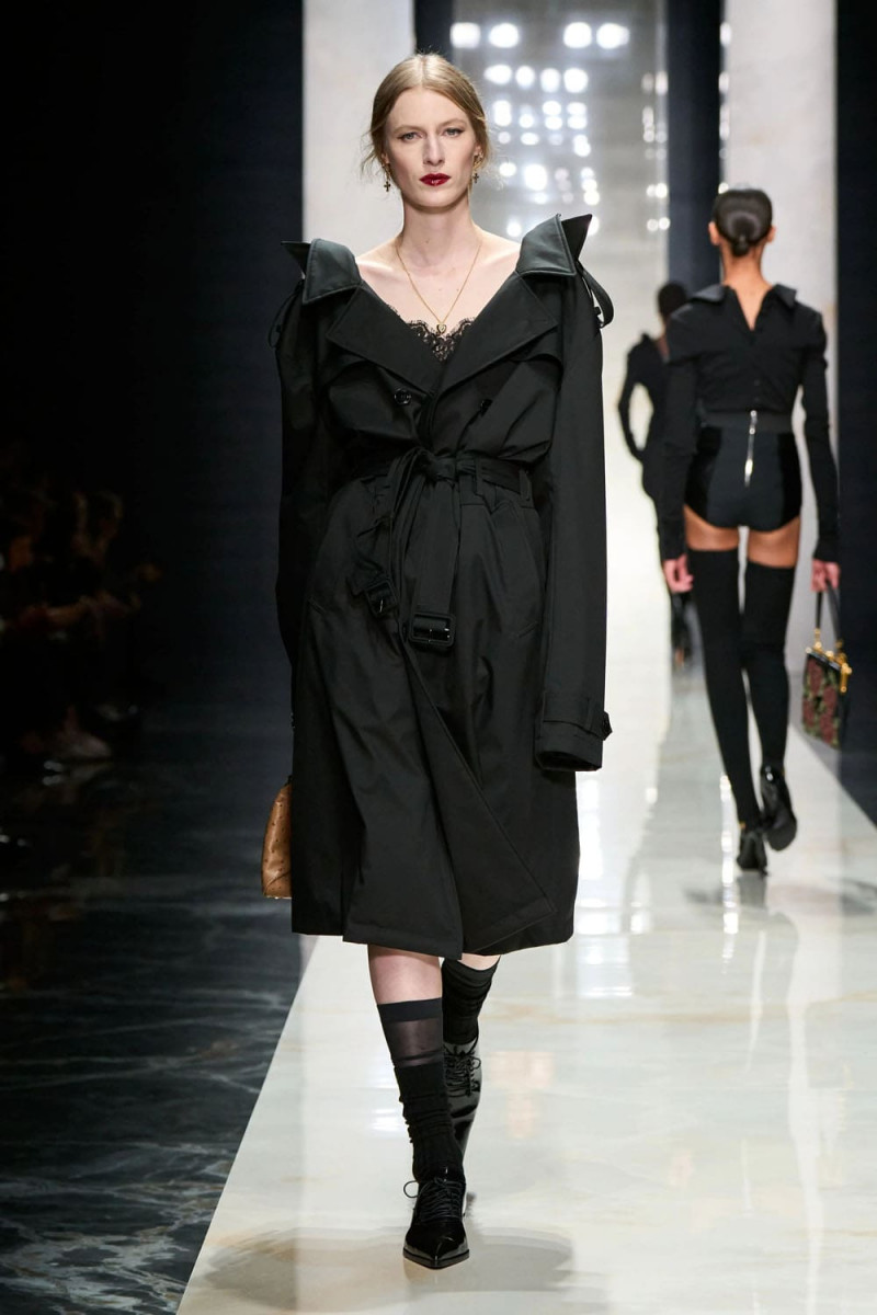 Затем следуют полупрозрачные платья, расшитые черным кружевом, отсылающие как к религиозной иконографии, так и к ночной соблазнительности. Эти образы несут в себе историческую память, но никогда не кажутся театральными. Они обнажают тело, сохраняя при этом его загадочность. Скульптурное черное платье с высоким воротником подчеркивает выразительность образа. Длинные рукава, аккуратные вытачки и скрытые разрезы создают почти монашеский силуэт, который нарушает лишь темно-красная лакированная сумка. Это напряжение между сдержанностью и искушением – квинтэссенция стиля Dolce & Gabbana.