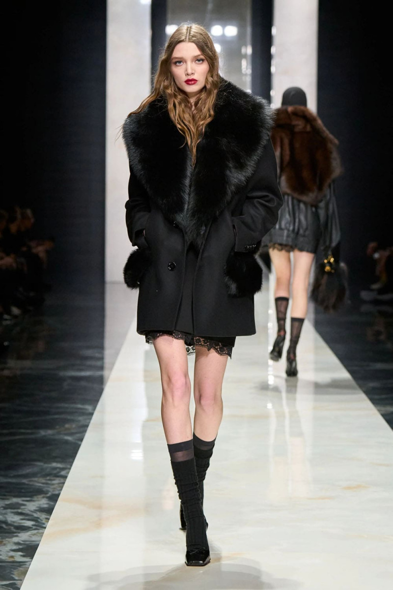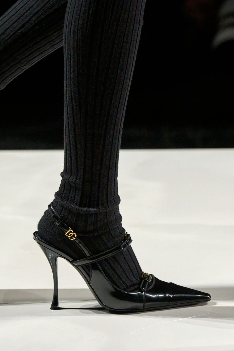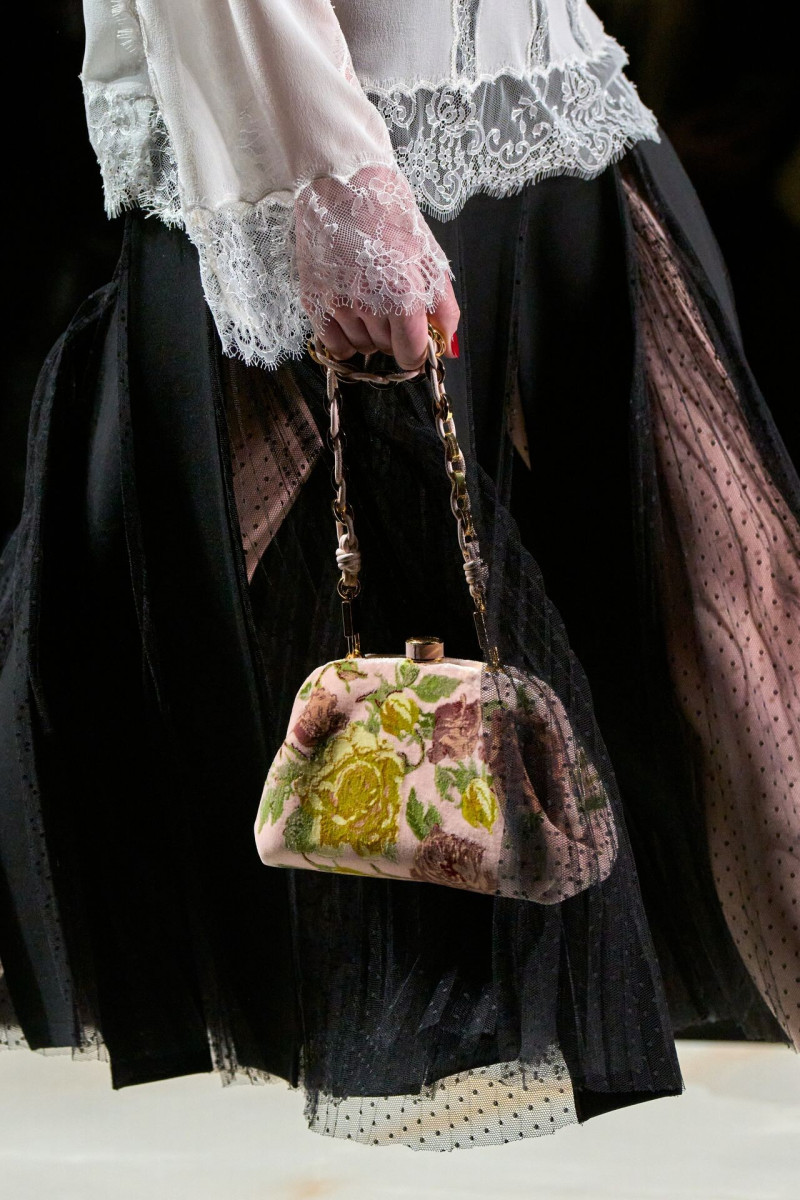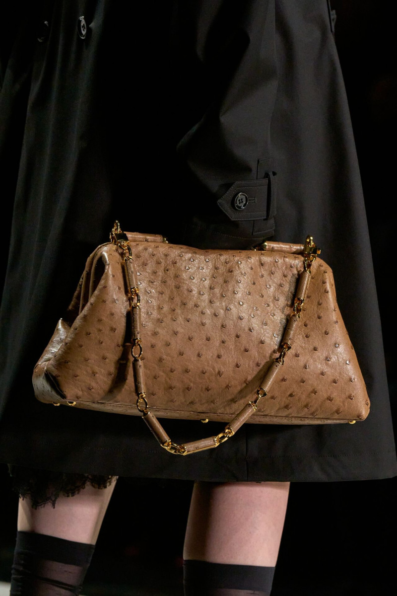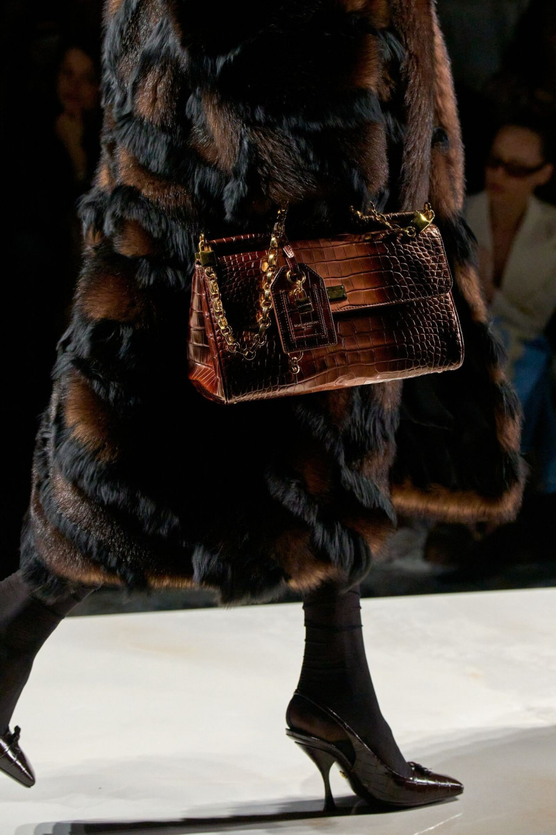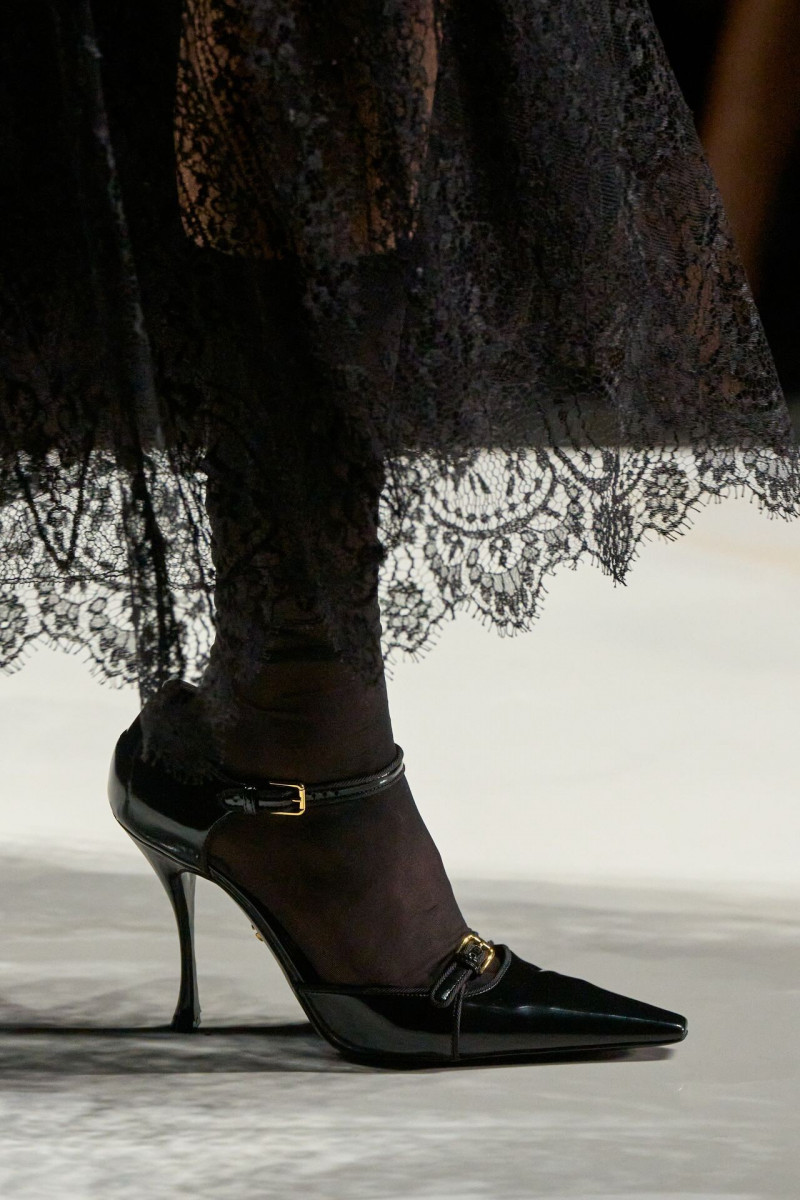 Затем следуют полупрозрачные платья, расшитые черным кружевом, отсылающие как к религиозной иконографии, так и к ночной соблазнительности. Эти образы несут в себе историческую память, но никогда не кажутся театральными. Они обнажают тело, сохраняя при этом его загадочность. Скульптурное черное платье с высоким воротником подчеркивает выразительность образа. Длинные рукава, аккуратные вытачки и скрытые разрезы создают почти монашеский силуэт, который нарушает лишь темно-красная лакированная сумка. Это напряжение между сдержанностью и искушением – квинтэссенция стиля Dolce & Gabbana.