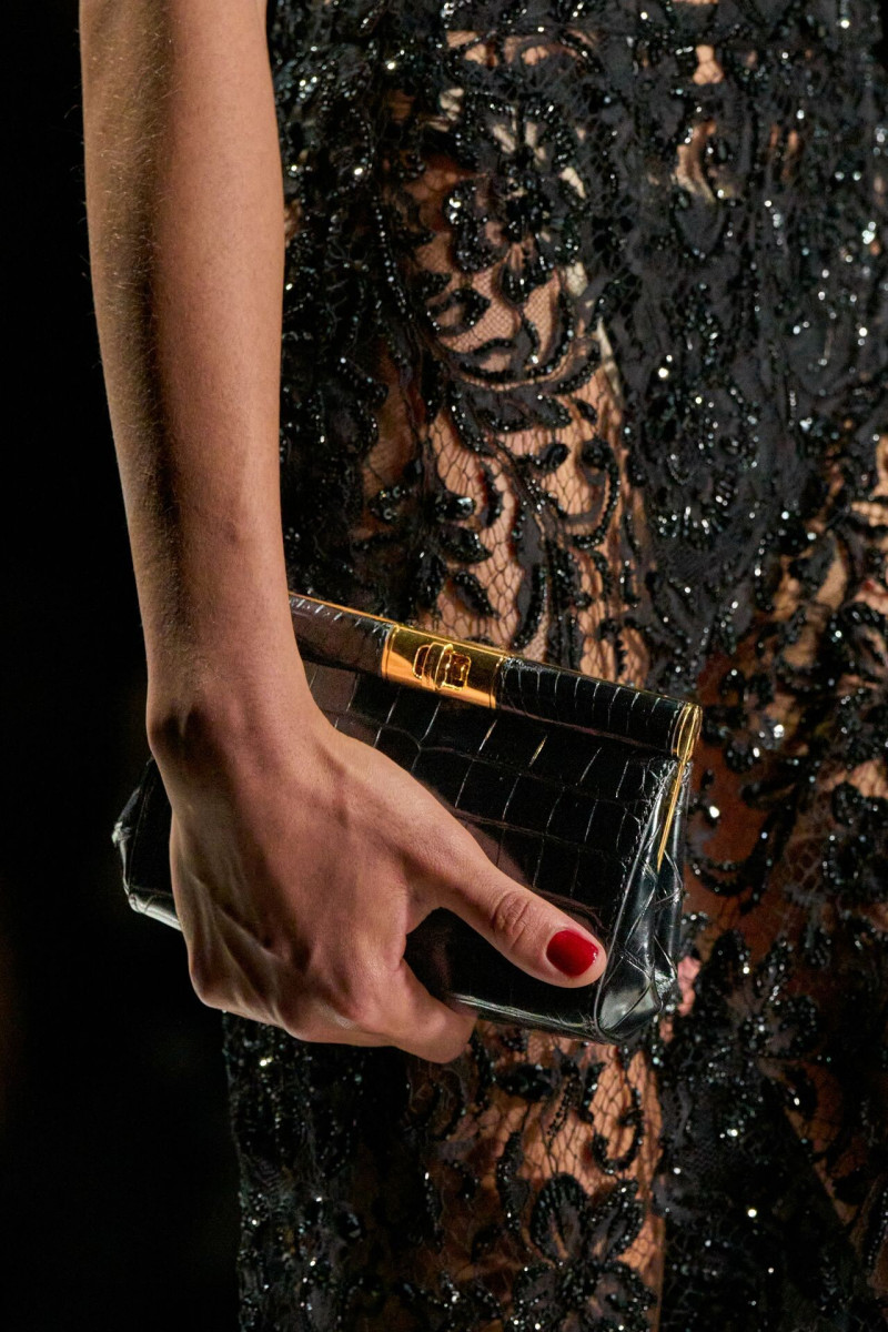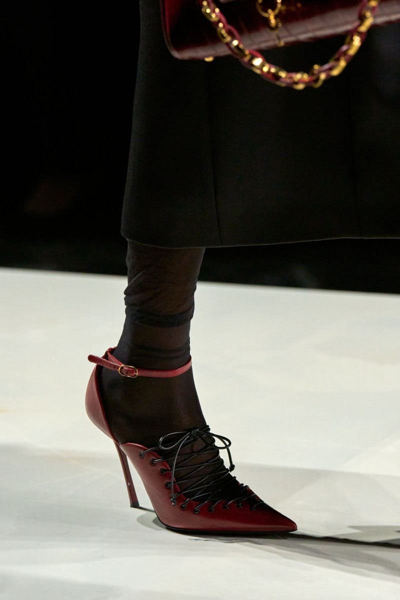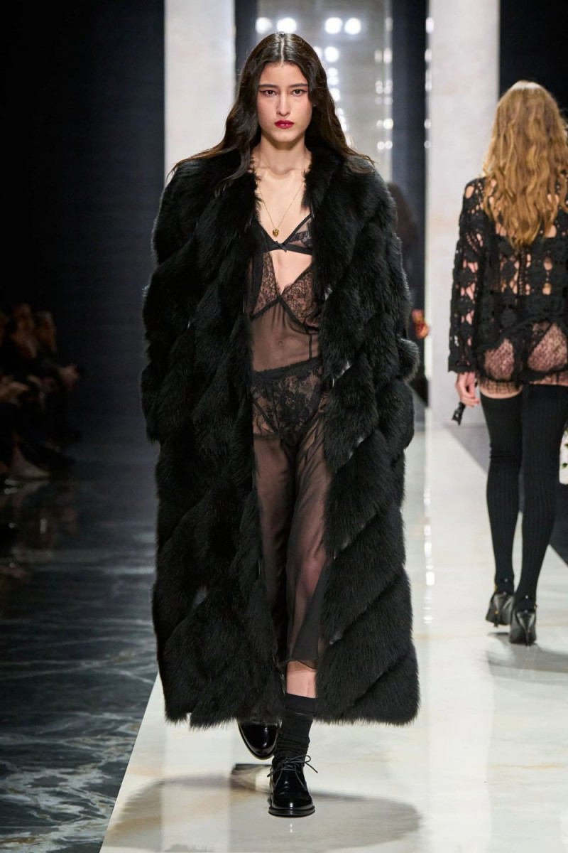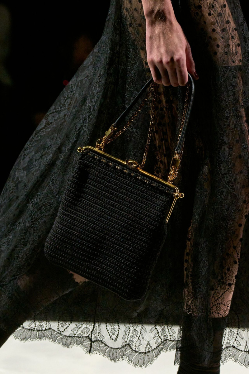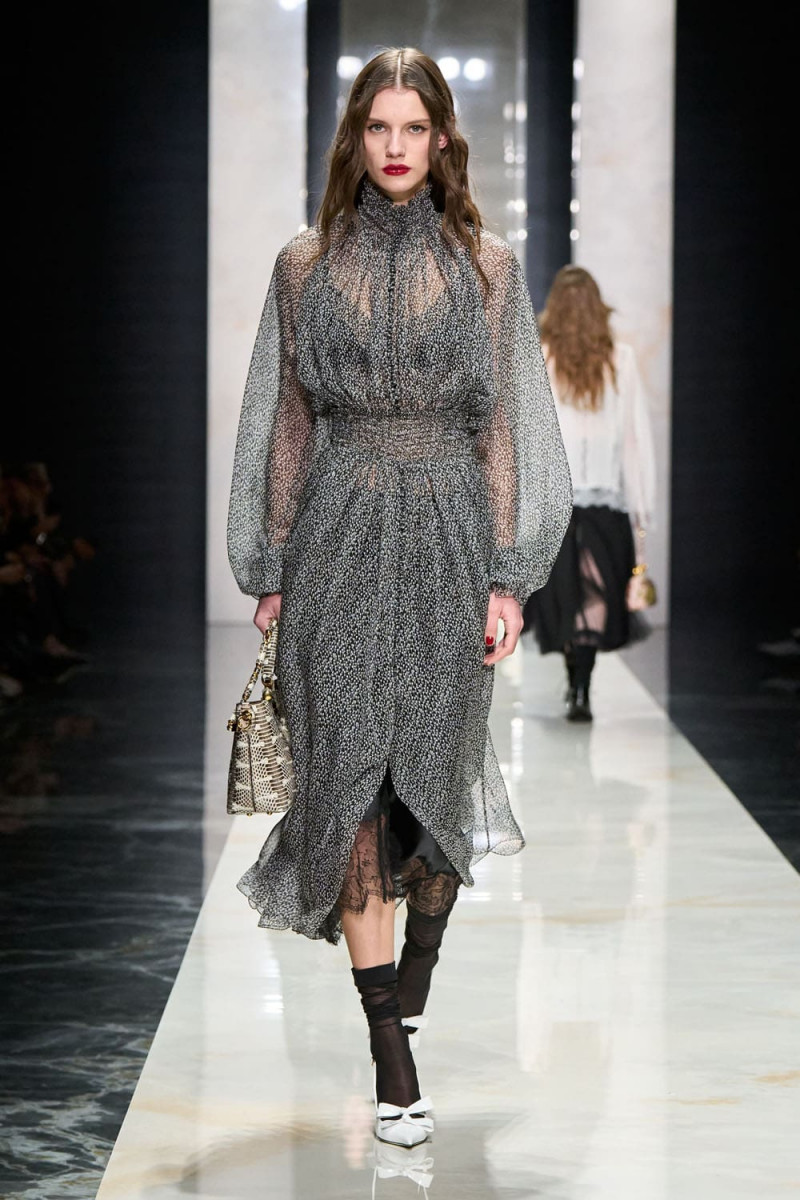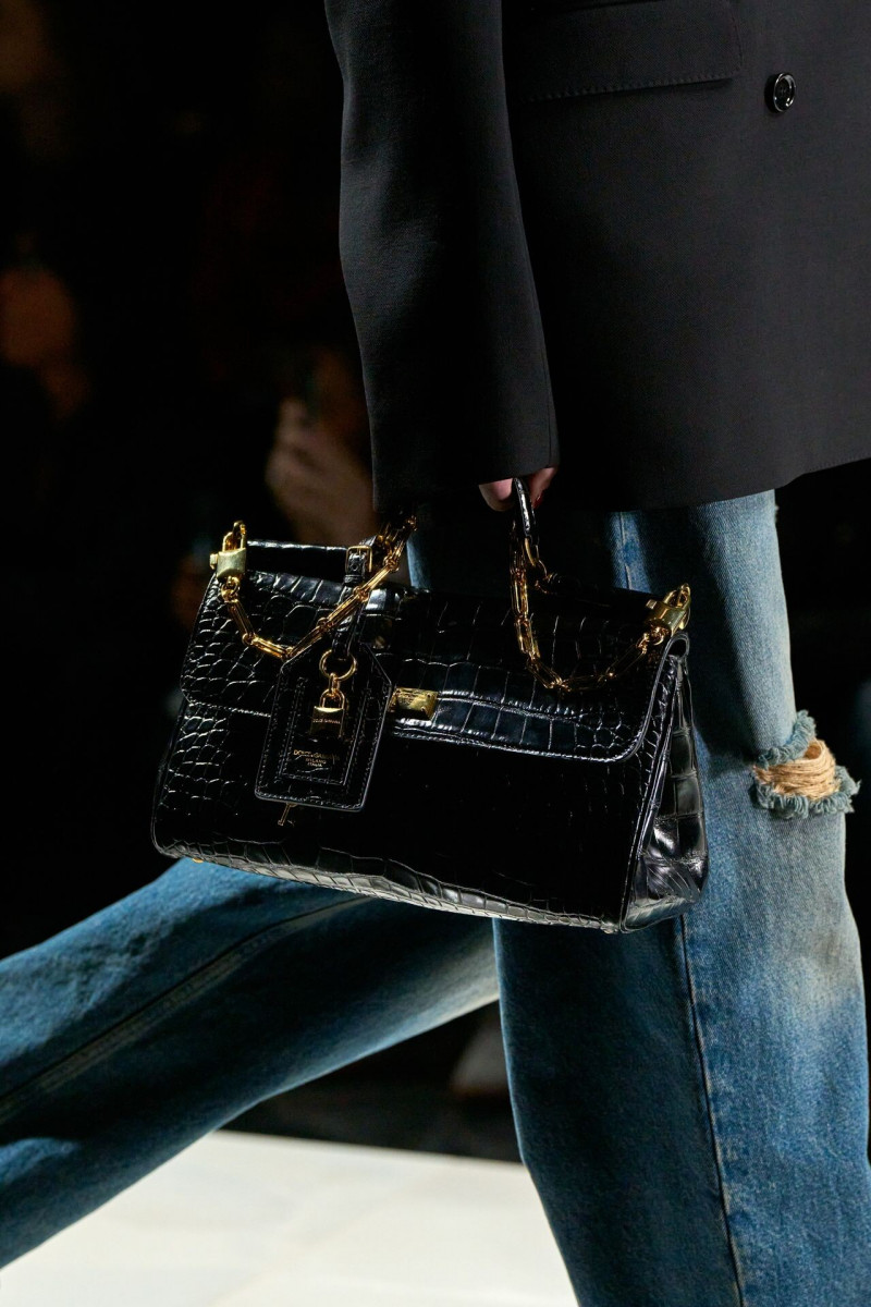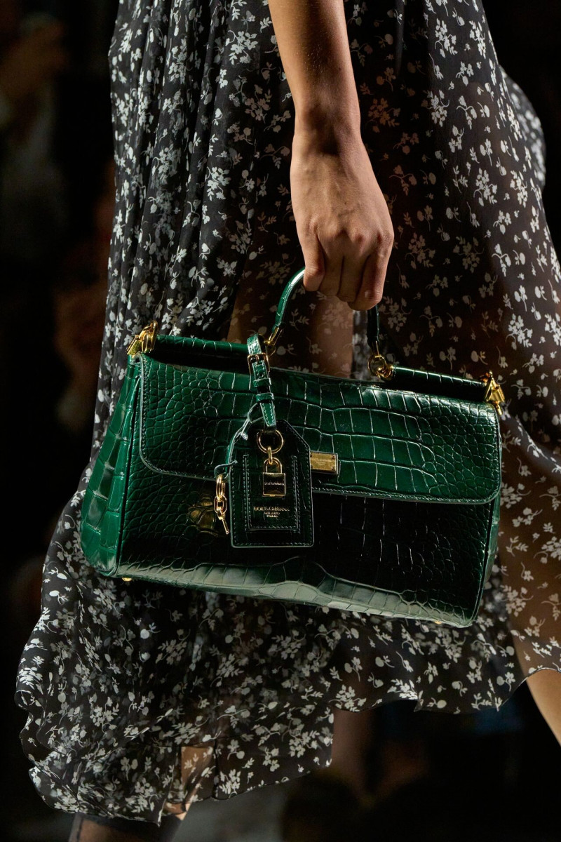 Затем следуют полупрозрачные платья, расшитые черным кружевом, отсылающие как к религиозной иконографии, так и к ночной соблазнительности. Эти образы несут в себе историческую память, но никогда не кажутся театральными. Они обнажают тело, сохраняя при этом его загадочность. Скульптурное черное платье с высоким воротником подчеркивает выразительность образа. Длинные рукава, аккуратные вытачки и скрытые разрезы создают почти монашеский силуэт, который нарушает лишь темно-красная лакированная сумка. Это напряжение между сдержанностью и искушением – квинтэссенция стиля Dolce & Gabbana.